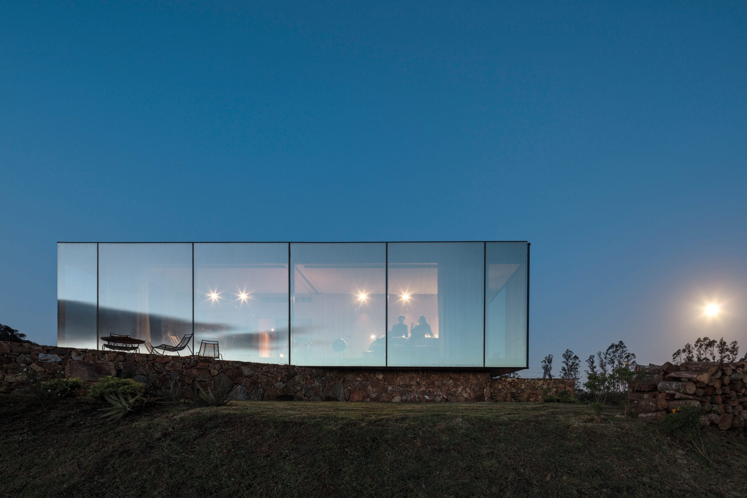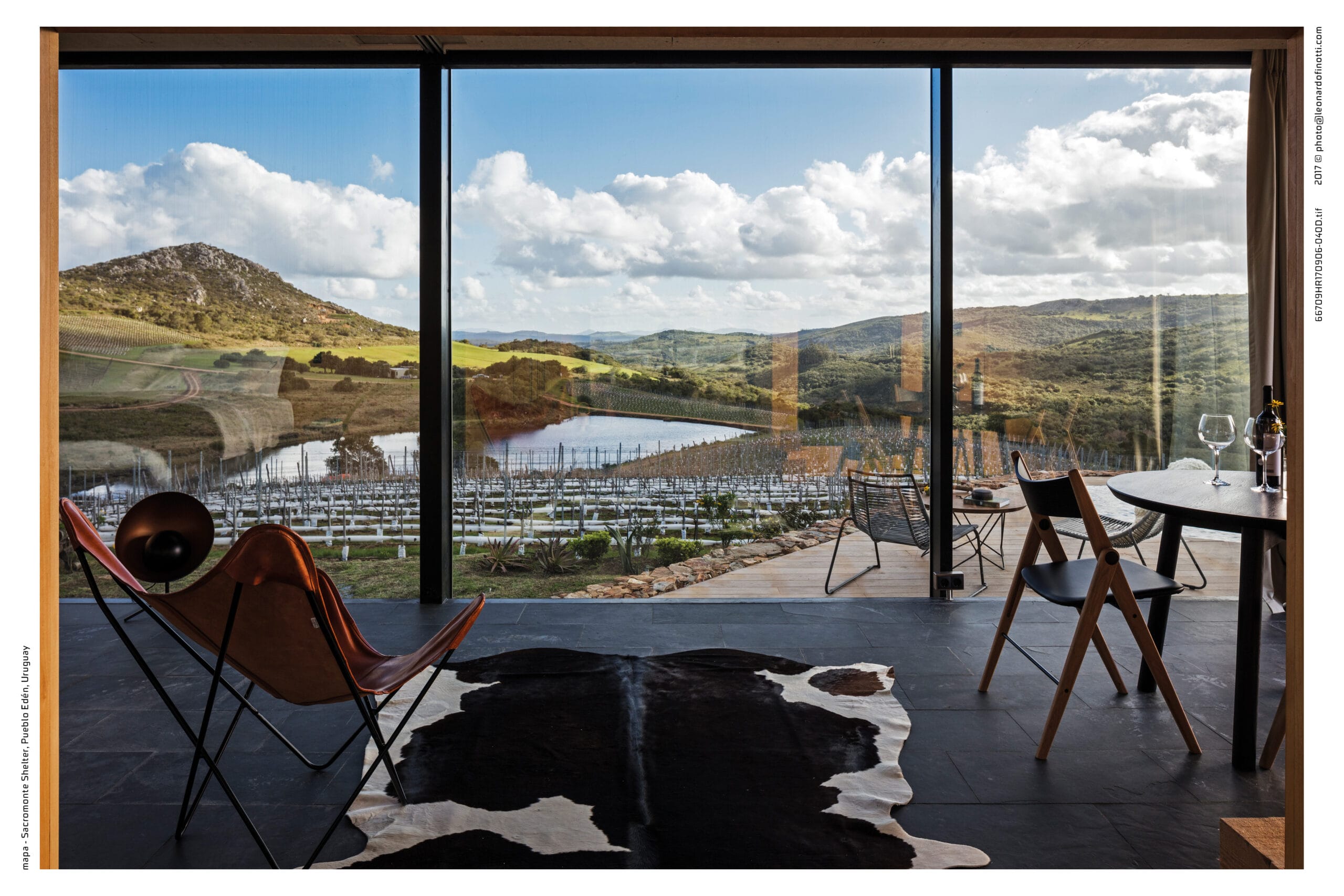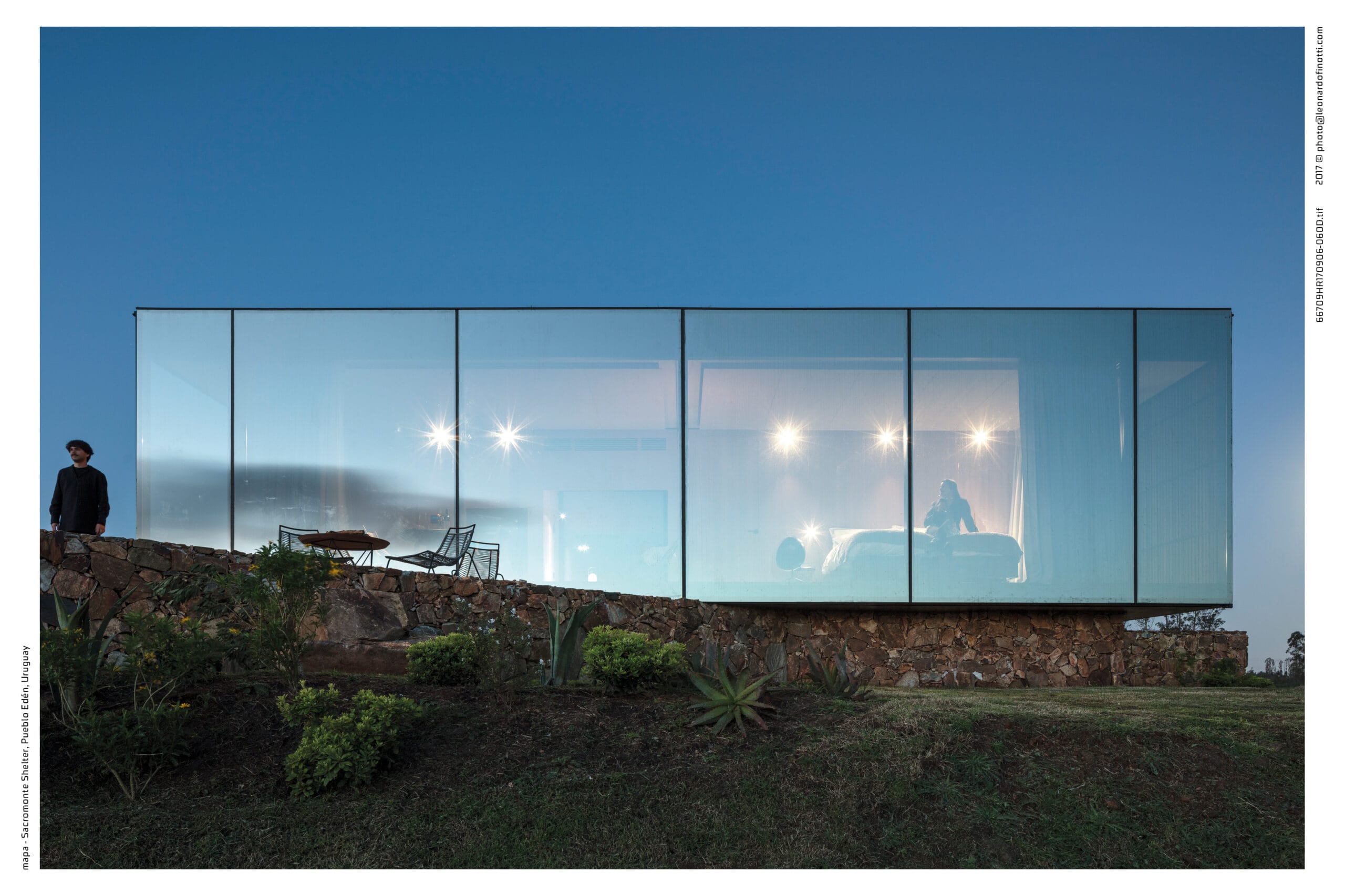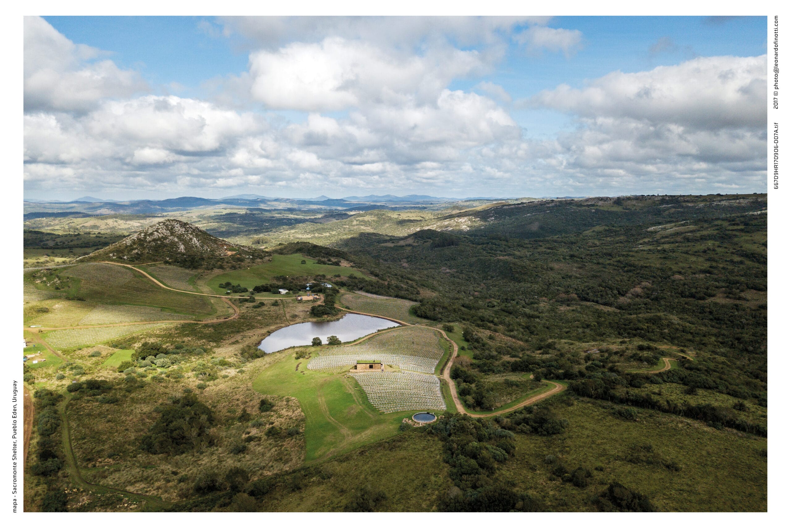 Sacromonte es una invitación a encontrarnos con la naturaleza remota y el mundo de los vinos finos, donde la sofisticación y lo originario conviven en una nueva experiencia de paisaje. Sus tierras ocupan más de 100 hectáreas se enclavan en un emplazamiento privilegiado: las sierras salvajes del este de Uruguay. Equidistante de Punta del Este, José Ignacio y Pueblo Garzón, configura un ecosistema único de disfrute, del que forma parte con espíritu propio. Sacromonte es paisaje. Es un campo de fuerzas relacionales, de antiguas intensidades y nuevos impulsos que coexisten en una nueva entidad inédita. Así, la naturaleza, lo productivo, las infraestructuras, las edificaciones y lo energético configuran un campo de estímulos a descubrir, un campo de experiencias. En este paisaje interactúan jóvenes viñedos que se adaptan a las características de los suelos, un cerro desde el cual entender el paisaje, verdes áreas de pradera, dos reservas de agua natural y varios arroyos que corren por los valles rodeados de densa vegetación autóctona. Es el explorador contemporáneo el encargado de recorrerlos y trazar su propio guion a través de diversos escenarios de los que es co-protagonista junto al paisaje. Las habitaciones de Sacromonte nacen en una fábrica en el área metropolitana de Montevideo. Se trata de un proceso rápido, de menos de 10 semanas, para luego ser transportadas más de 200 km de distancia, en un solo día. Al dejar la ciudad atrás, las habitaciones dejan de serlo, para transformarse en refugios de paisaje, dejan de ser objetos para devenir experiencias. En su estructura metálica modular, que combina steel framing y light steel framing, prima la simpleza constructiva y el uso eficiente de los materiales. Sus terminaciones son simples y contundentes, los materiales son usados según su naturaleza. En contraste, los muros que reciben los módulos prefabricados son construidos en simultáneo en el lugar con piedras locales que toman diversas formas orgánicas y se adaptan para posibilitar cada implantación. Se completan con piscinas circulares que integran una nueva experiencia sensorial del paisaje. De diferentes espesores entre los que se desarrolla la vida. El plano posterior se compone de un apilamiento de troncos de madera que rememora a los apilamientos de leña propios de la vida en la naturaleza. La siguiente capa alberga las áreas húmedas de baño y cocina, una estufa a leña y un hueco profundo ideal para leer un libro o dormir una siesta cobijado en el paisaje. Separado por un plano de madera, sigue el espacio principal de dormitorio, living y comedor, que se abre completamente al paisaje al que enfrenta, siendo parte de él. El plano frontal se conforma con un plano de vidrio espejado que cubre de un efecto casi mágico al refugio, posicionándolo en un tenso límite: entre el camuflaje y el tiempo de la naturaleza y el brillo irreal de lo tecnológico y del hoy.