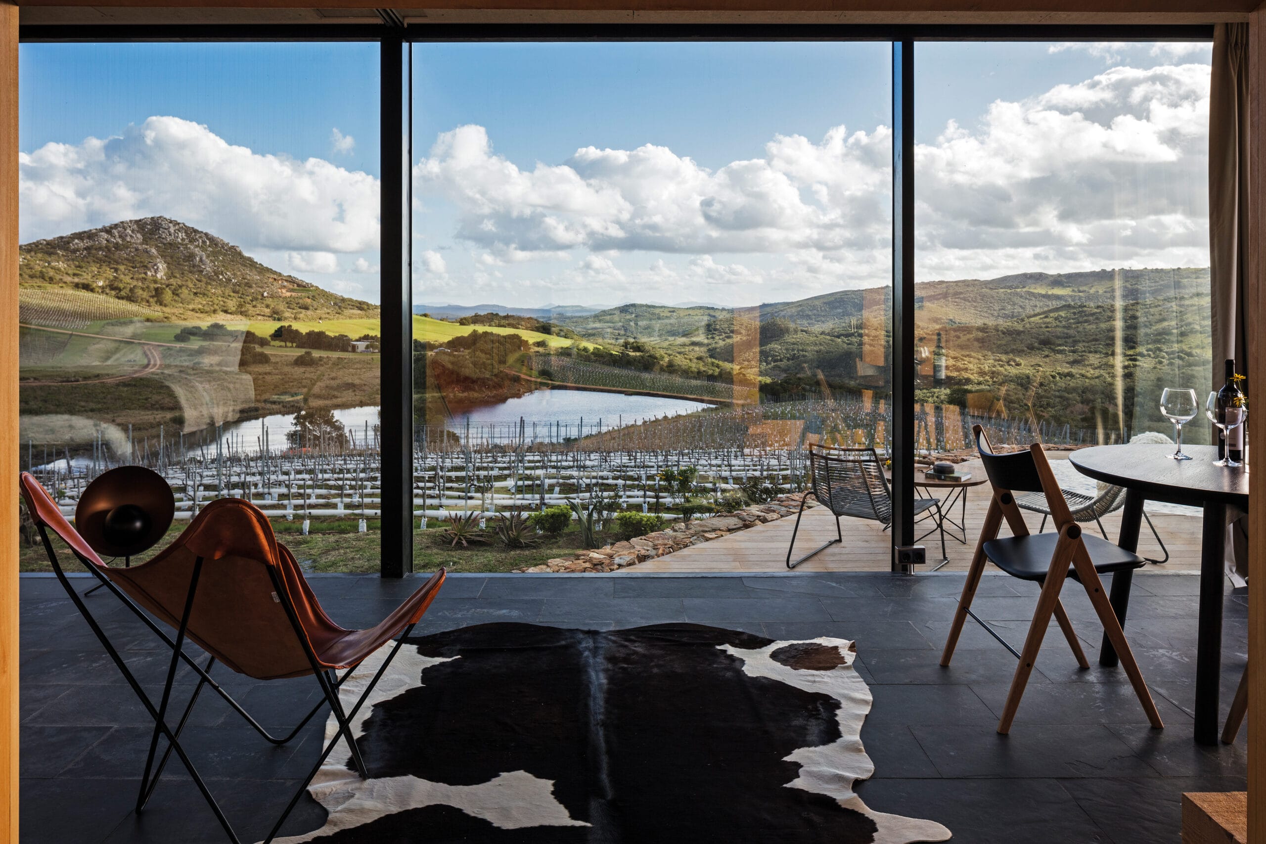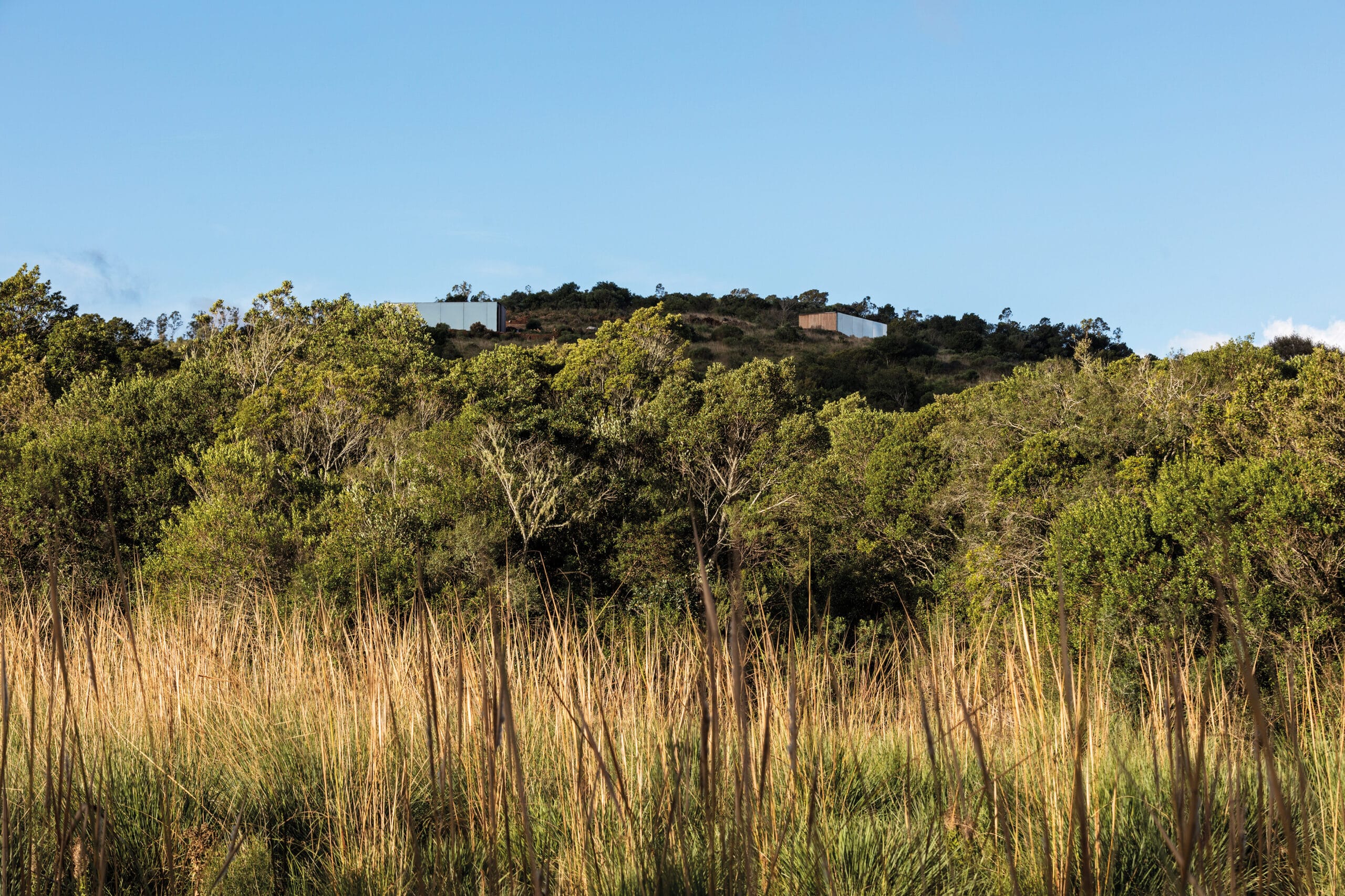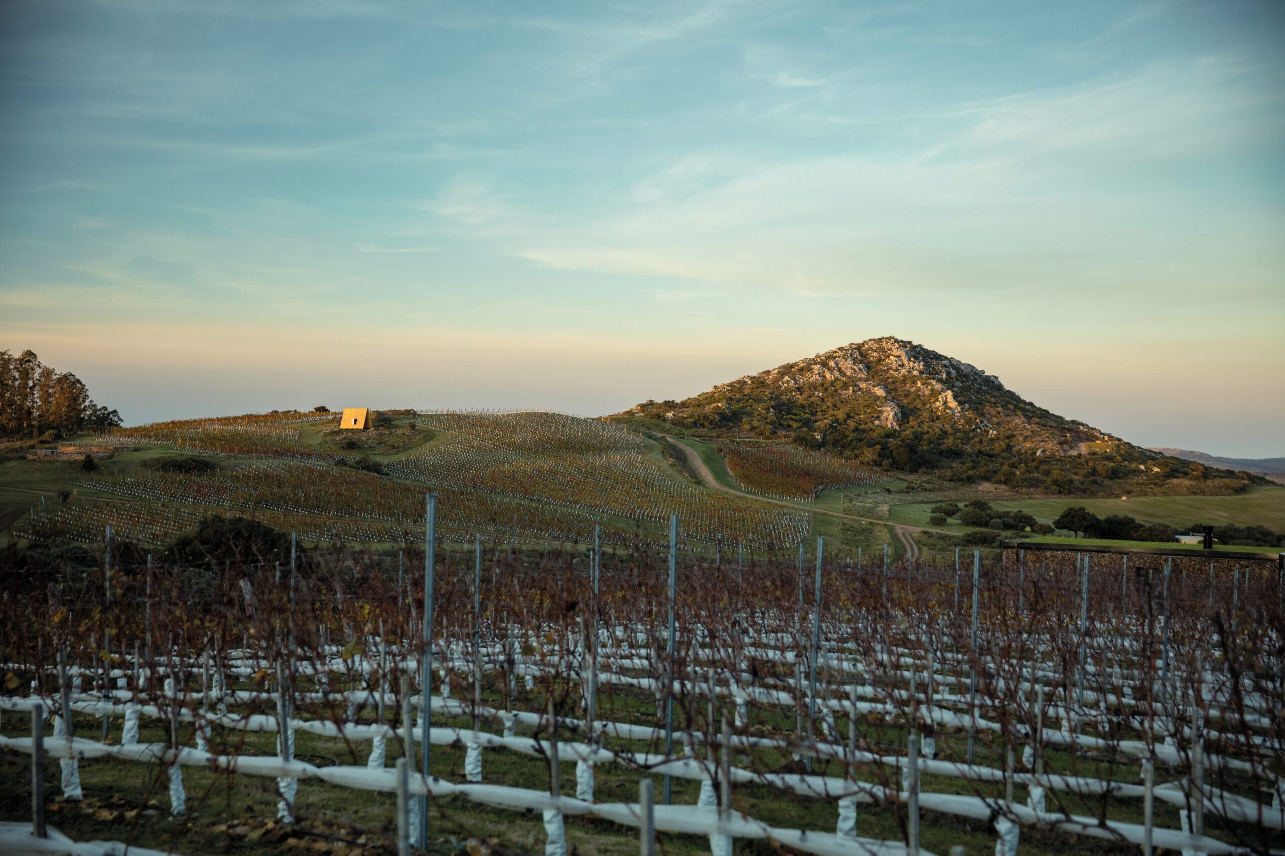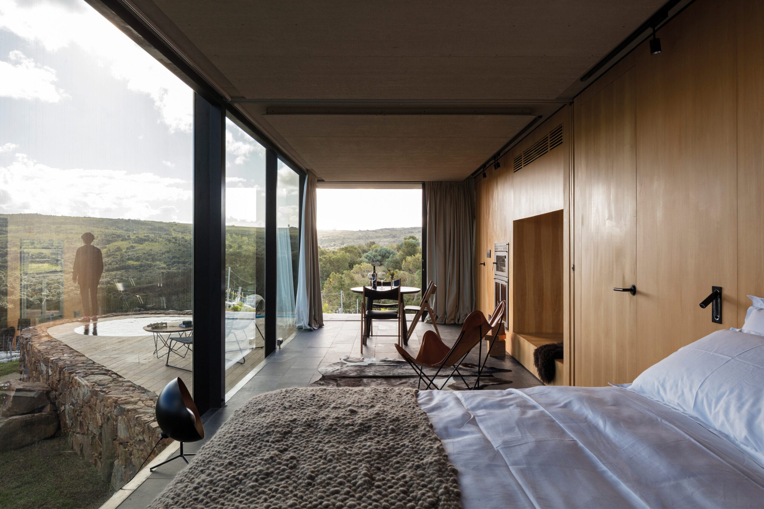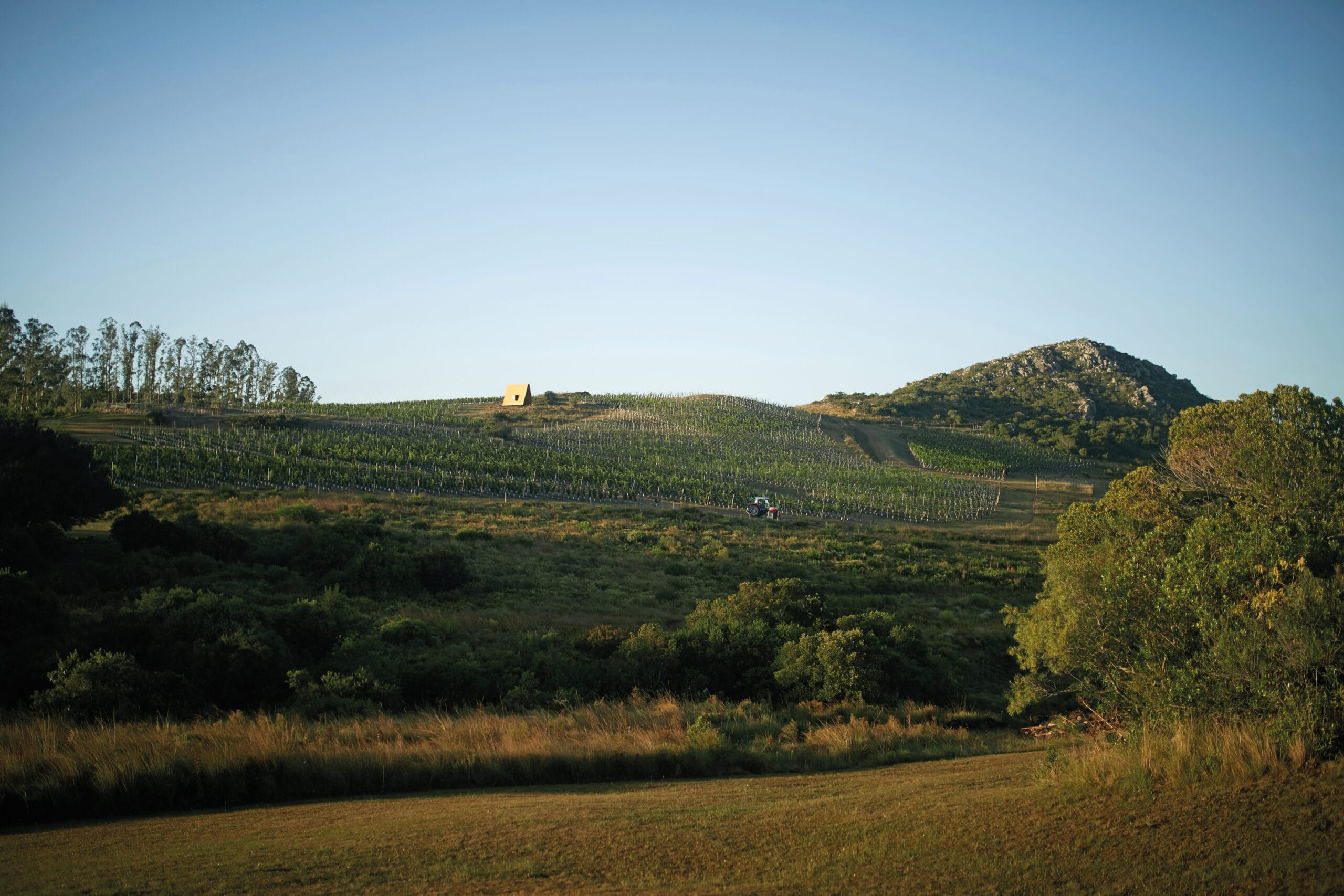 Sacromonte es una invitación a encontrarnos con la naturaleza remota y el mundo de los vinos finos, donde la sofisticación y lo originario conviven en una nueva experiencia de paisaje. Sus tierras ocupan más de 100 hectáreas se enclavan en un emplazamiento privilegiado: las sierras salvajes del este de Uruguay. Equidistante de Punta del Este, José Ignacio y Pueblo Garzón, configura un ecosistema único de disfrute, del que forma parte con espíritu propio. Sacromonte es paisaje. Es un campo de fuerzas relacionales, de antiguas intensidades y nuevos impulsos que coexisten en una nueva entidad inédita. Así, la naturaleza, lo productivo, las infraestructuras, las edificaciones y lo energético configuran un campo de estímulos a descubrir, un campo de experiencias. En este paisaje interactúan jóvenes viñedos que se adaptan a las características de los suelos, un cerro desde el cual entender el paisaje, verdes áreas de pradera, dos reservas de agua natural y varios arroyos que corren por los valles rodeados de densa vegetación autóctona. Es el explorador contemporáneo el encargado de recorrerlos y trazar su propio guion a través de diversos escenarios de los que es co-protagonista junto al paisaje. Las habitaciones de Sacromonte nacen en una fábrica en el área metropolitana de Montevideo. Se trata de un proceso rápido, de menos de 10 semanas, para luego ser transportadas más de 200 km de distancia, en un solo día. Al dejar la ciudad atrás, las habitaciones dejan de serlo, para transformarse en refugios de paisaje, dejan de ser objetos para devenir experiencias. En su estructura metálica modular, que combina steel framing y light steel framing, prima la simpleza constructiva y el uso eficiente de los materiales. Sus terminaciones son simples y contundentes, los materiales son usados según su naturaleza. En contraste, los muros que reciben los módulos prefabricados son construidos en simultáneo en el lugar con piedras locales que toman diversas formas orgánicas y se adaptan para posibilitar cada implantación. Se completan con piscinas circulares que integran una nueva experiencia sensorial del paisaje. De diferentes espesores entre los que se desarrolla la vida. El plano posterior se compone de un apilamiento de troncos de madera que rememora a los apilamientos de leña propios de la vida en la naturaleza. La siguiente capa alberga las áreas húmedas de baño y cocina, una estufa a leña y un hueco profundo ideal para leer un libro o dormir una siesta cobijado en el paisaje. Separado por un plano de madera, sigue el espacio principal de dormitorio, living y comedor, que se abre completamente al paisaje al que enfrenta, siendo parte de él. El plano frontal se conforma con un plano de vidrio espejado que cubre de un efecto casi mágico al refugio, posicionándolo en un tenso límite: entre el camuflaje y el tiempo de la naturaleza y el brillo irreal de lo tecnológico y del hoy.