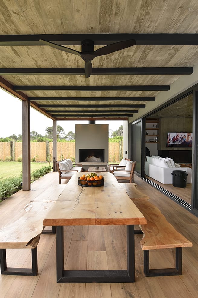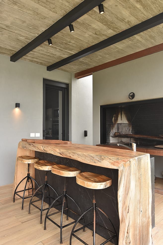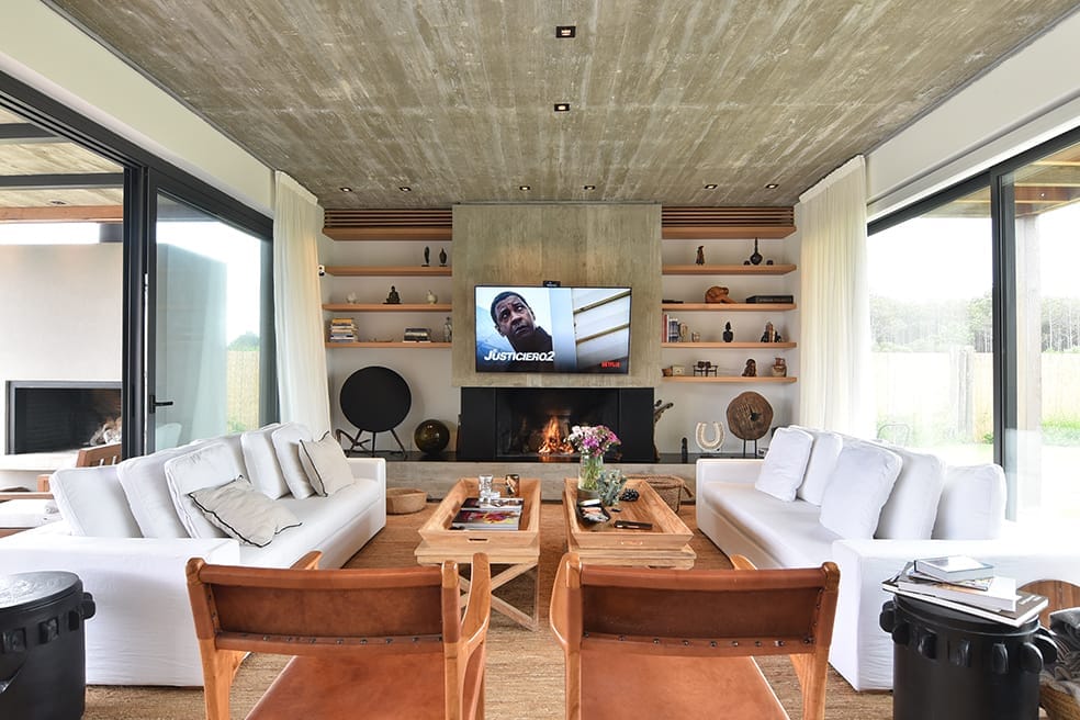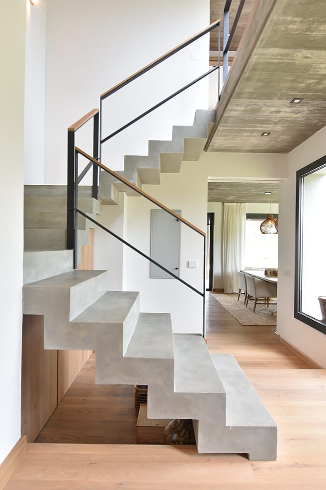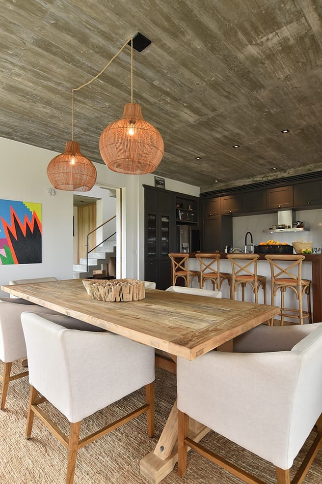 Esta casa, ubicada en Arenas de José Ignacio, apela a la utilización de una paleta cromática de materiales naturales que brinda calidez al hormigón visto que sin dudas al interior de los espacios es el material noble protagonista. La madera es sin dudas un elemento trascendente en el rol de buscar el objetivo de calidez proyectado. La forma de la casa surge a partir de los volúmenes que se diferencian en su materialidad y programa. El conjunto volumétrico resuelve el partido con especial naturalidad, los espacios son enmarcados en sus fachadas con una la imagen unitaria que exhibe el cuerpo frontal y determina la planta principal en forma de L. En planta baja sobre la fachada Oeste se disponen los espacios sociales y en planta alta las áreas privadas.