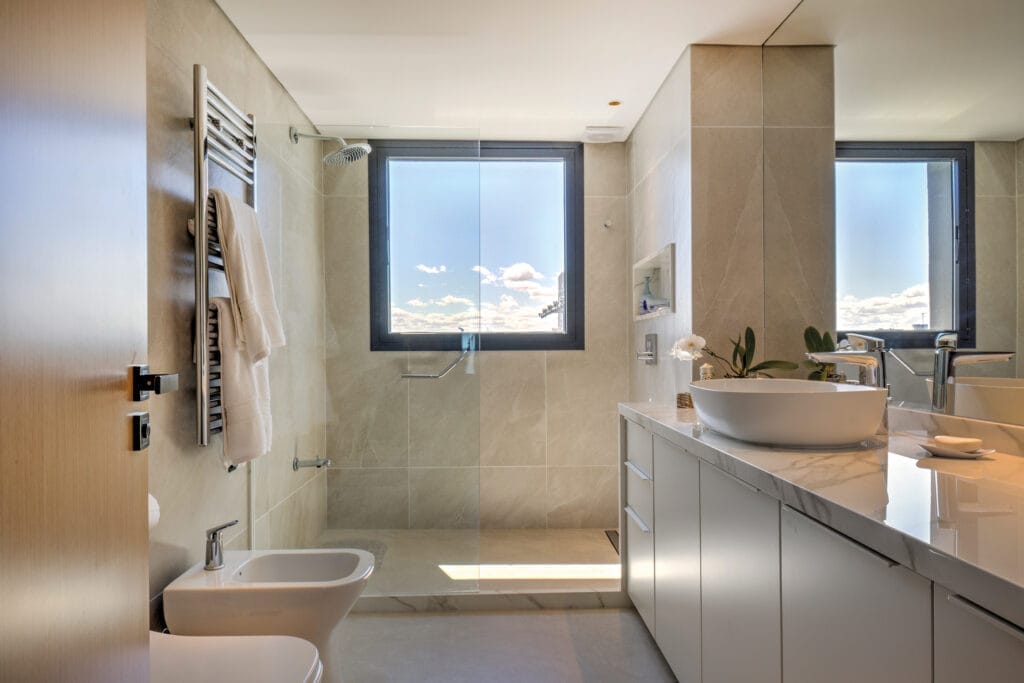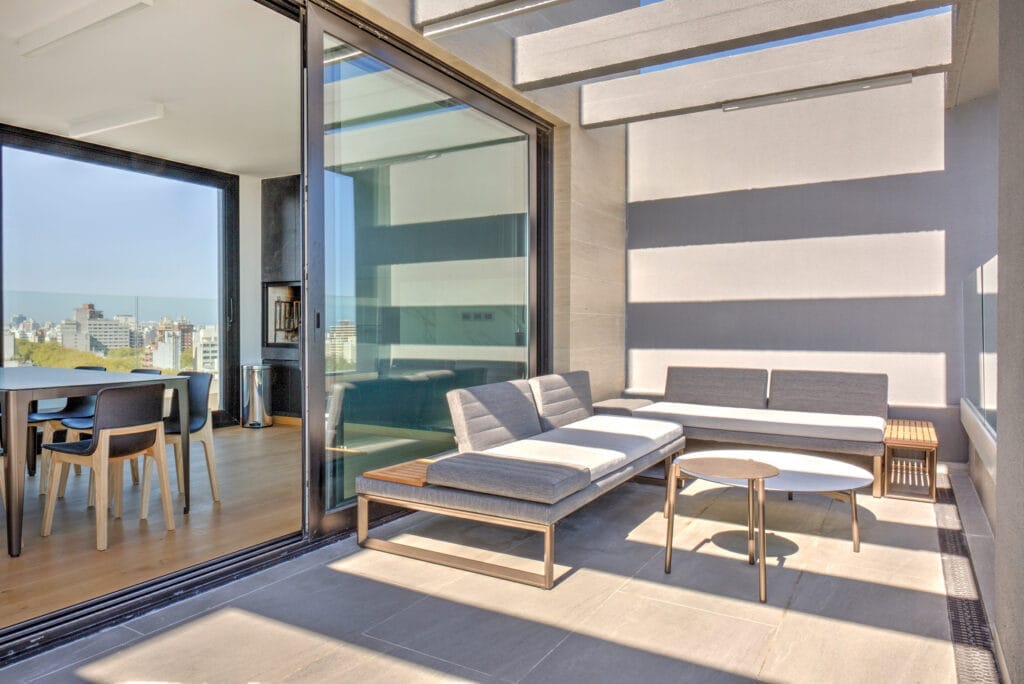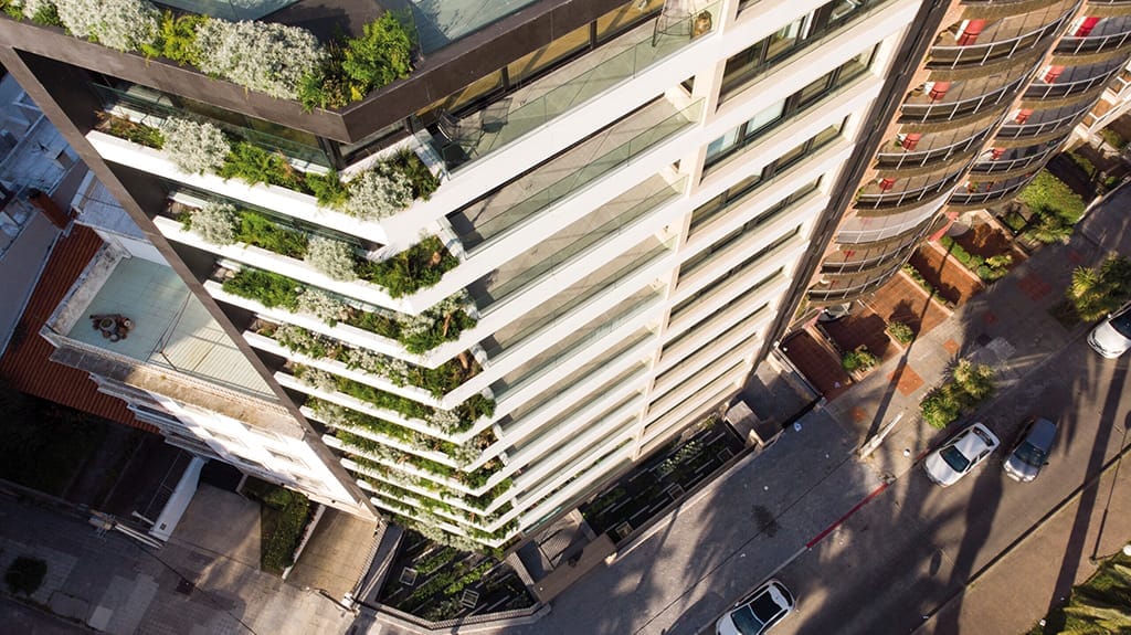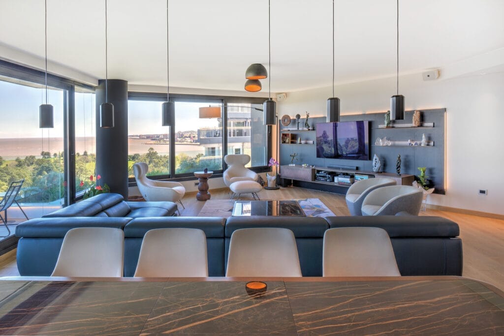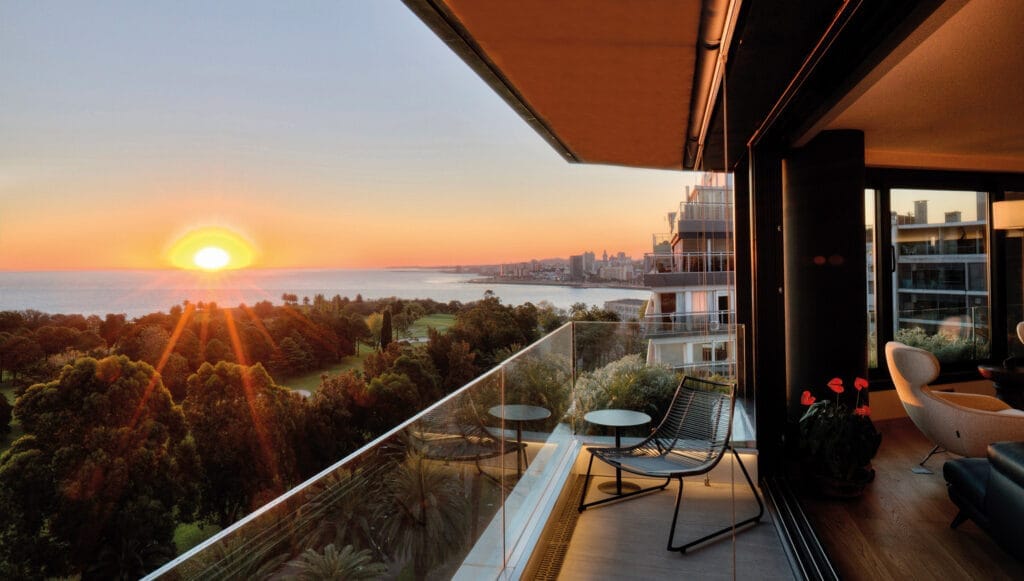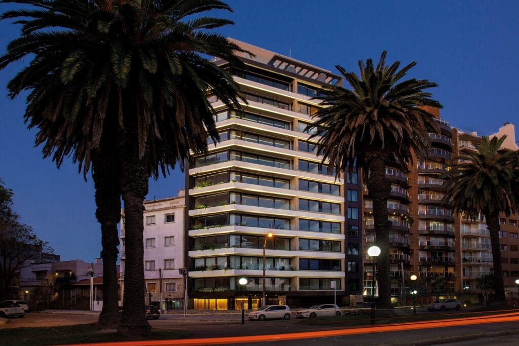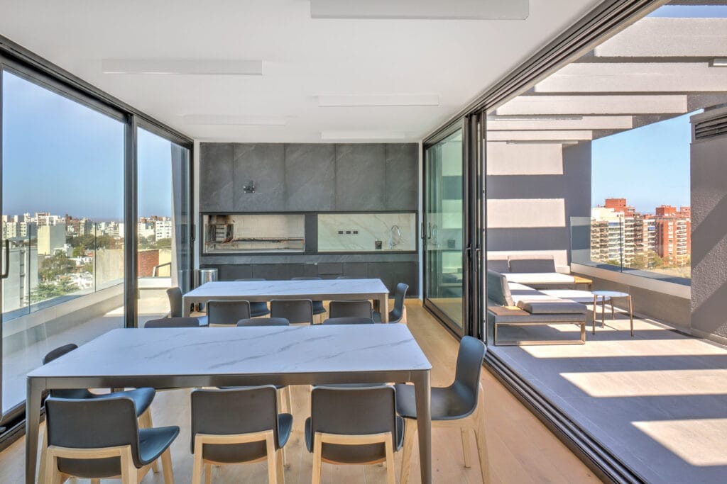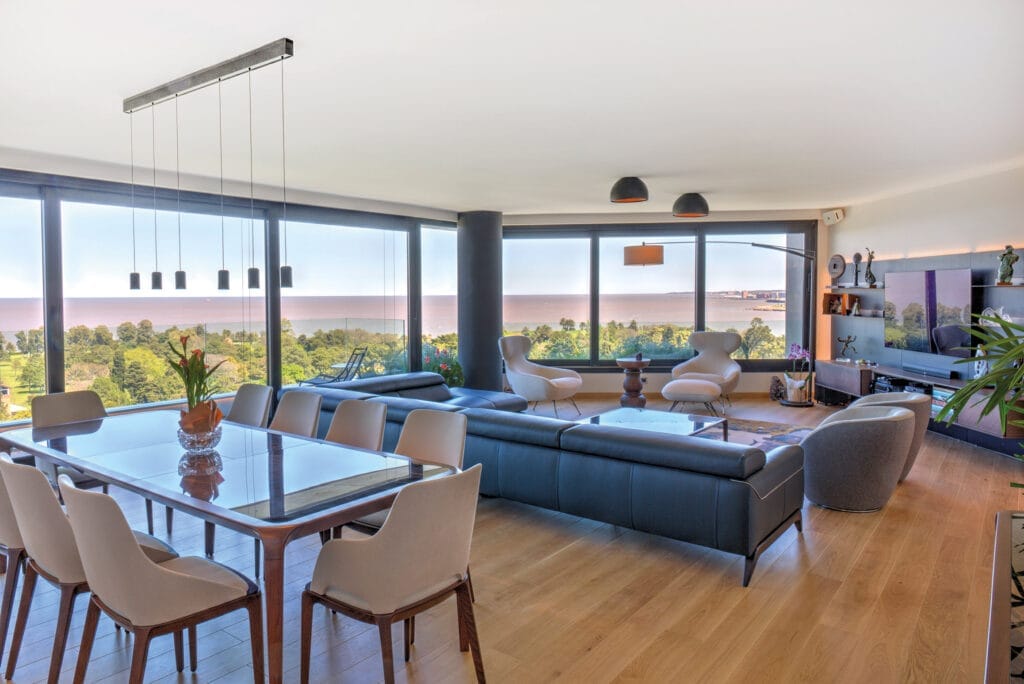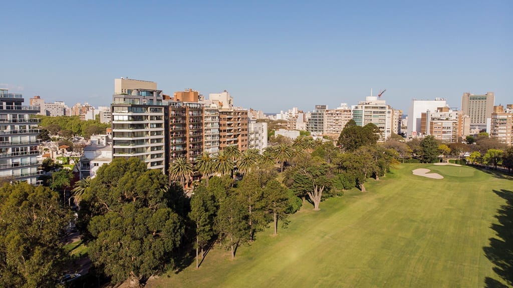El living comedor se ubica en el espacio angular que ofrece la planta para así magnificar la amplitud de la vista. En las terrazas se incorporan canteros verdes para conectar visualmente con el verde del Club de Golf de Punta Carretas, integrando los espacios de forma sensorial. Todos los dormitorios ofrecen inmejorables vistas y baños en suite. El edificio cuenta con solarium y barbacoa de uso común con parrillero ubicado en el último piso con vistas al Club de Golf y el Río de la Plata. En planta baja se encuentra un spa con piscina cerrada y gimnasio equipado.