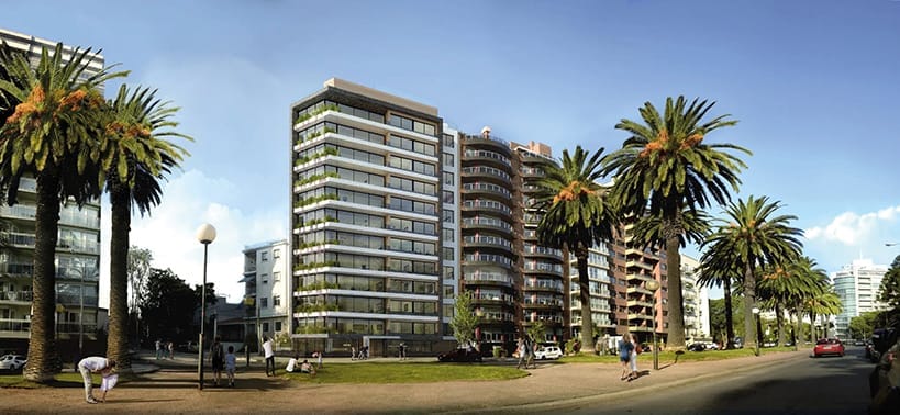 El living comedor se ubica en el espacio angular que ofrece la planta para así magnificar la amplitud de la vista. En las terrazas se incorporan canteros verdes para conectar visualmente con el verde del Club de Golf de Punta Carretas, integrando los espacios de forma sensorial. Todos los dormitorios ofrecen inmejorables vistas y baños en suite. El edificio cuenta con solarium y barbacoa de uso común con parrillero ubicado en el último piso con vistas al Club de Golf y el Río de la Plata. En planta baja se encuentra un spa con piscina cerrada y gimnasio equipado.