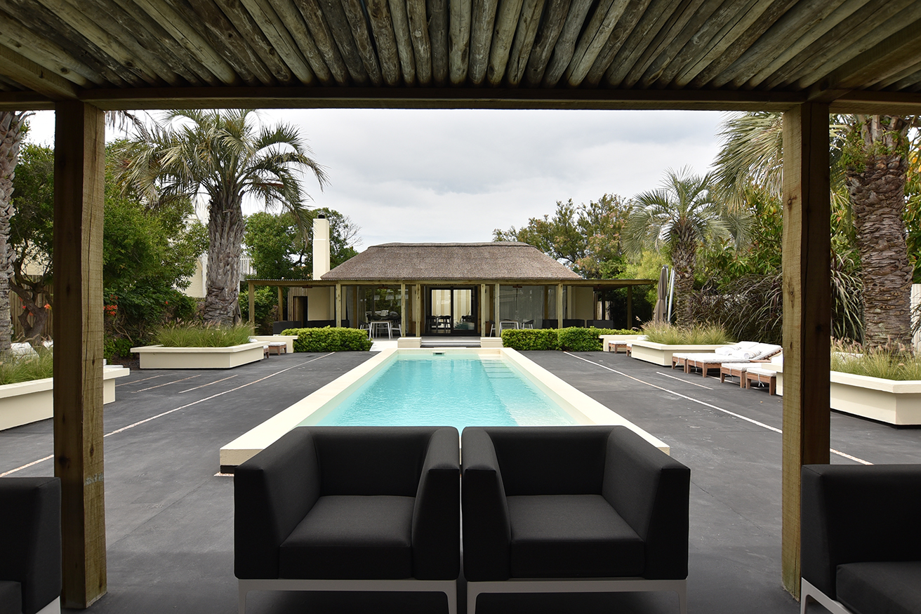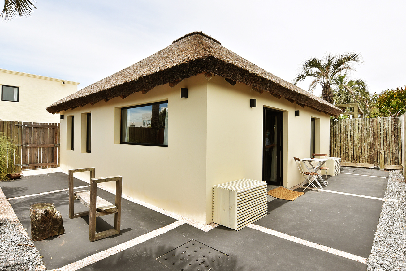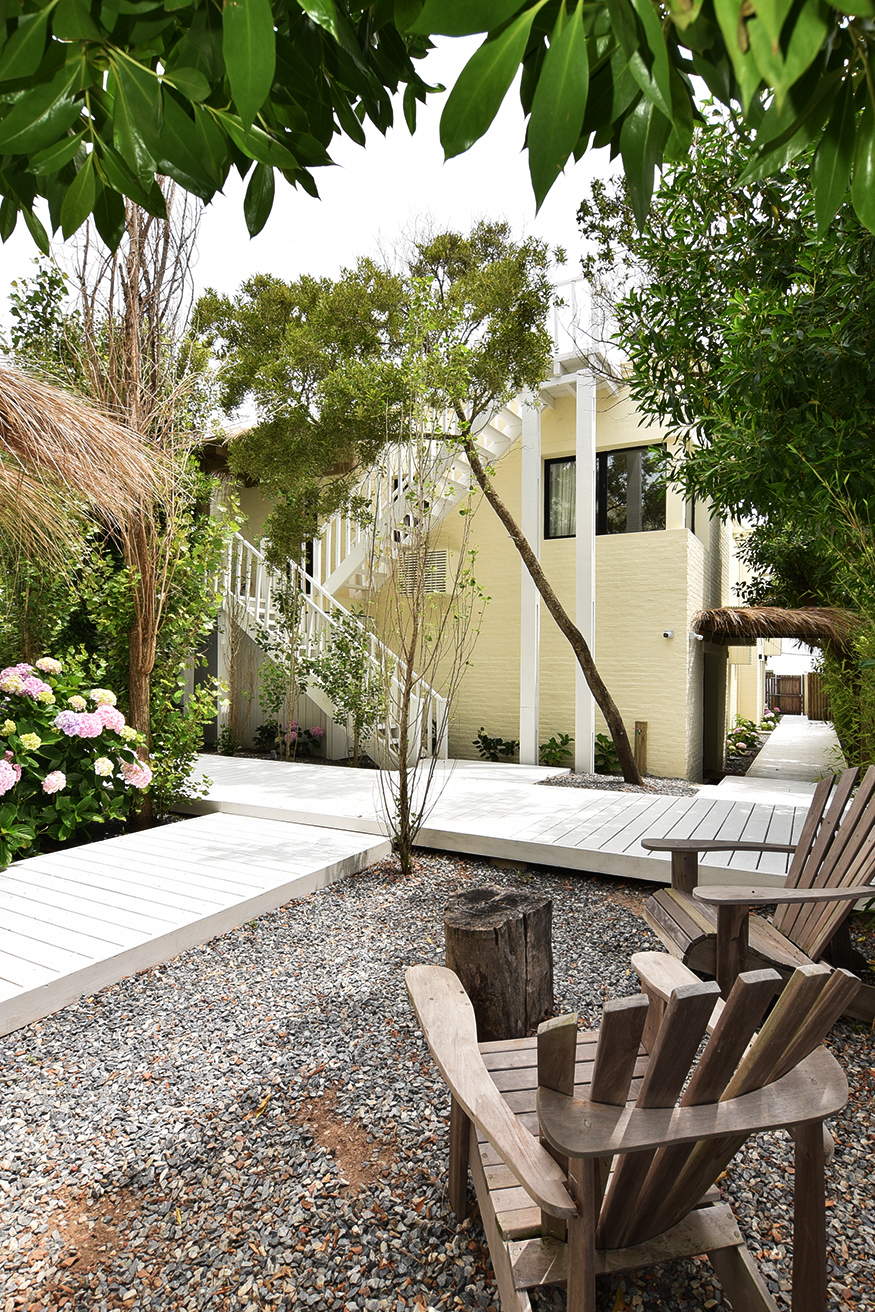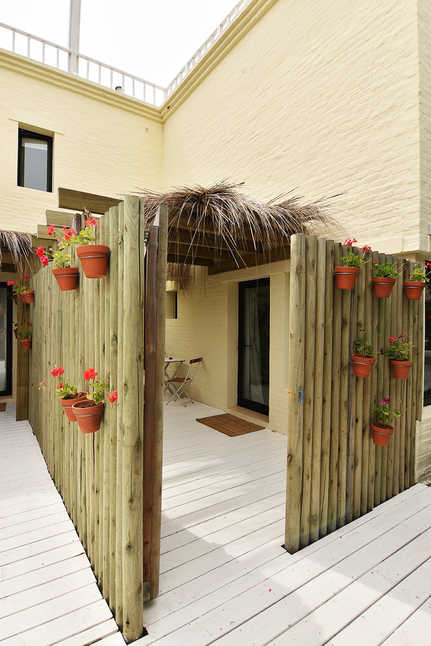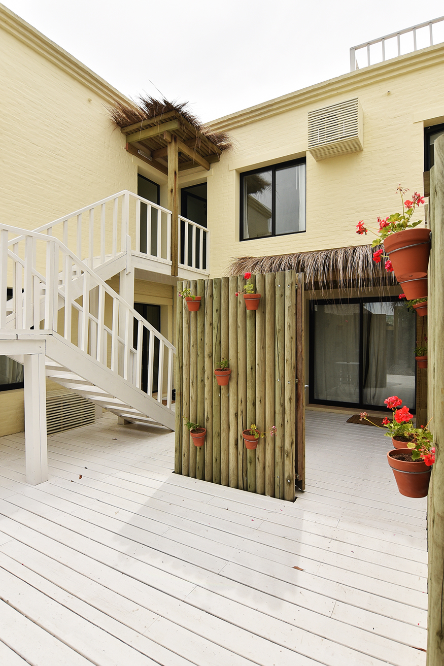 …el relevamiento de las estructuras preexistentes determino que se contaba con un área sin función específica, ubicada en el cuerpo central de las edificaciones, con fachada hacia la calle y luego determinamos unas 6 habitaciones con instalaciones previstas para baños. Las construcciones eran de madera pintada y el circuito que comenzamos a imaginar nos llevó a explorar la posibilidad de aumentar la capacidad sin ingresar en obras de mayor escala. Replantear las estructuras, crear nuevos volúmenes y adaptar los existentes, nos llevó a generar un circuito que integra doce habitaciones con distintos tamaños y comodidades, todas con acceso independiente. En el patio reformamos un espejo de agua existente y lo convertimos en una gran piscina en torno a la cual además del solárium creamos un estar abierto con hogar y el quincho lo convertimos en un pequeño espacio para desayunar, merendar y tomar un café a la tarde…