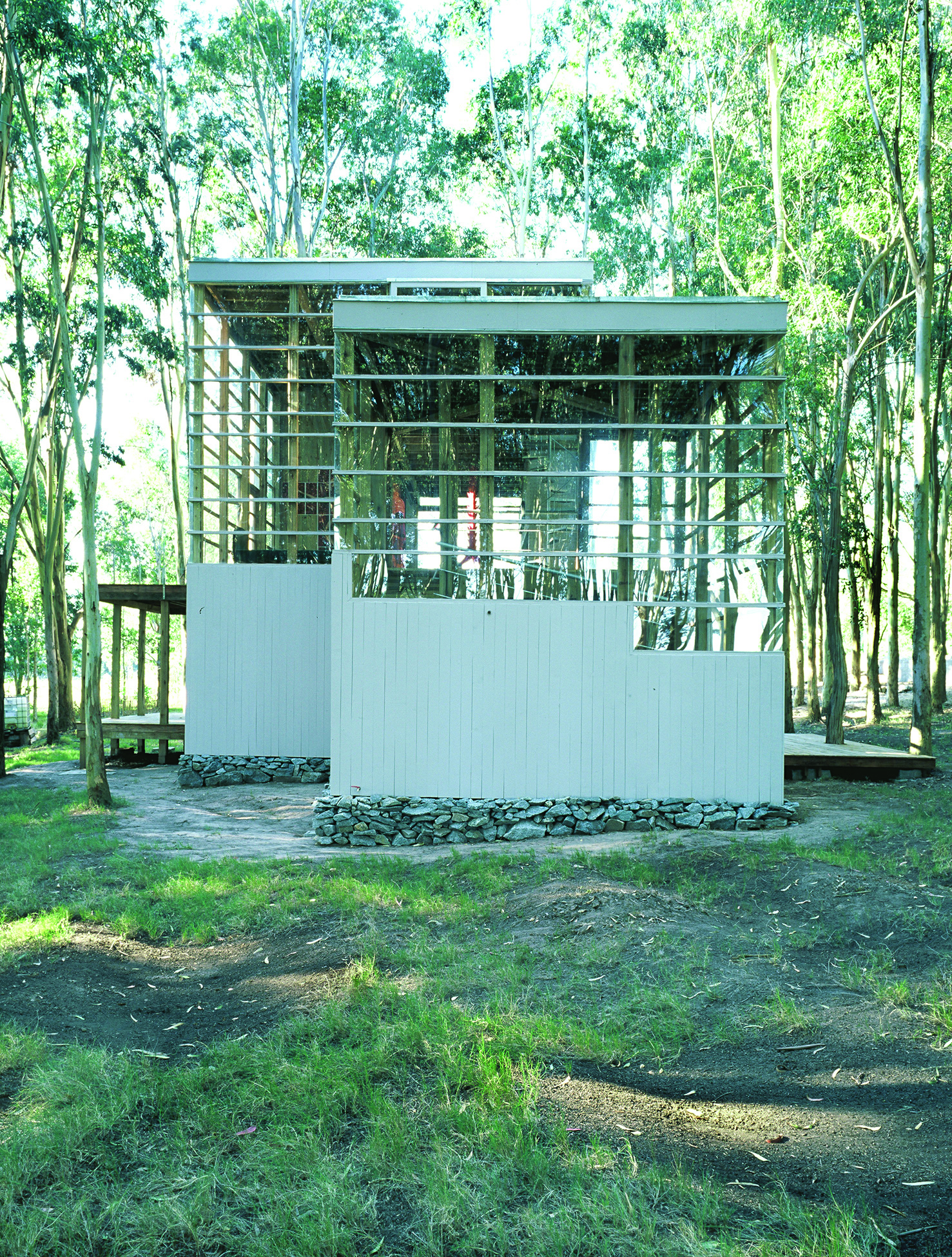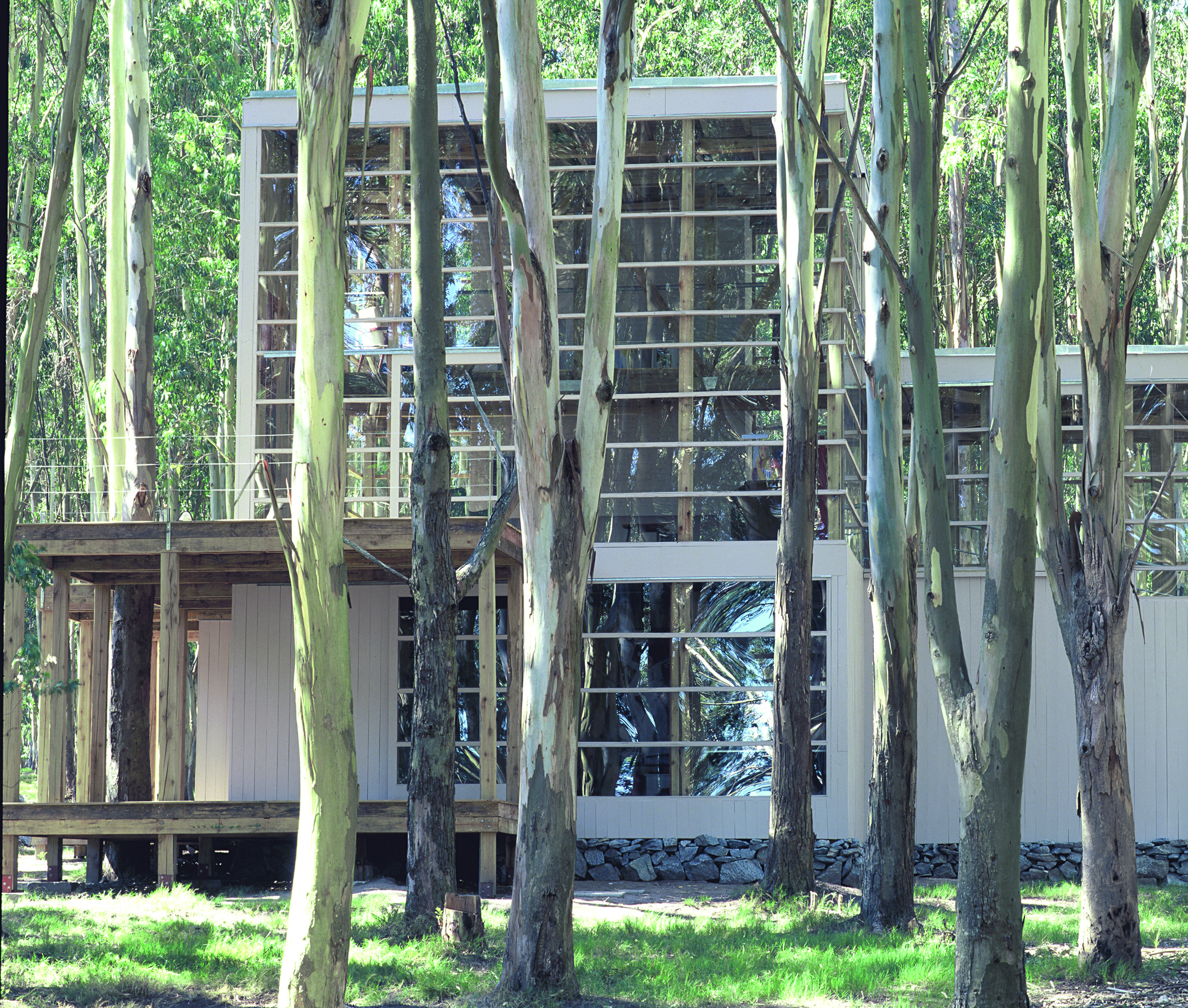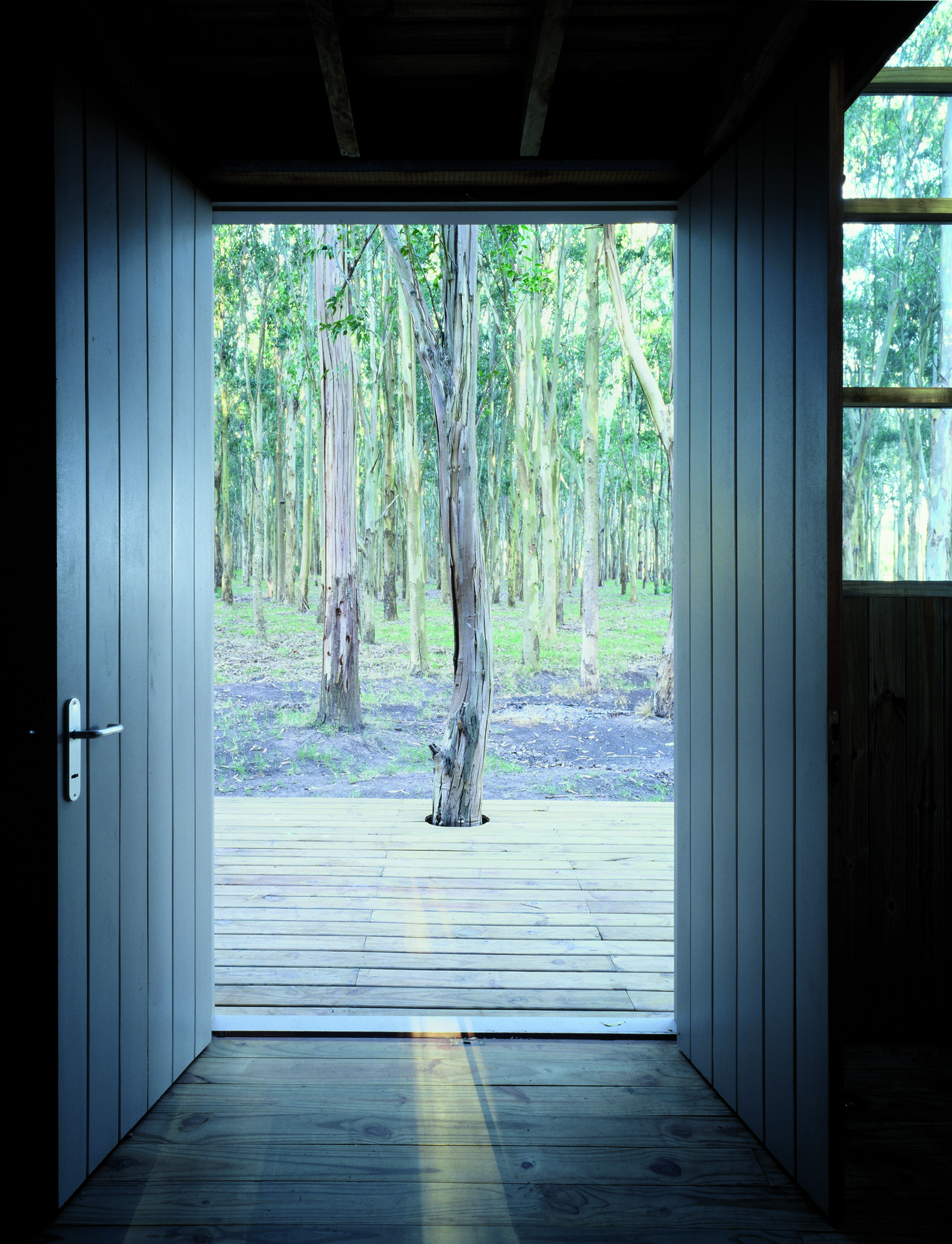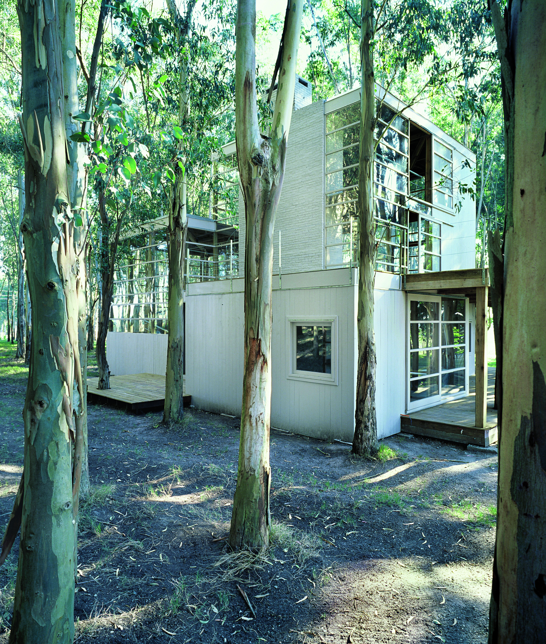 Desde la sutileza que lo identifica, Diego Montero presenta una residencia de líneas contemporáneas que asienta su estructura en un bosque. El predio en La Barra, Maldonado, se encuentra cubierto de eucaliptus. Evitar talar siquiera uno, era parte del desafío. La otra parte, hacerlo con poco dinero. Madera y vidrio son los materiales elegidos. Con tablas y palos de eucaliptus canteados se traza una estructura de sencilla volumetría: un par de prismas desfasados que ponen énfasis en su verticalidad. La idea central del proyecto busca que la casa se confunda con el mismo bosque. Para ello la transparencia, las columnas de madera que se definen en la piel, así como las que se dejan entrever en el interior de la vivienda, juegan un papel importante. La construcción se muestra etérea, se vuelve parte de la naturaleza circundante, desdibuja sus límites entre los troncos de los árboles. No se modifica o afecta el paisaje, se interactúa con el desde la analogía, desde la unidad.