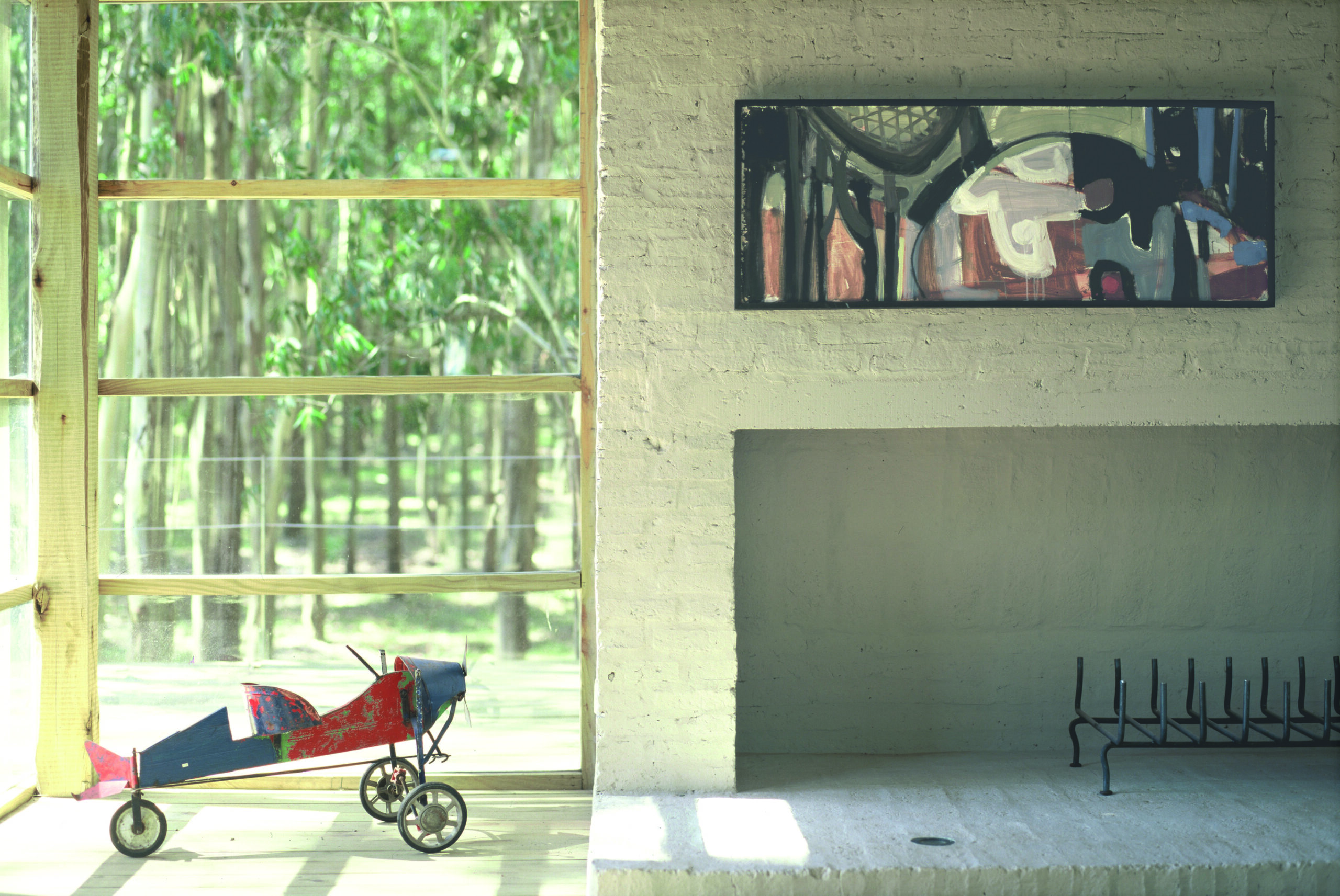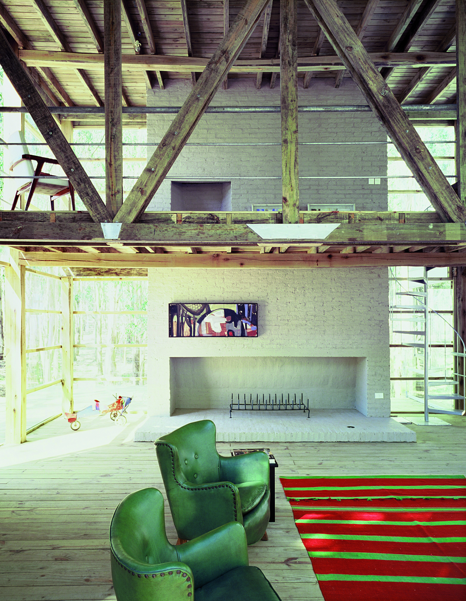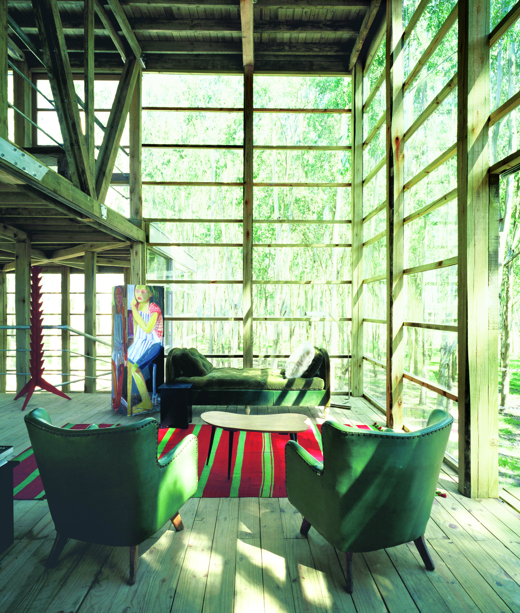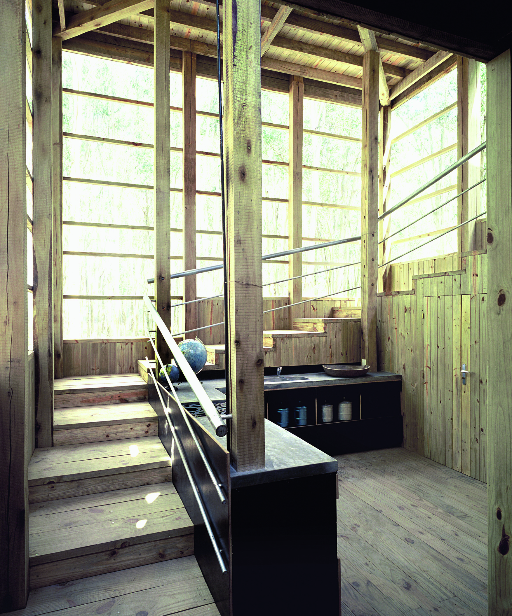 La casa de dos dormitorios se carga de luz, las paredes de vidrio van creciendo en superficie a medida que la altura sube. La base se presenta sólida, cerrada en su mayoría, solo emplea el vidrio en puntos estratégicos. En un primer piso, el estar; y una original escalera que va pautando un recorrido envolvente delimita a la cocina. La propuesta se arma en un total de tres niveles, los ambientes amplios disfrutan de la calidad espacial, de una fluida comunicación entre las diferentes alturas. Todo es madera, madera que se contrasta con escaso mobiliario. Texturas, colores, formas añaden riqueza a la sencilla estructura. Una selección de obras de arte roba una porción del protagonismo. Detalles como la gran estufa (único elemento en mampostería) que atraviesa las distintas plantas, o los baños de madera y vidrio, terminan de configurar una arquitectura honesta, nítida, de una extraordinaria expresividad.