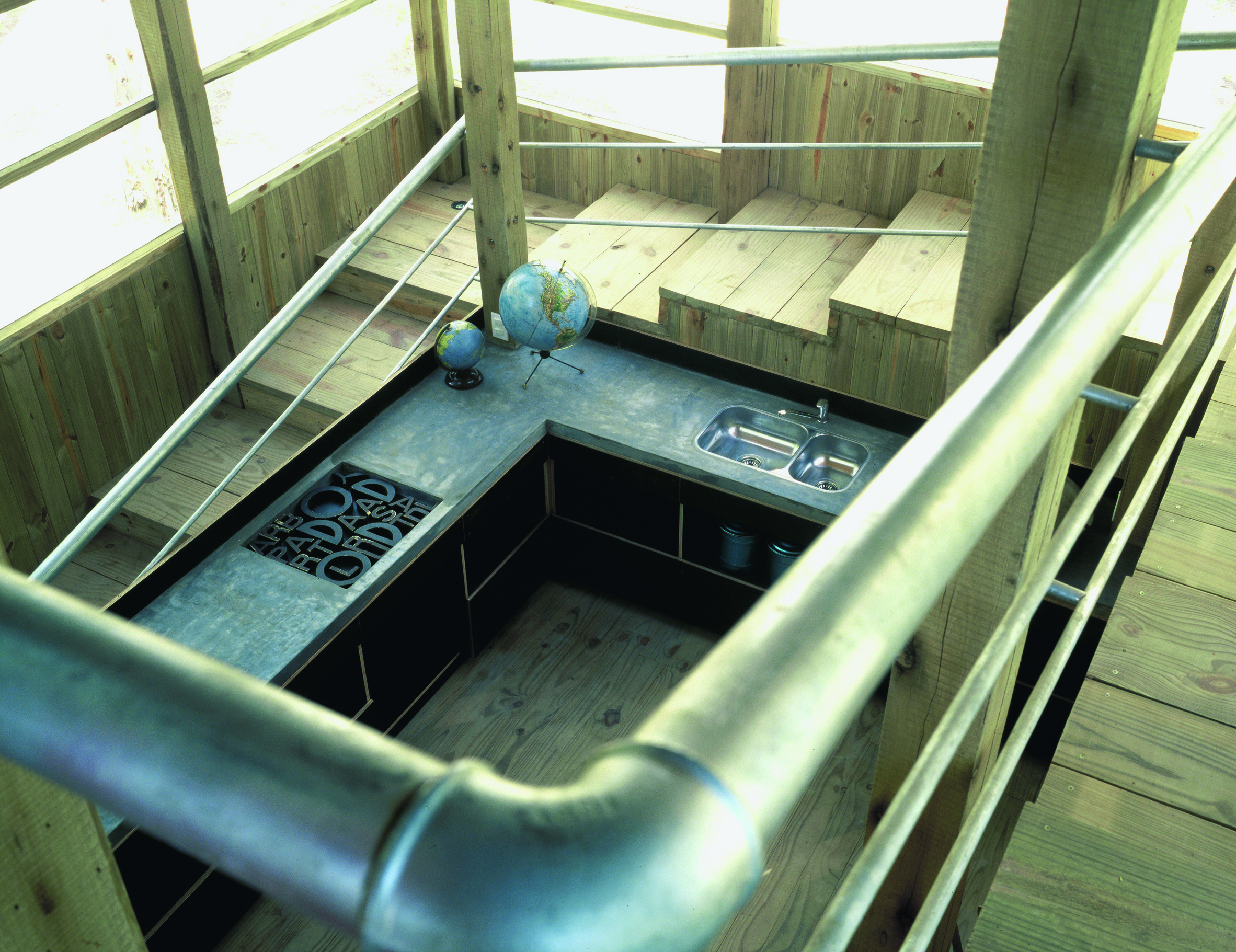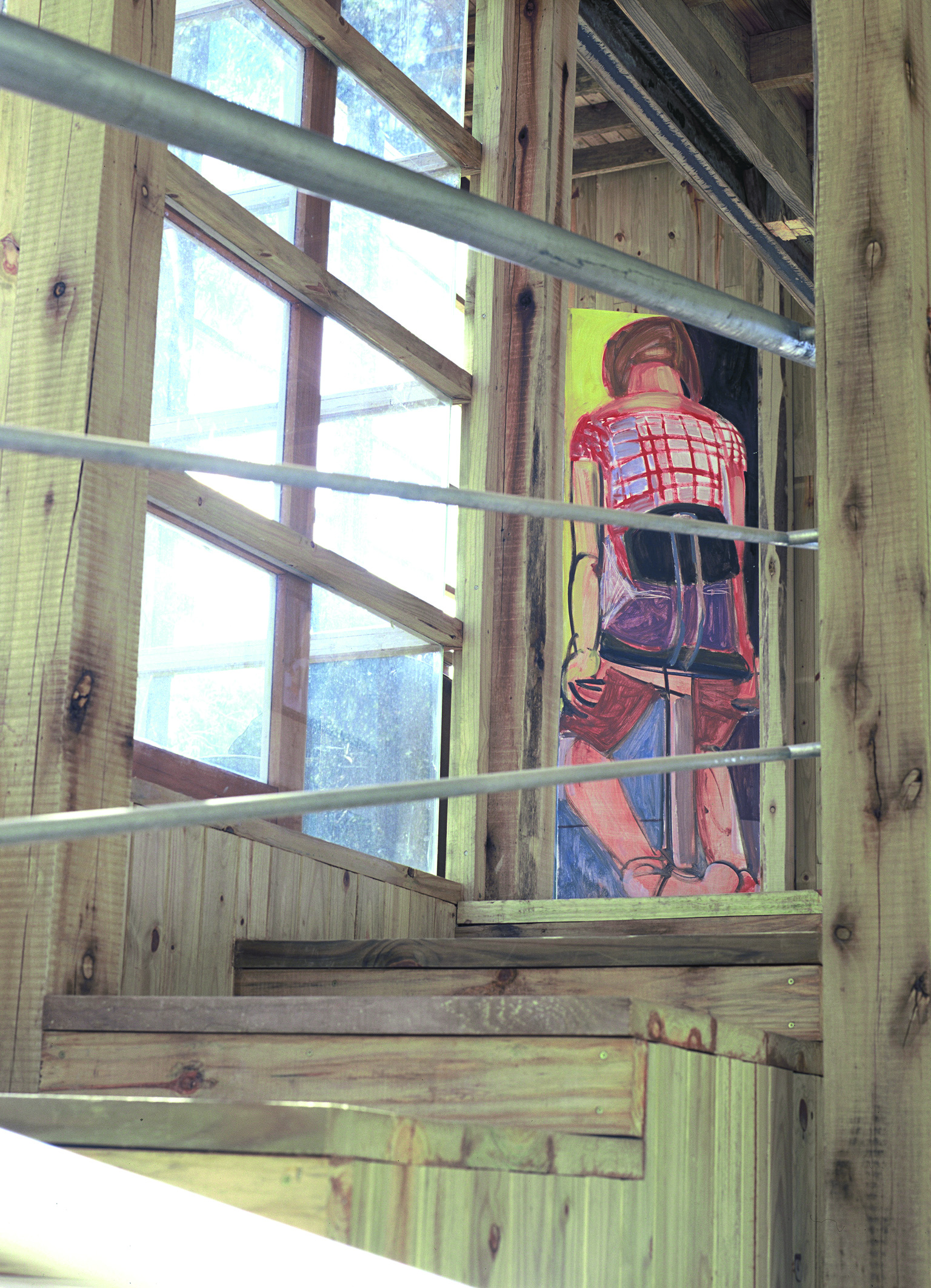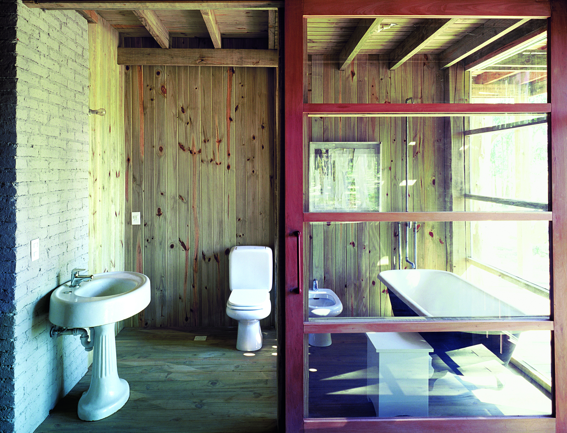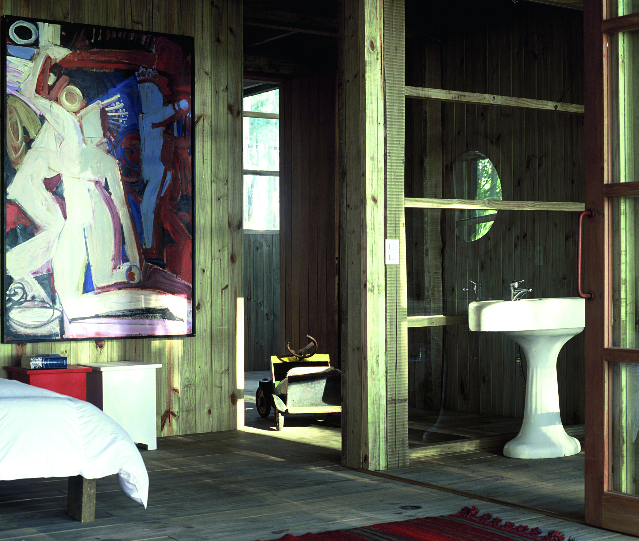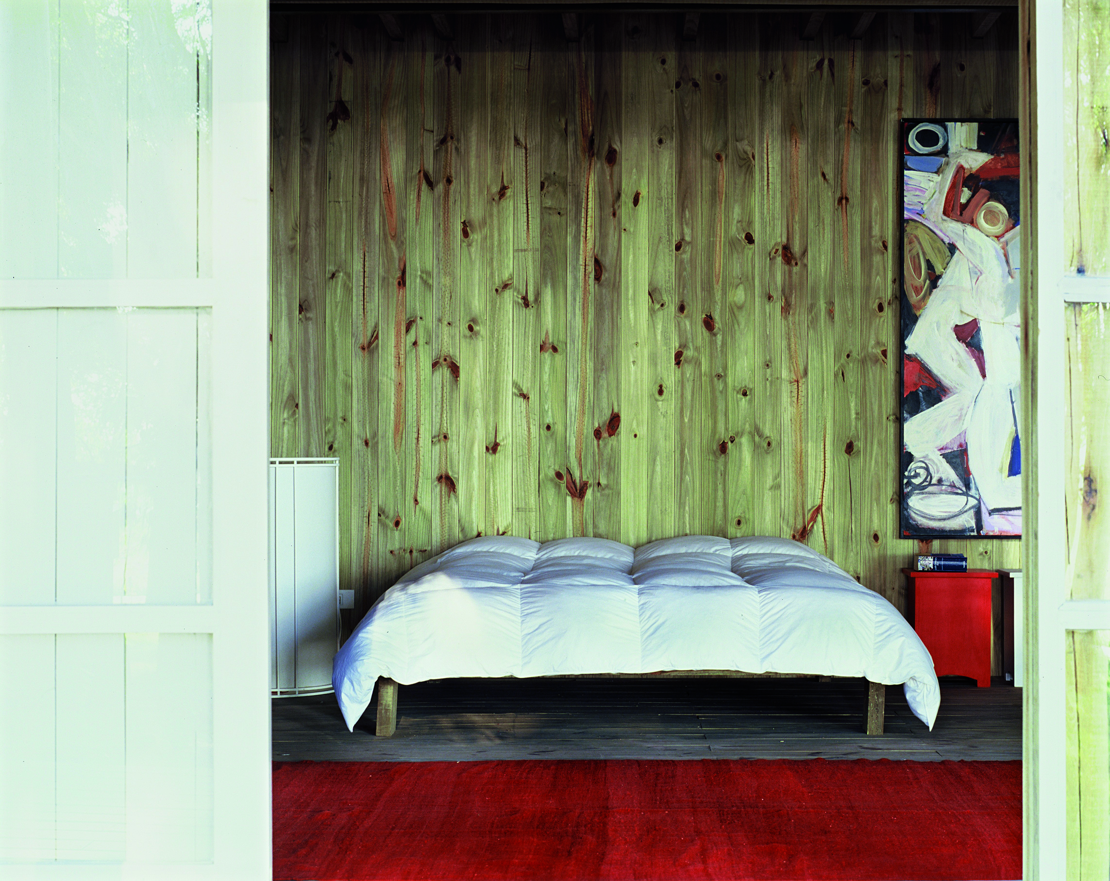 La casa de dos dormitorios se carga de luz, las paredes de vidrio van creciendo en superficie a medida que la altura sube. La base se presenta sólida, cerrada en su mayoría, solo emplea el vidrio en puntos estratégicos. En un primer piso, el estar; y una original escalera que va pautando un recorrido envolvente delimita a la cocina. La propuesta se arma en un total de tres niveles, los ambientes amplios disfrutan de la calidad espacial, de una fluida comunicación entre las diferentes alturas. Todo es madera, madera que se contrasta con escaso mobiliario. Texturas, colores, formas añaden riqueza a la sencilla estructura. Una selección de obras de arte roba una porción del protagonismo. Detalles como la gran estufa (único elemento en mampostería) que atraviesa las distintas plantas, o los baños de madera y vidrio, terminan de configurar una arquitectura honesta, nítida, de una extraordinaria expresividad.