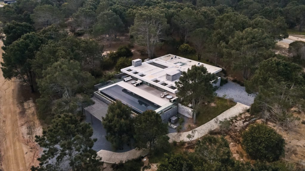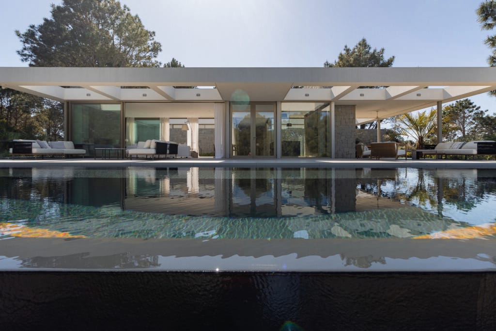 La casa, que se desarrolla en una planta, se encuentre a nivel con las copas de los árboles con lo cual el entorno resulta mágico, sorprendentemente mágico. La implantación se resolvió en eje corrido sobre el terreno procurando una orientación que a la vez que se favorece con la mayor cantidad de luz posible, está orientada hacia el faro de José Ignacio que se divisa a lo lejos. Un gran espejo de agua, la enorme piscina con fondo pintado de color negro, recorre en toda su extensión la fachada que se abre, literalmente, con enormes ventanales hacia ese paisaje encantador.