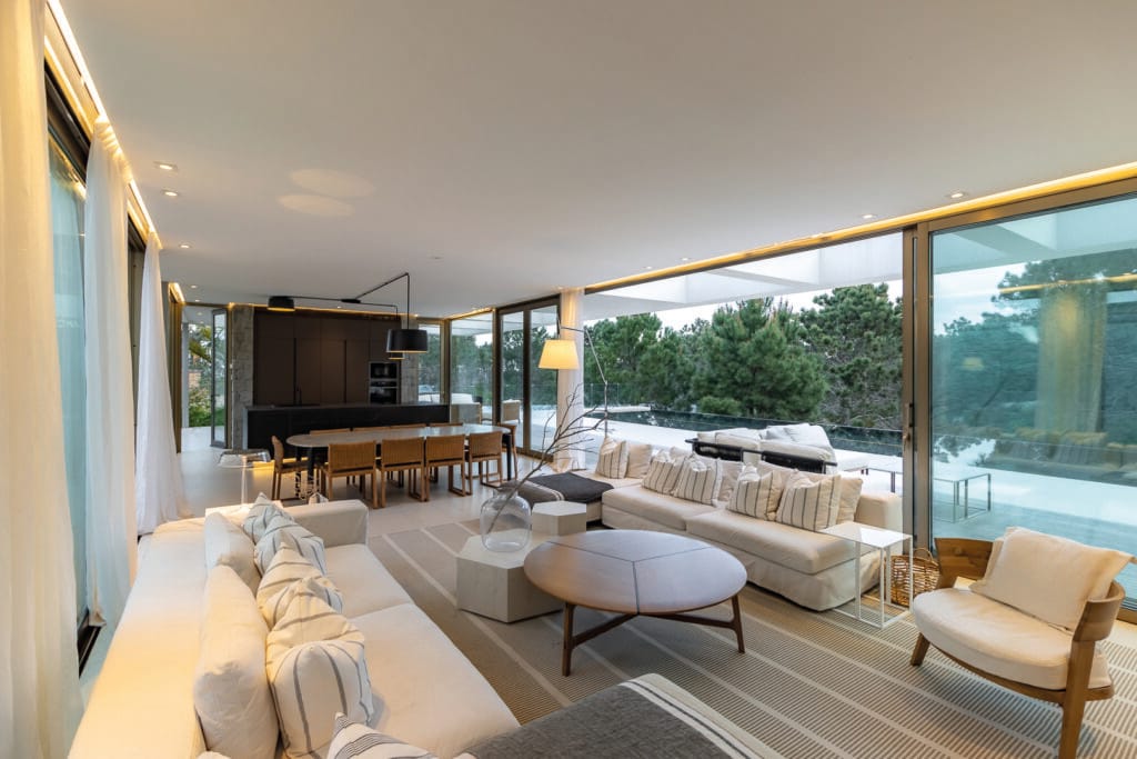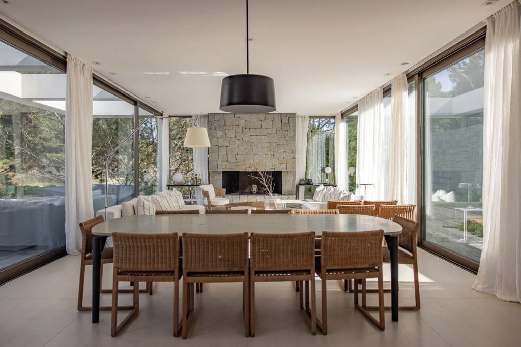 En el interior se mantiene el revestimiento textura do blanco para las paredes, el pavimento revestido en Dekton y se suma el lapacho que se ocupa de toda la carpintería que es importante. Construida a casi cuatro metros de altura con referencia a la calle interna de la urbanización, la casa convive con las copas de los árboles con lo cual la intimidad es total, la fachada vidriada de la caja principal se abre casi totalmente, los ventanales permiten una apertura de dos terceras partes de su amplitud total, y en su recorrido integra comedor, living y cocina, reservando en un lateral el sector de la barbacoa, todo en línea y con un efecto de armonía que funciona.