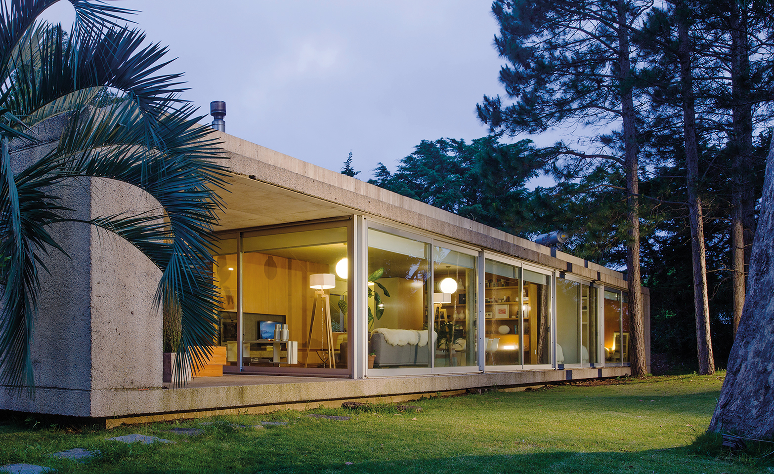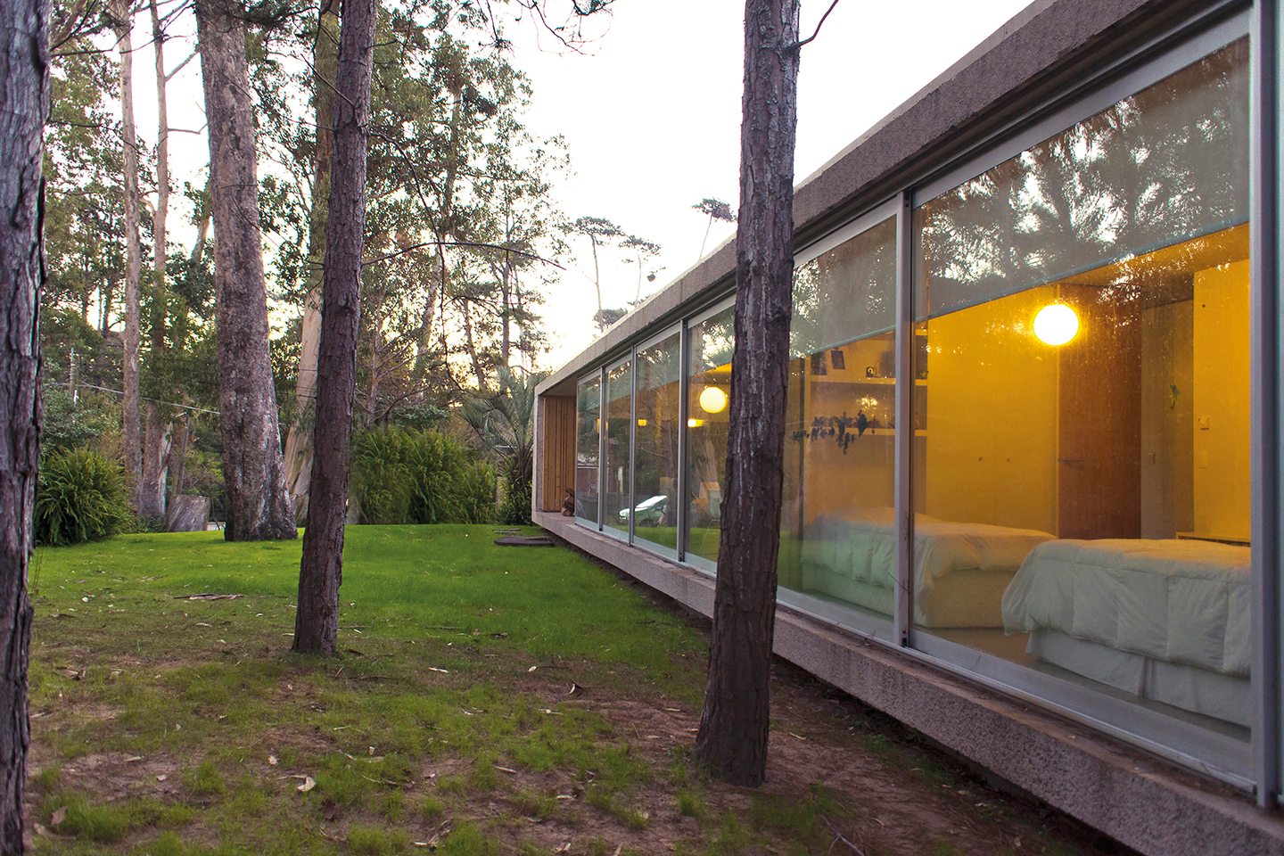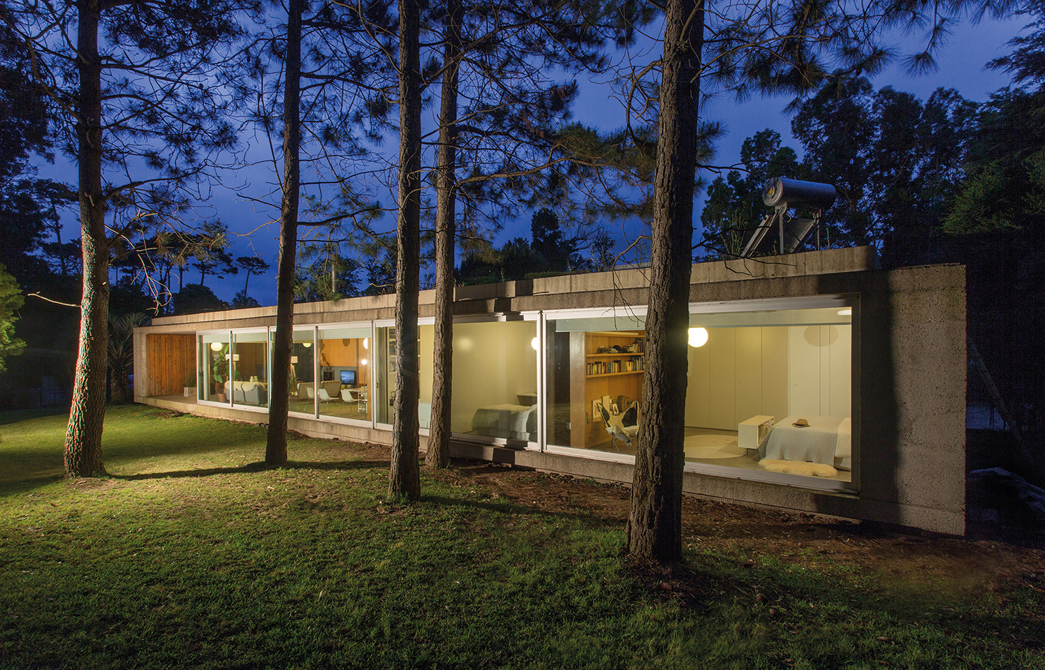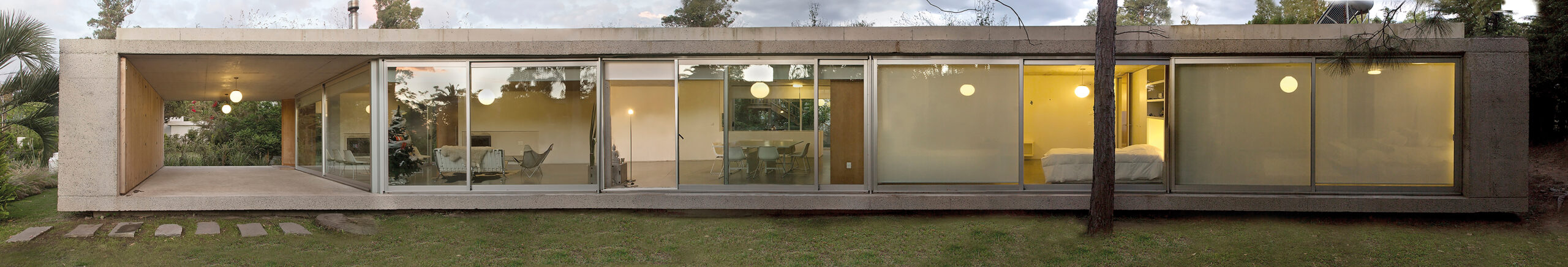 El volumen aparece como una línea que se extiende sobre el terreno, frente a la playa mansa, en Punta del Este. La pureza de la línea que contiene al espacio como una faja que dibuja un rectángulo, se despega de la tierra para suspenderse con singular gracia.