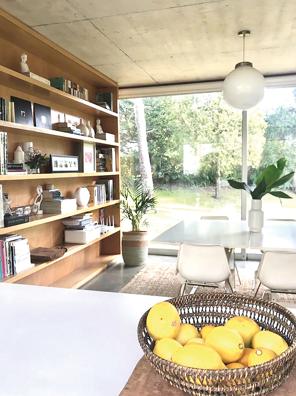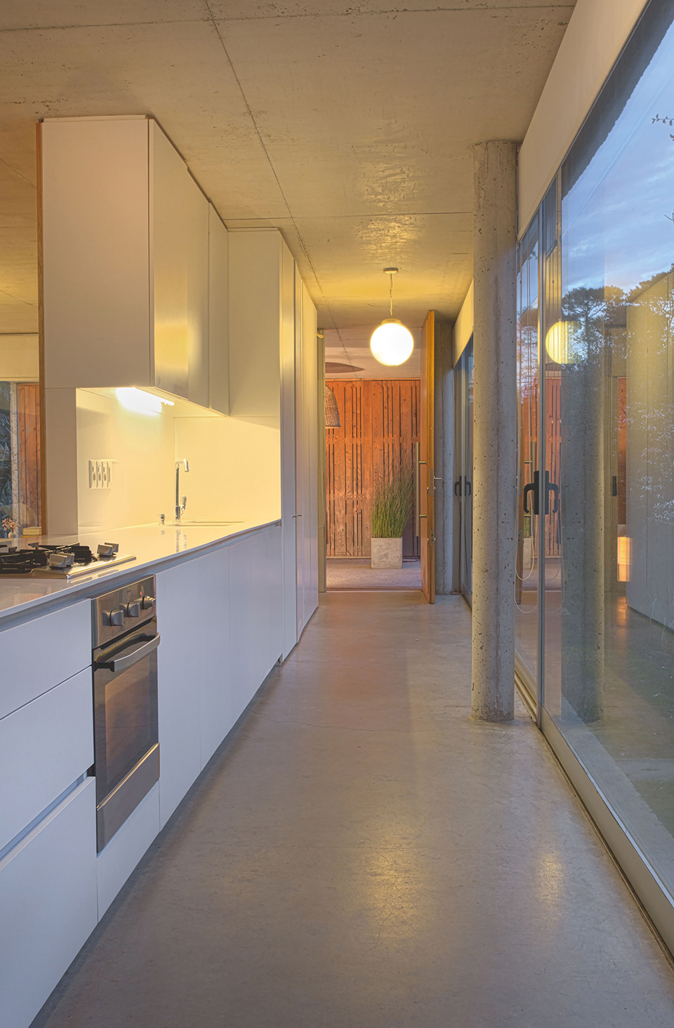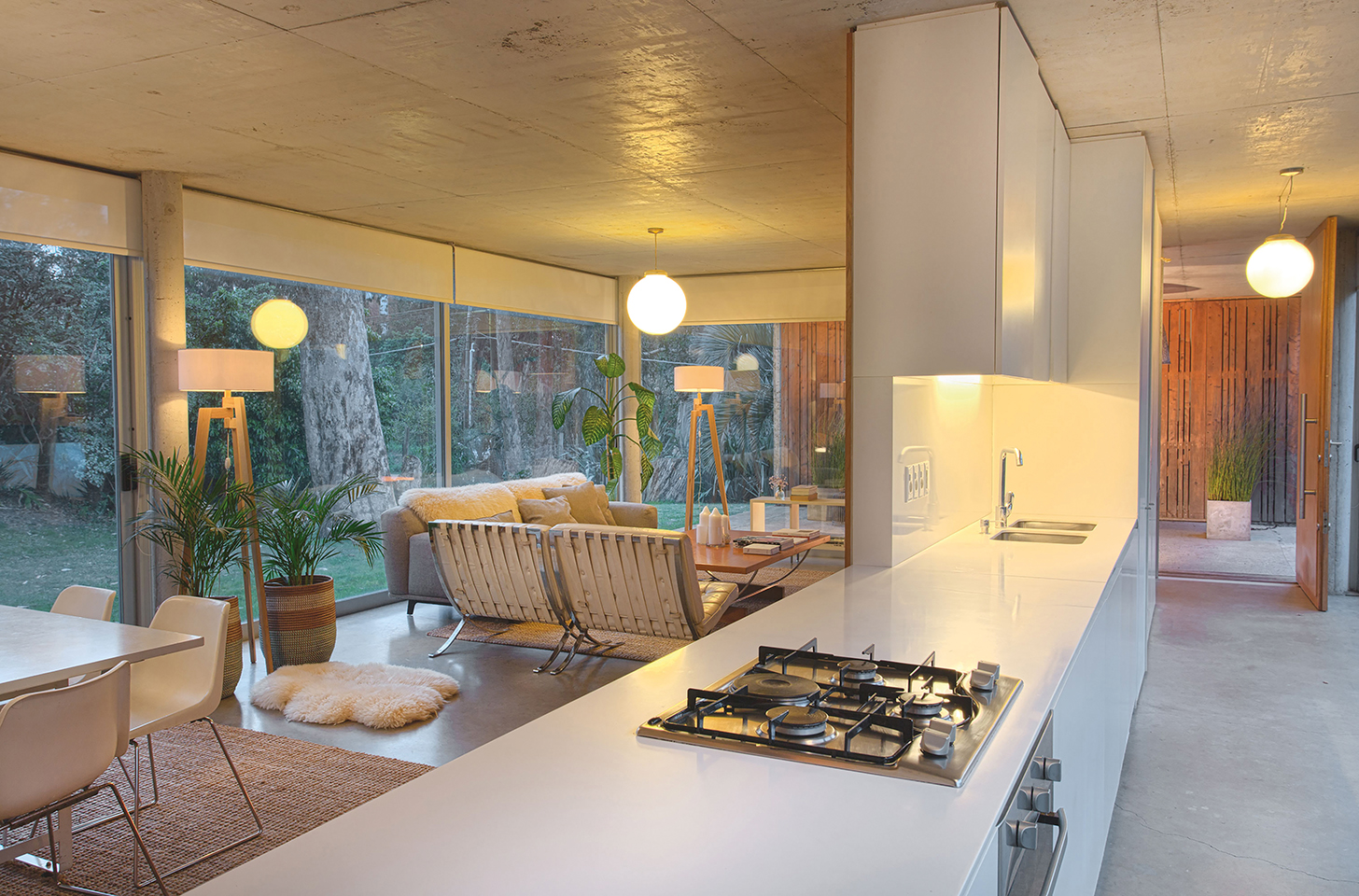 La línea del exterior tiene sus correlatos en el interior, la cocina es una línea interior que recorre la casa generando el espacio de trabajo integrado al estar y en secuencia con el comedor y los demás espacios de la casa.