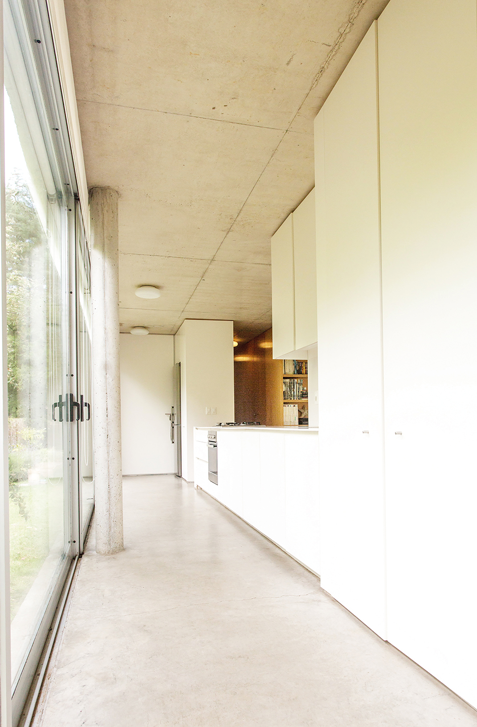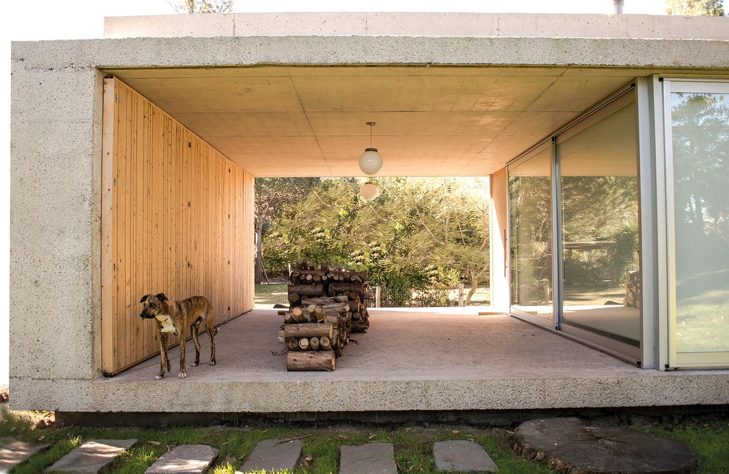 La estructura de hormigón armado apela a la imagen de la línea que dibuja en una cinta continua, el perímetro que atrapa al espacio para la vivienda. Se despega de la tierra y en ese ejercicio que aliviana el peso visual de la casa, mejora su rendimiento térmico. La galería de acceso a la casa es una apertura de la misma cinta que como una faja gris va y viene, generando plenos y vacíos en los cuales, la vida transcurre. El espacio interior se define a partir de una planta concebida en secuencia a partir del eje de un volumen central de madera que además articula la circulación.