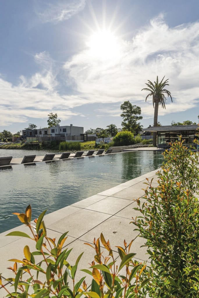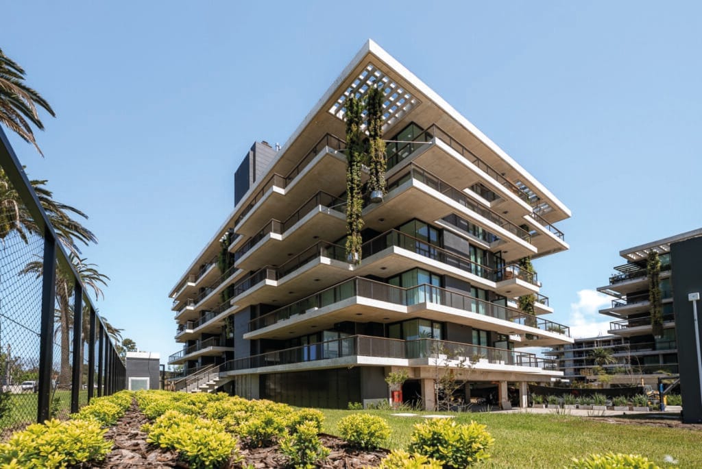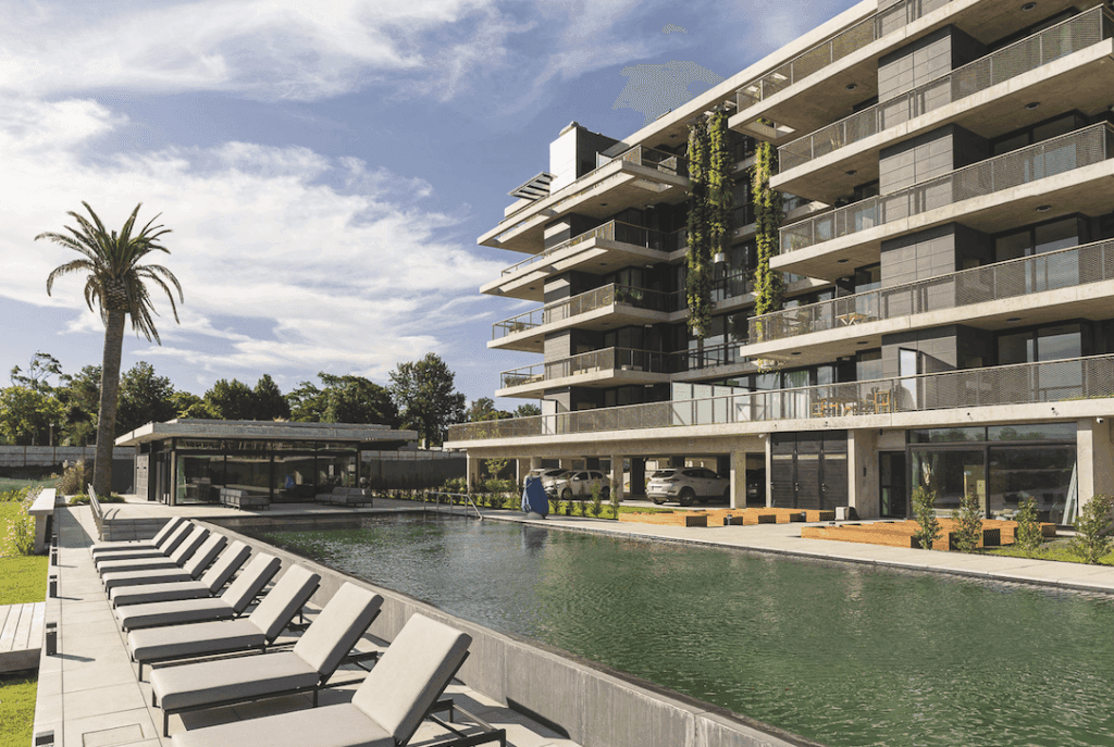 Con el paisaje hacia los lados, la naturaleza adquiere un lugar preponderante. La arquitectura de WELL, situada en el entorno de LAGOS, busca la liviandad antes que la masa, la inspiración sin bordes delimitados, sus bandejas de hormigón armado de claras líneas horizontales parecen flotar en el aire, separadas solamente por los extensos planos vidriados con perfilería de aluminio negro, que permiten expandir los horizontes de sus habitantes. La arquitectura proyectada busca desarrollar el espacio de relajación en contacto con la naturaleza, buscando un vínculo respetuoso con el ambiente para mejorar la calidad de vida. Los elementos unificadores de los tres edificios han sido, el agua, el verde y los bosques. Las ventanas de las unidades enmarcan vistas concretas del entorno, donde la posición de los árboles, y de los jardines verticales colgantes han sido cuidadosamente estudiadas para crear una disposición armoniosa. El juego de luces y sombras, entrantes y salientes dados por los amplios balcones en los que se combinan muy pocos materiales y acabados, se han diseñado con la intención de evocar la tecnología de la arquitectura tradicional contemporánea. Este proyecto muestra cómo una construcción nueva puede integrarse a la trama existente e incrementar su densidad, al mismo tiempo que utiliza técnicas constructivas pertenecientes a la tradición local, contribuyendo a la preservación del medio ambiente. El proyecto incluye el desarrollo de tres edificios bajos, separados entre sí, que se disponen en el extremo norte de un lago situado en la zona cercana al Parque Roosevelt. Visualmente, los tres edificios forman una familia, con fachadas diseñadas para dar a cada departamento su individualidad y vistas ininterrumpidas hacia el lago, hacia el Parque y hacia los frondosos jardines existentes en la zona. La distancia entre las construcciones garantiza la privacidad y las vistas desde cada punto. Los edificios fueron diseñados bajo estrictos criterios de sustentabilidad, incluyendo en los balcones y terrazas la generación de sombras sobre los planos verticales, evitando así el deslumbramiento y la ganancia solar, integrando al interior de los departamentos los jardines aterrazados y jardines verticales colgantes. Todos los edificios bajos, tienen cubiertas superiores enjardinadas, de manera que desde cada departamento los habitantes tengan la oportunidad de ver verde en todas las direcciones.