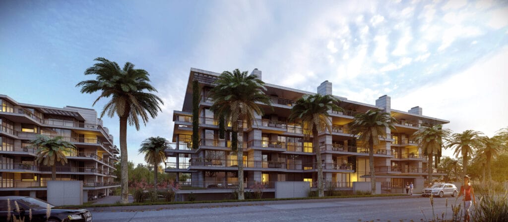 “…el diseño final se logró después de varias reuniones que mantuvimos con la empresa Desarrolladora y las autoridades de la Intendencia Municipal de Canelones. Finalmente se optó por la mejor solución en términos de orientación para los apartamentos, maximizando el uso del espacio y minimizando el impacto en el paisaje. El Desarrollador estimó que este diseño fue el que logró la mejor tasa de ocupación al tiempo que liberó la planta baja e incorporó la vegetación en los edificios…”