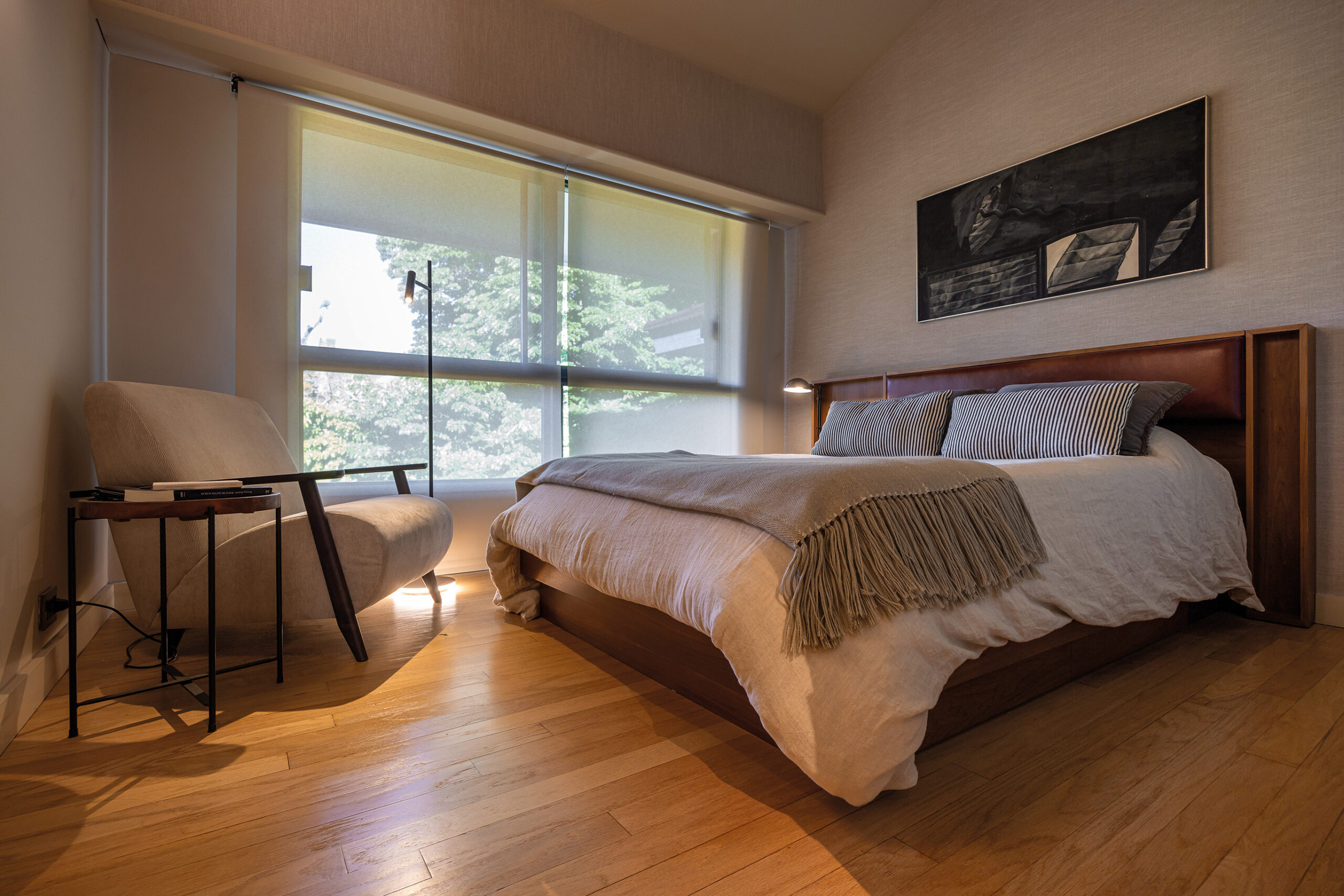 La zona de lectura y televisión plantea una atmósfera acogedora y sofisticada, donde un sofá de diseño exclusivo de Jader de Almeida, junto con una lámpara de pie de Marset y un biombo orgánico que funciona más como obra de arte que como separador, permiten una transición fluida entre el hall y el estar. Este espacio ha sido concebido para invitar a la calma y a la inmersión, reforzando la idea de un refugio cultural y estético en cada rincón. La suite principal es un tributo a la serenidad y al buen gusto, con tonos claros en lino y gamuza, cortinas de gasa de lino y mobiliario de roble, que logran una atmósfera de sutil elegancia y calidez. Las piezas de autor seleccionadas ofrecen al conjunto una cohesión inusual, donde cada elemento ha sido diseñado o elegido para aportar carácter y fluidez, evocando una estética contemporánea que, a la vez, respira autenticidad. El área exterior, concebida como una extensión natural de la propuesta de diseño, presenta sofás con cuerdas náuticas y dos bancos como piezas exclusivas del diseñador Jader de Almeida, la presencia de olivos topiarios y stipas, que añaden un toque verde y estructurado a la terraza, en perfecta sintonía con la delicadeza y modernidad del interior. Este proyecto no es sólo un ejercicio de diseño; es un manifiesto sobre la vida elegante y consciente. Cada espacio, cada material y cada objeto reflejan un compromiso con la calidad y una comprensión profunda del arte de habitar. La sinergia creativa entre los propietarios y la diseñadora permite que esta obra se desarrolle con naturalidad, consolidando un hogar que es, sin duda, tanto una obra de arte como un lugar para vivir.