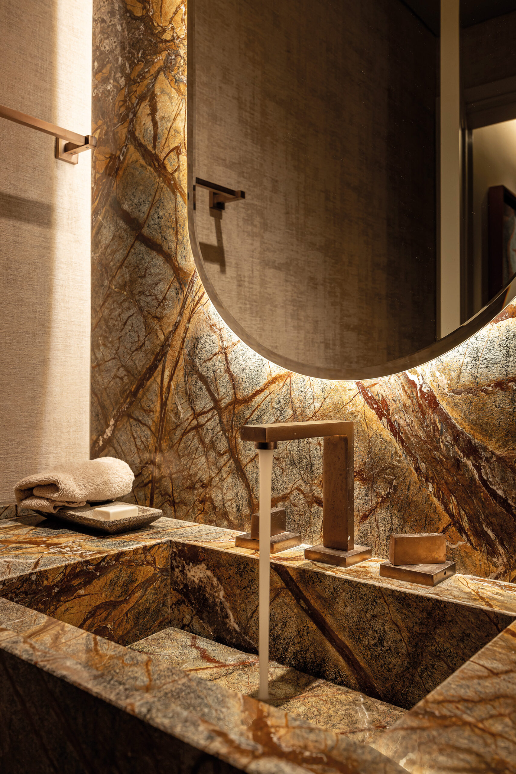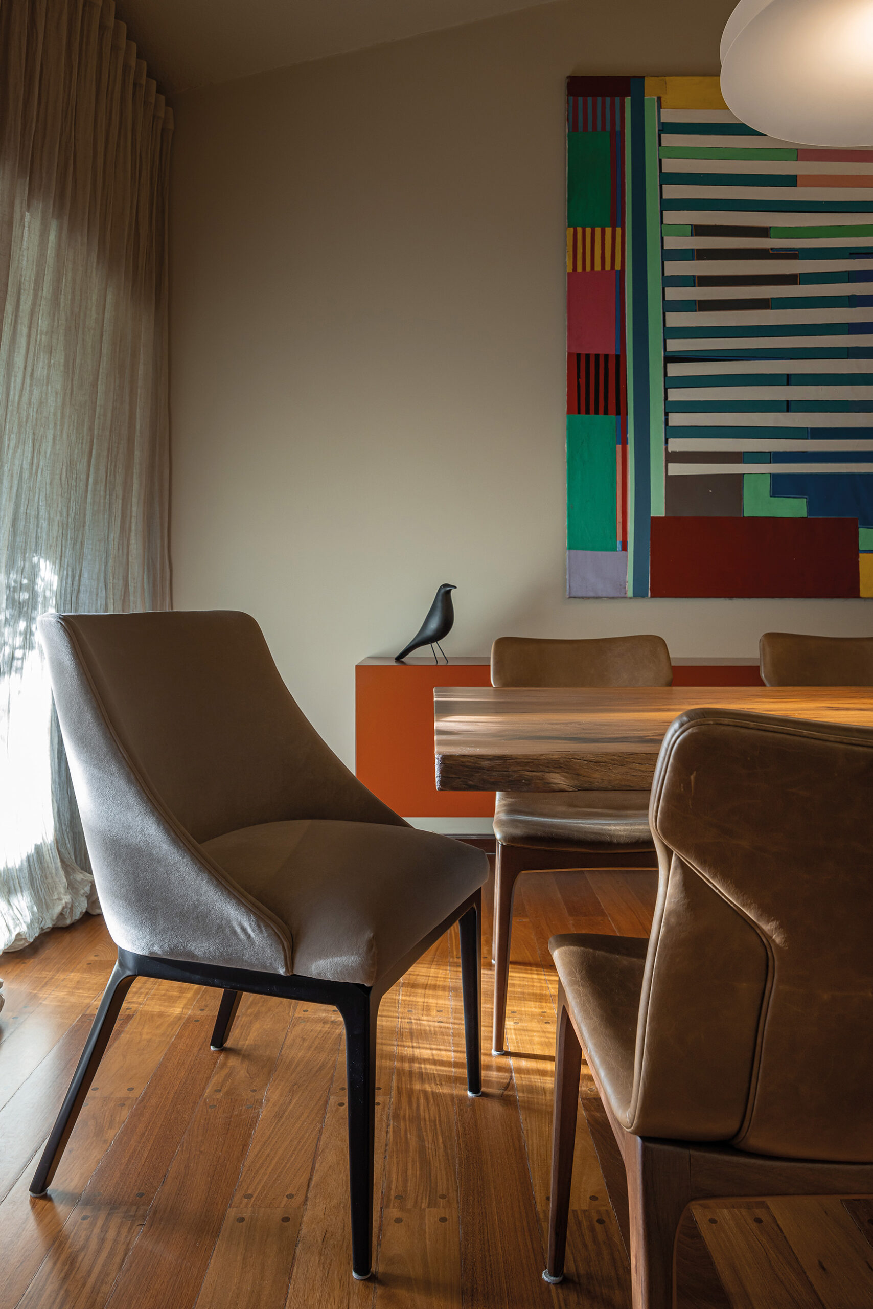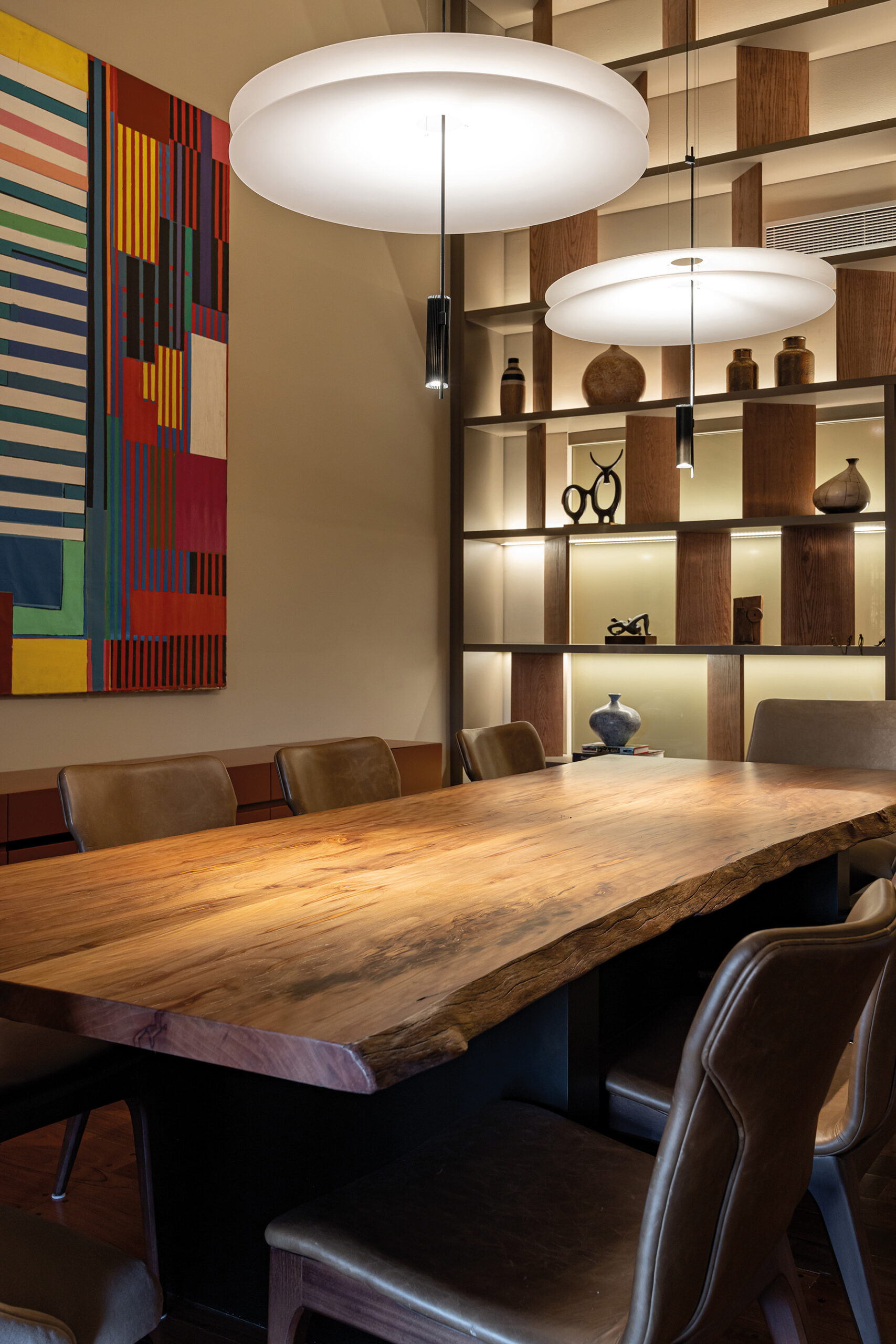 En este apartamento en el corazón de Carrasco, la intervención de la interiorista Carolina Cesio en el diseño de sus interiores es calve para lograr equilibrio entre el arte de vivir y la pasión por las obras de arte, capturando la esencia de sus propietarios: apasionados coleccionistas que encuentran en su hogar un reflejo de sus valores estéticos. Esta obra de renovación, desarrollada en colaboración se basa en un entendimiento profundo de los habitantes, donde cada elección de diseño y material responde a sus gustos y estilo de vida, proponiendo un diálogo fluido entre la funcionalidad y la contemplación. La concepción del espacio interior diseñada por Carolina Cesio revela un enfoque meticuloso en la búsqueda de materiales y detalles que transforman la estructura en un espacio vibrante. La reforma aprovechó las alturas variables de los techos y las expansiones de doble altura en áreas seleccionadas para enfatizar la espacialidad y la presencia escultórica de piezas clave. En este sentido, tres elementos destacan por su fuerte impacto visual y conceptual: la biblioteca de doble altura en el comedor, la colección de grandes luminarias suspendidas en el salón de estar y la monumental biblioteca de roble negro que define el espacio de lectura y tv, aportando un carácter sólido y sofisticado. Estas piezas no sólo cumplen funciones prácticas, sino que son obras de diseño que dotan al espacio de una personalidad única, creando puntos focales que conducen la mirada y estructuran la percepción del entorno. La selección del mobiliario y las luminarias fue realizada con un enfoque en el diseño de autor y la excelencia en los materiales, incluyendo piezas de creadores destacados. En el comedor,