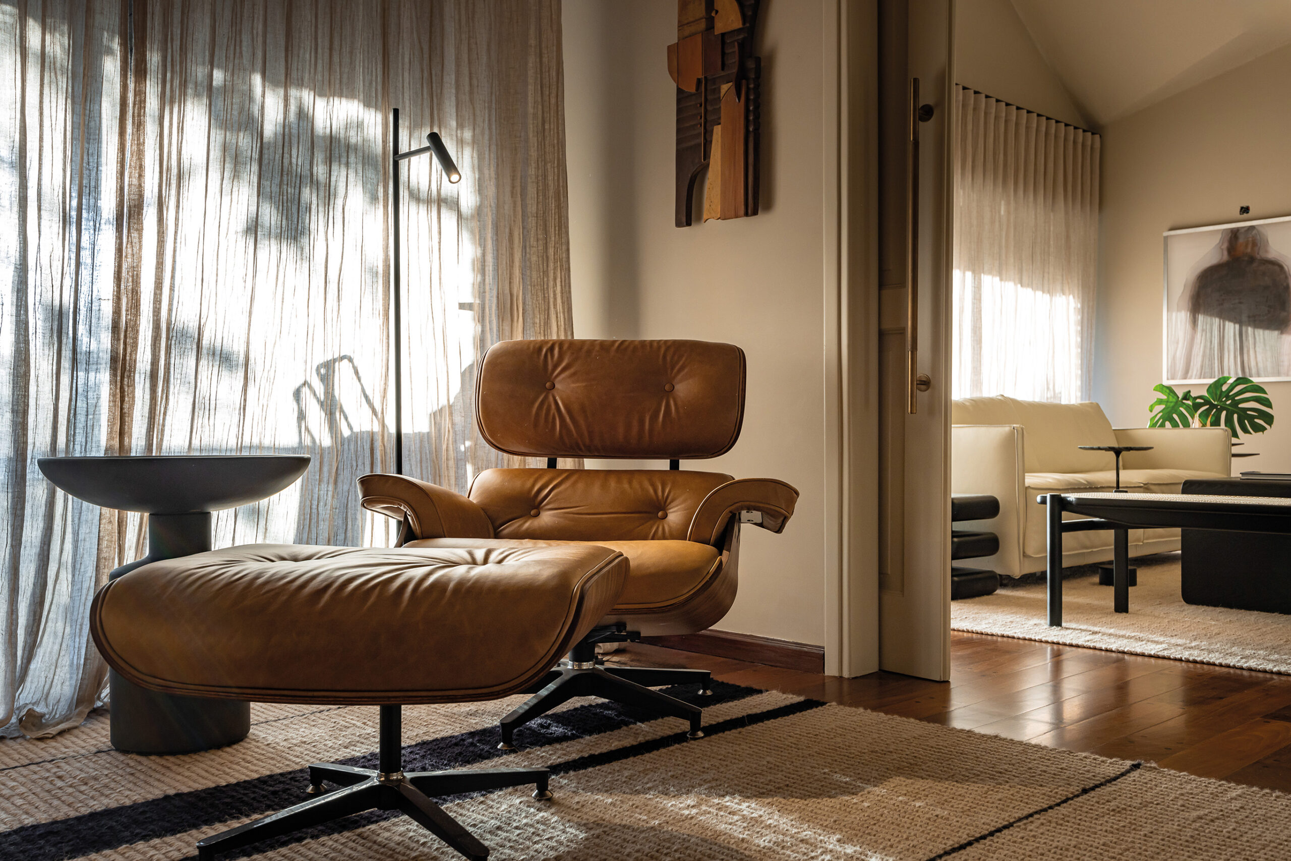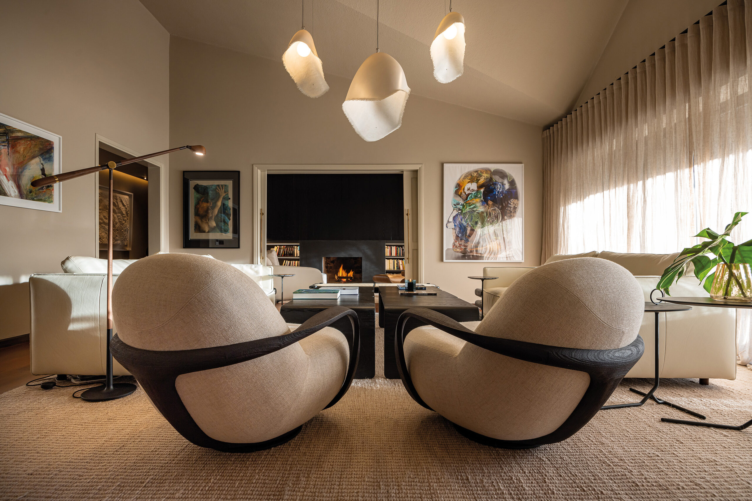 la mesa maciza de plátano y la biblioteca laqueada en roble, ambas diseño de Carolina Cesio, dialogan con las lámparas colgantes Flamingo de Antoni Arola y una obra de arte de Fernando López Lage, estableciendo un espacio que mezcla intemporalidad y modernidad. En el salón de estar, los sofás de cuero y las mesas centrales y laterales de roble negro de Krikor Abrahamian confieren un aire de sobria elegancia, complementado con las imponentes lámparas Moby Dick de Karman, que añaden un toque de dramatismo sin romper la coherencia visual.