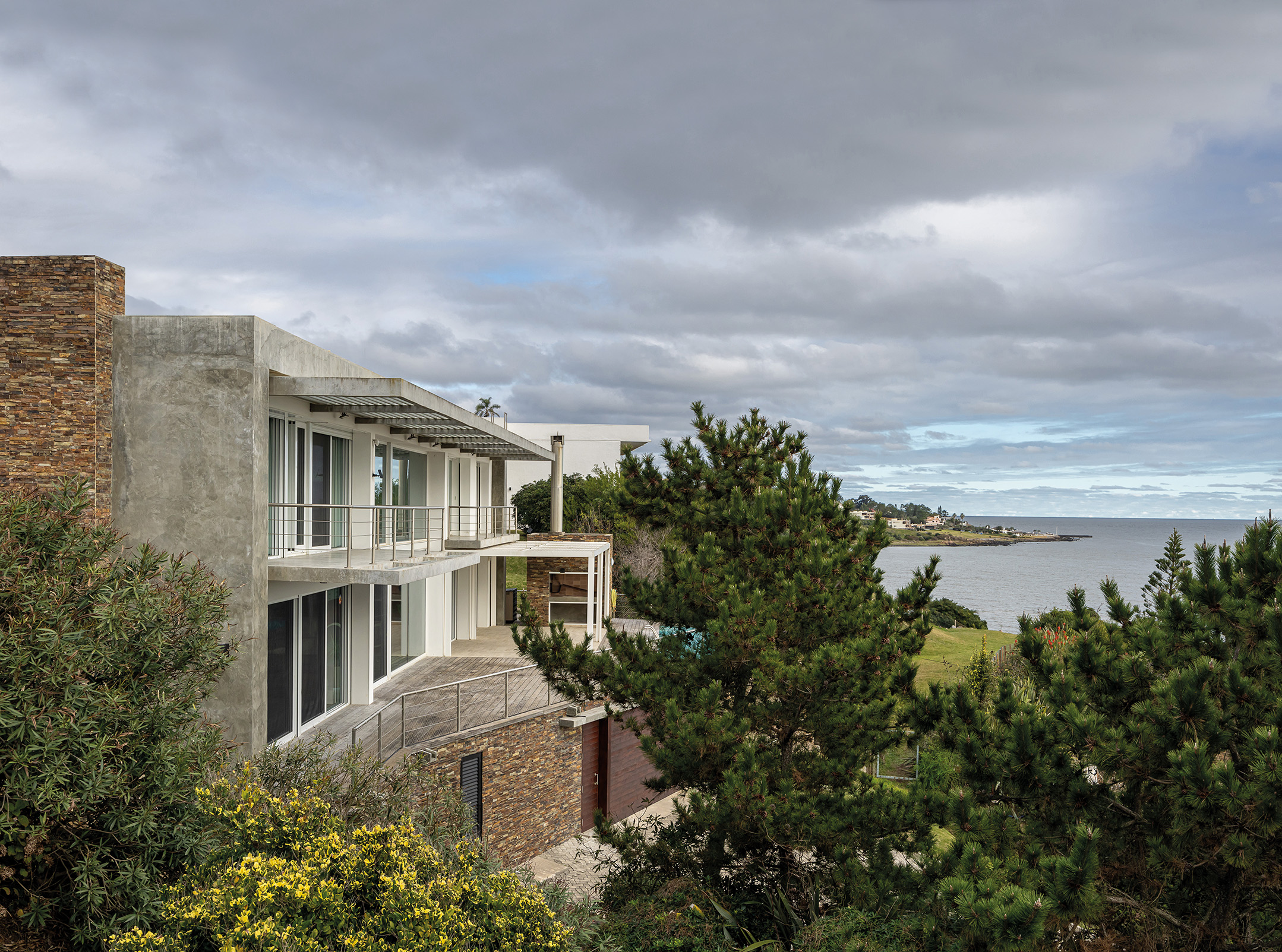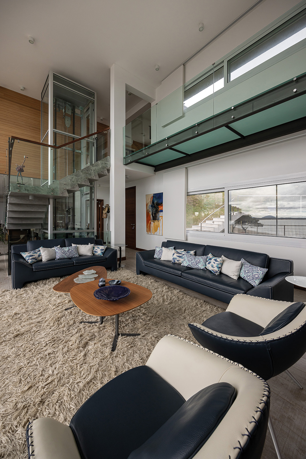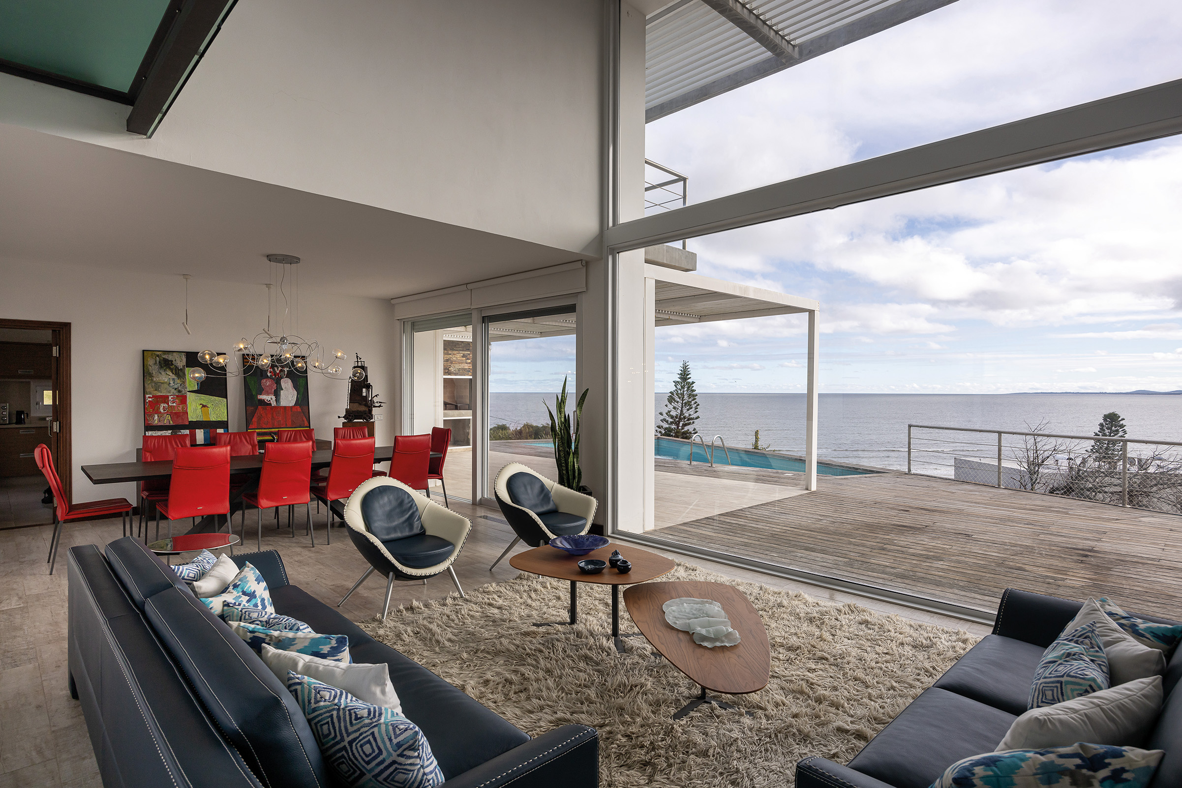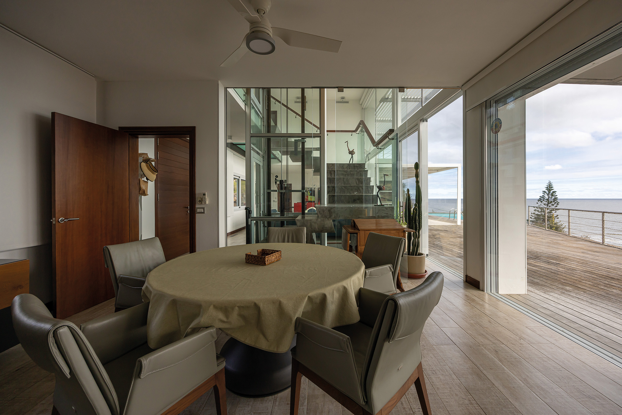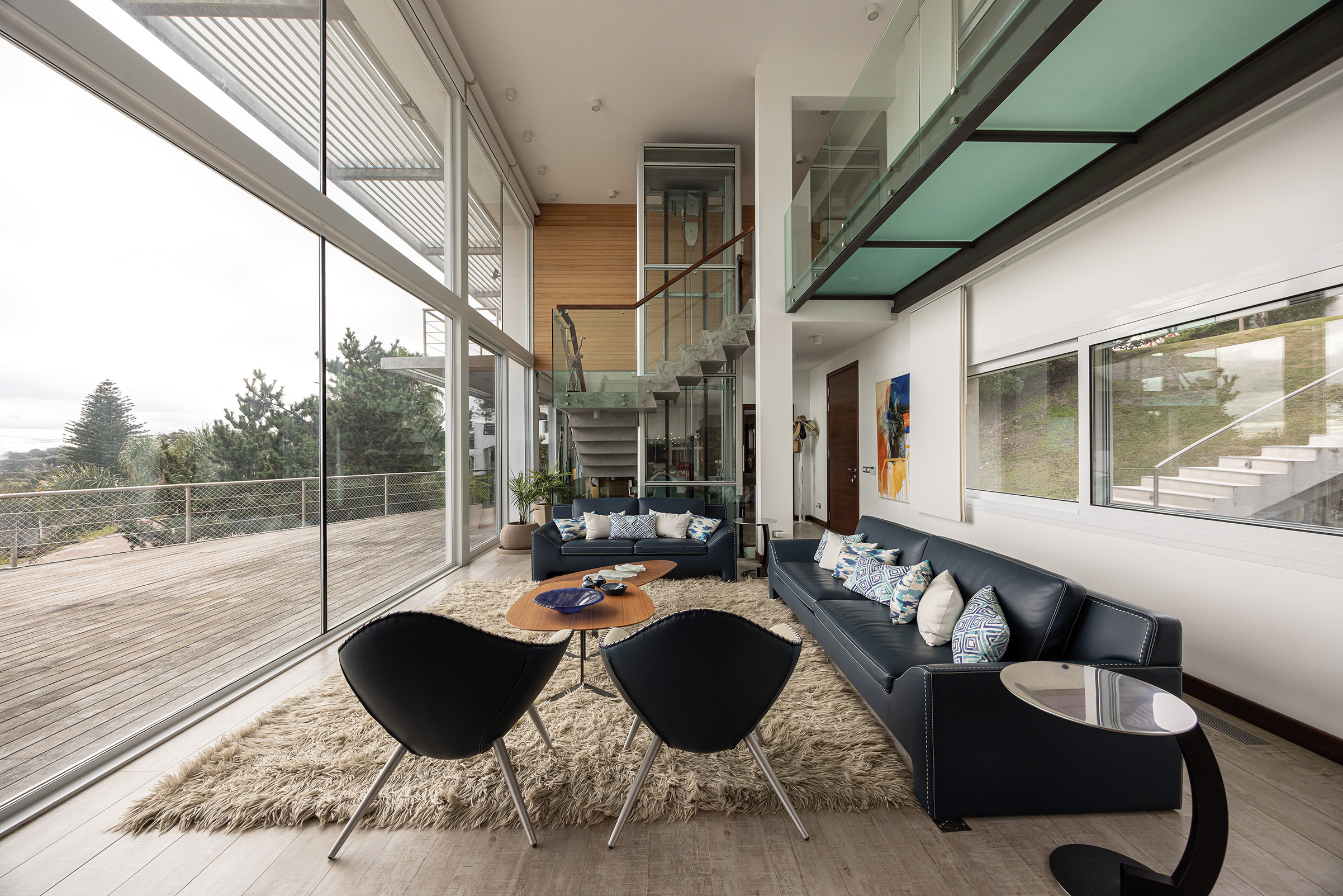 El interior de la casa se organiza en tres niveles. Al ingresar, la zona de acceso es cómoda y espaciosa, con una distribución definida por un ascensor transparente y una escalera escultural que lo rodea y envuelve. En la planta principal, un gran living orientado hacia las vistas al océano se dispone como el corazón de la casa. Este espacio se beneficia de una doble altura y está contenido por grandes ventanales que conectan permanentemente el interior con el exterior. La escena se completa con un comedor que acompaña el ambiente, y una cocina amplia y cómoda, dispuesta de forma apartada para mayor privacidad. En la planta alta, el volumen liberado que sobresale en la fachada resuelve la espacialidad para generar una sala que funciona como escritorio. Este continúa en una de sus alas con una serie de dormitorios, mientras que, en la otra ala, comunicada por un puente que vuela sobre el doble volumen del living, se encuentra la suite principal. En el lado opuesto, una terraza dispuesta de forma lineal sigue el mismo recorrido y conecta los distintos dormitorios, ofreciendo vistas panorámicas hacia el océano.