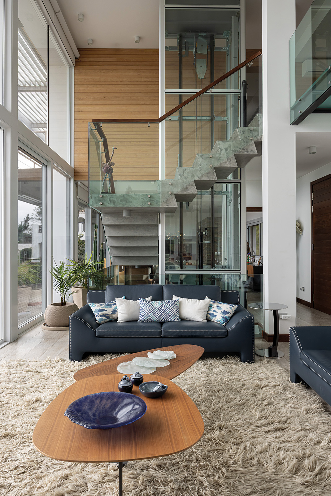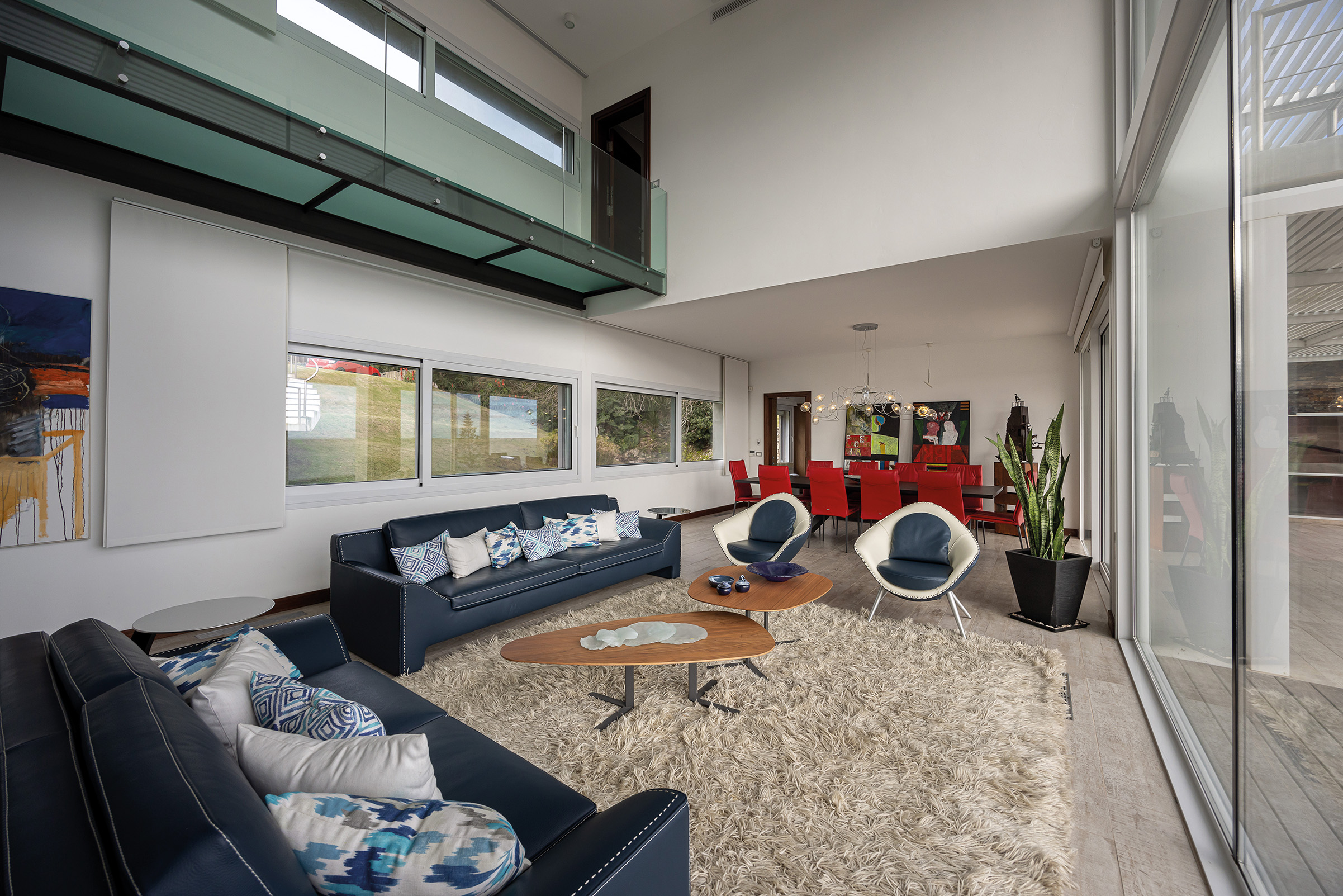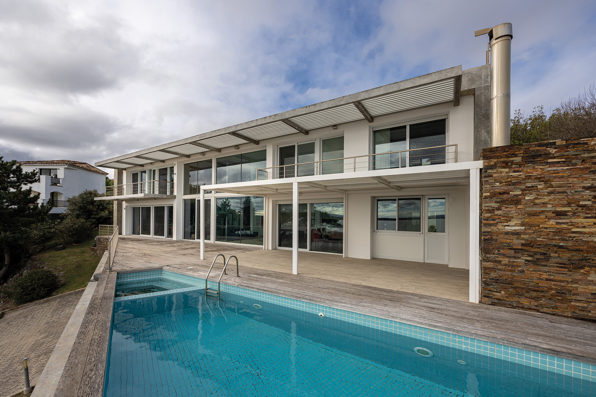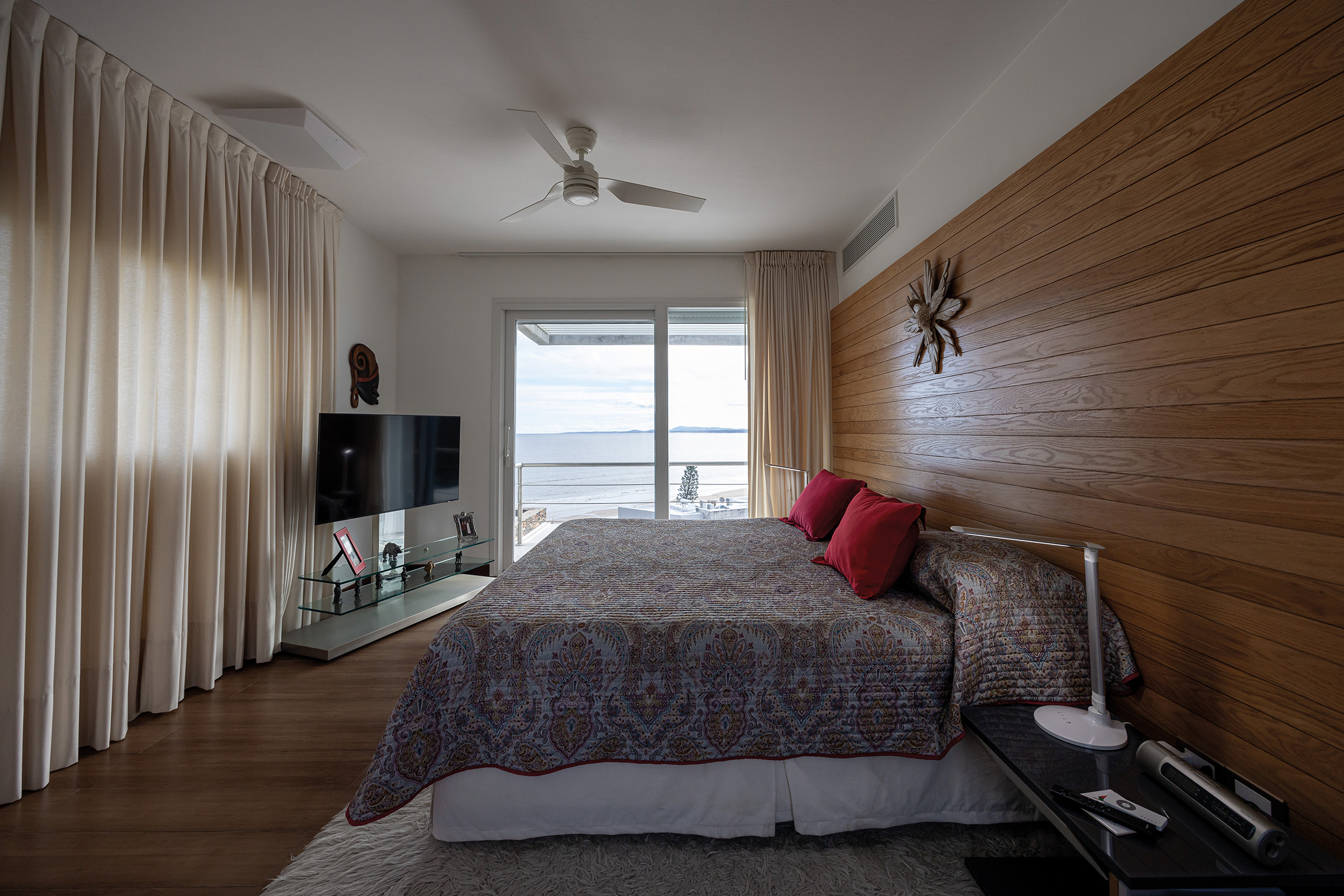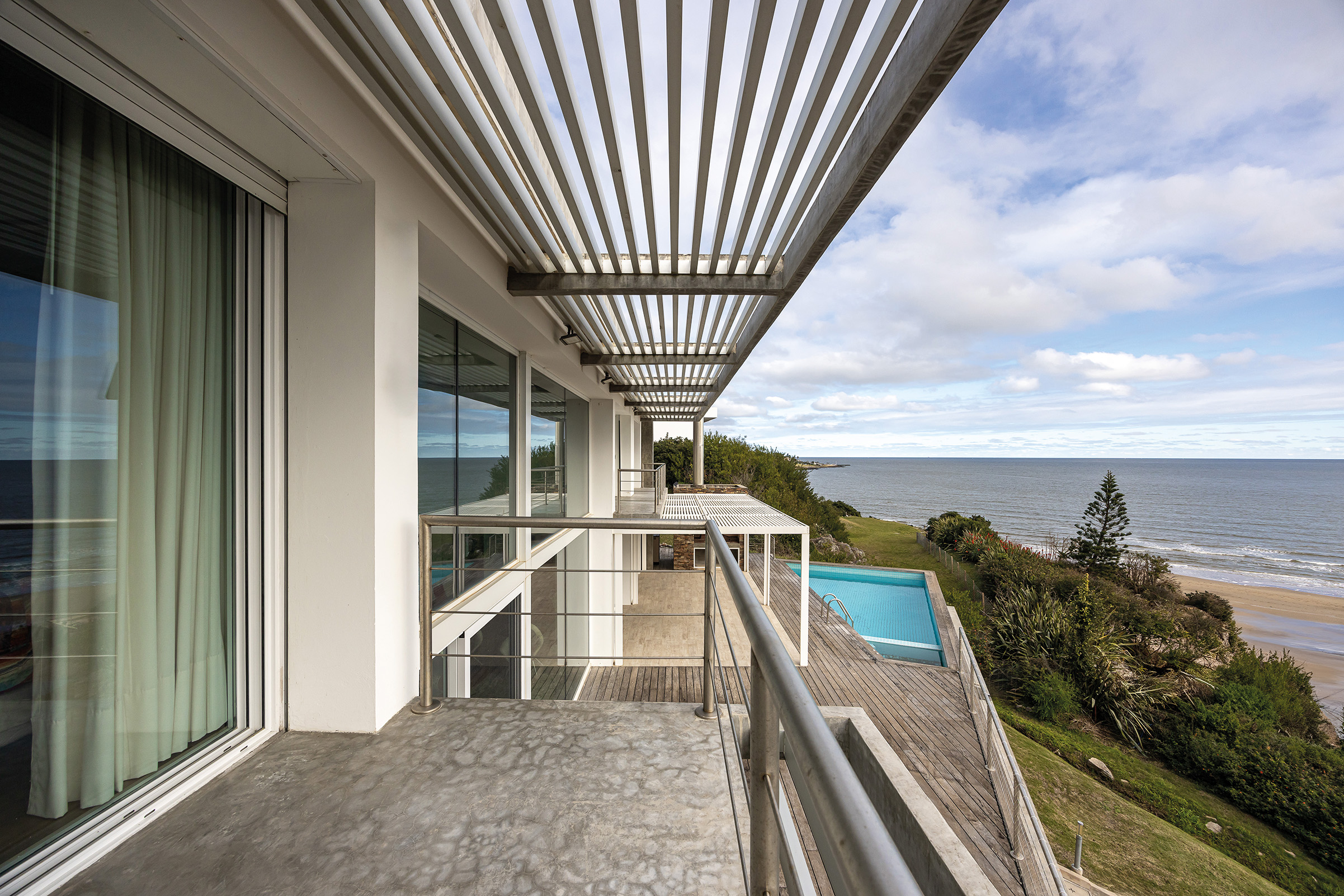 El interior de la casa se organiza en tres niveles. Al ingresar, la zona de acceso es cómoda y espaciosa, con una distribución definida por un ascensor transparente y una escalera escultural que lo rodea y envuelve. En la planta principal, un gran living orientado hacia las vistas al océano se dispone como el corazón de la casa. Este espacio se beneficia de una doble altura y está contenido por grandes ventanales que conectan permanentemente el interior con el exterior. La escena se completa con un comedor que acompaña el ambiente, y una cocina amplia y cómoda, dispuesta de forma apartada para mayor privacidad. En la planta alta, el volumen liberado que sobresale en la fachada resuelve la espacialidad para generar una sala que funciona como escritorio. Este continúa en una de sus alas con una serie de dormitorios, mientras que, en la otra ala, comunicada por un puente que vuela sobre el doble volumen del living, se encuentra la suite principal. En el lado opuesto, una terraza dispuesta de forma lineal sigue el mismo recorrido y conecta los distintos dormitorios, ofreciendo vistas panorámicas hacia el océano.