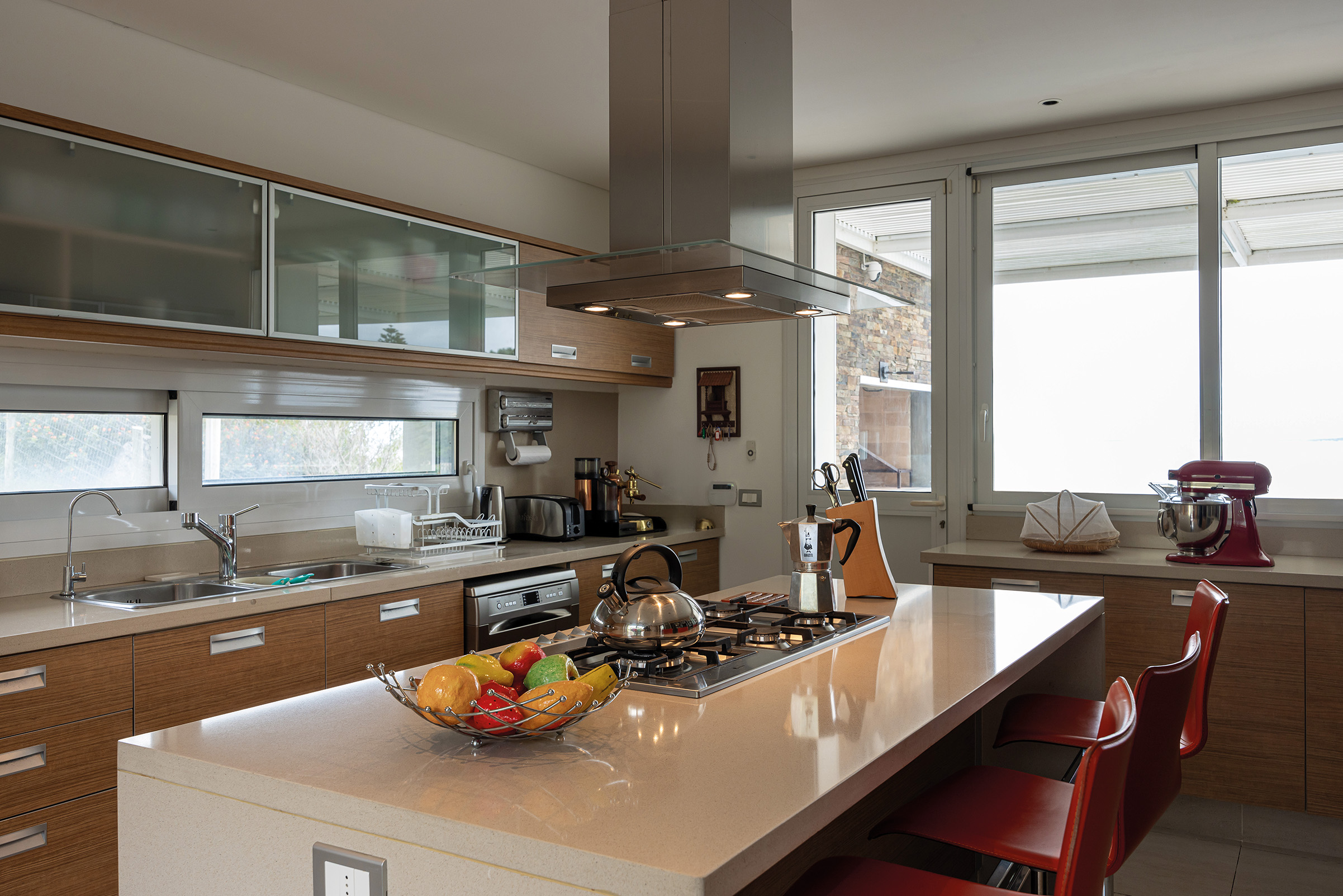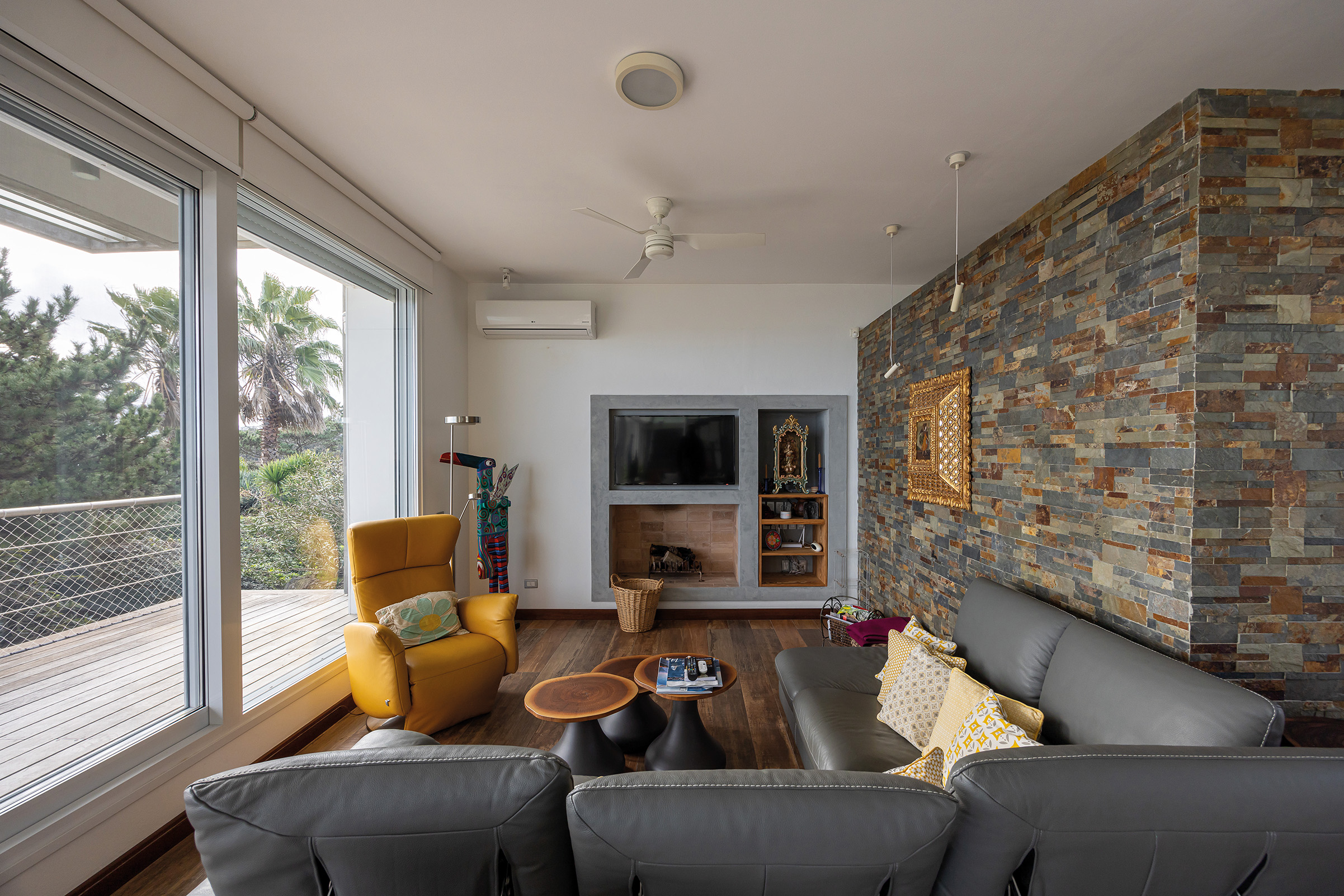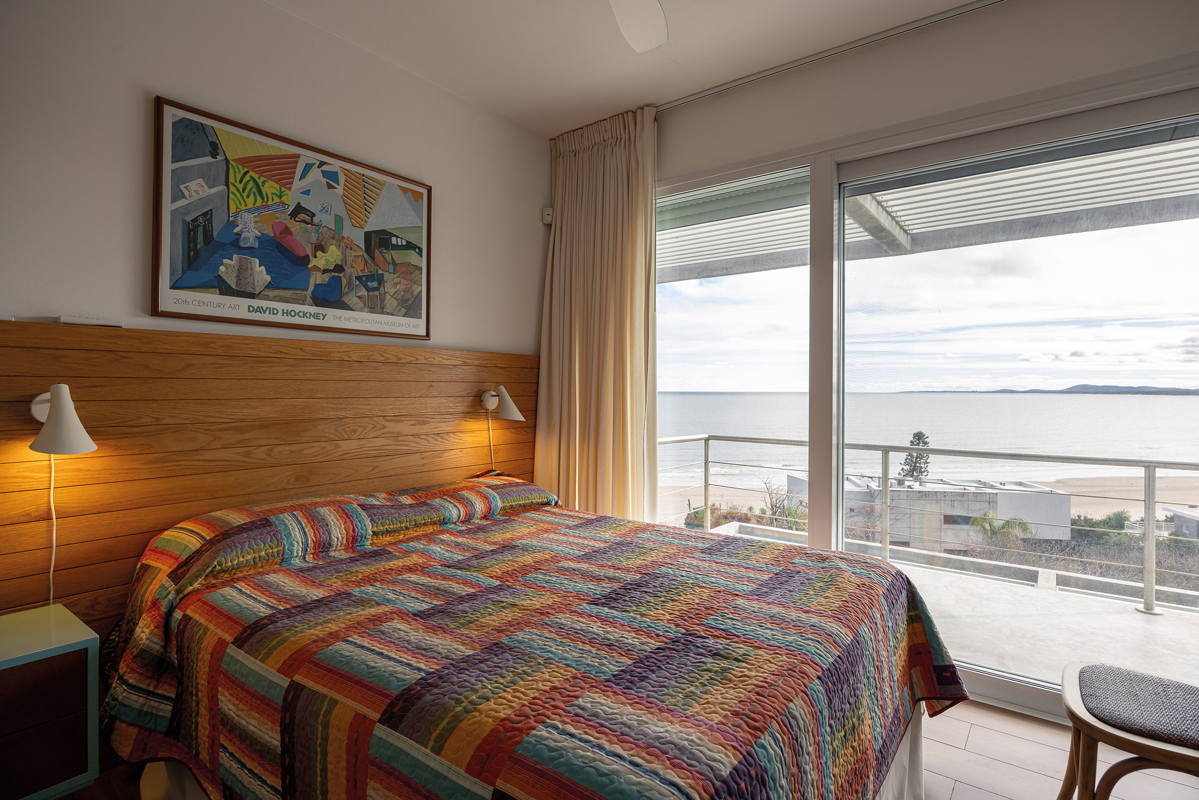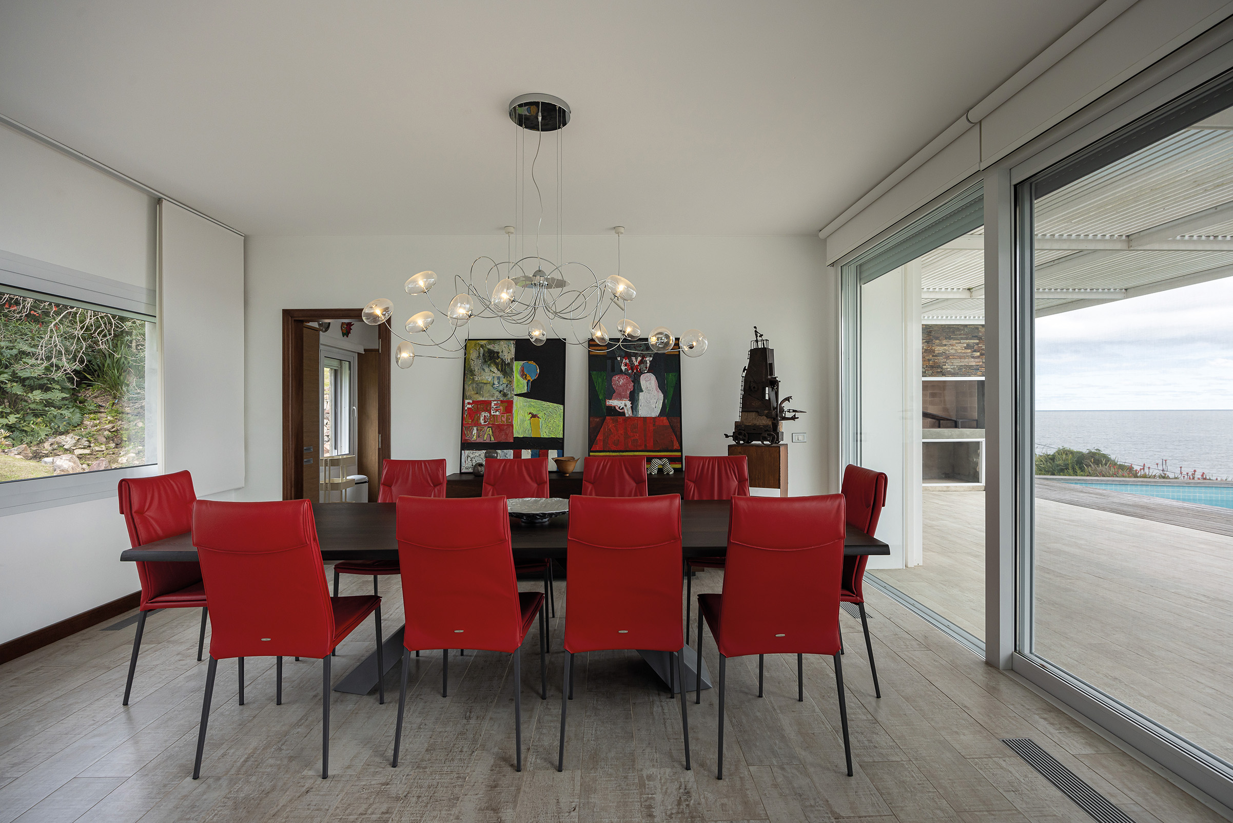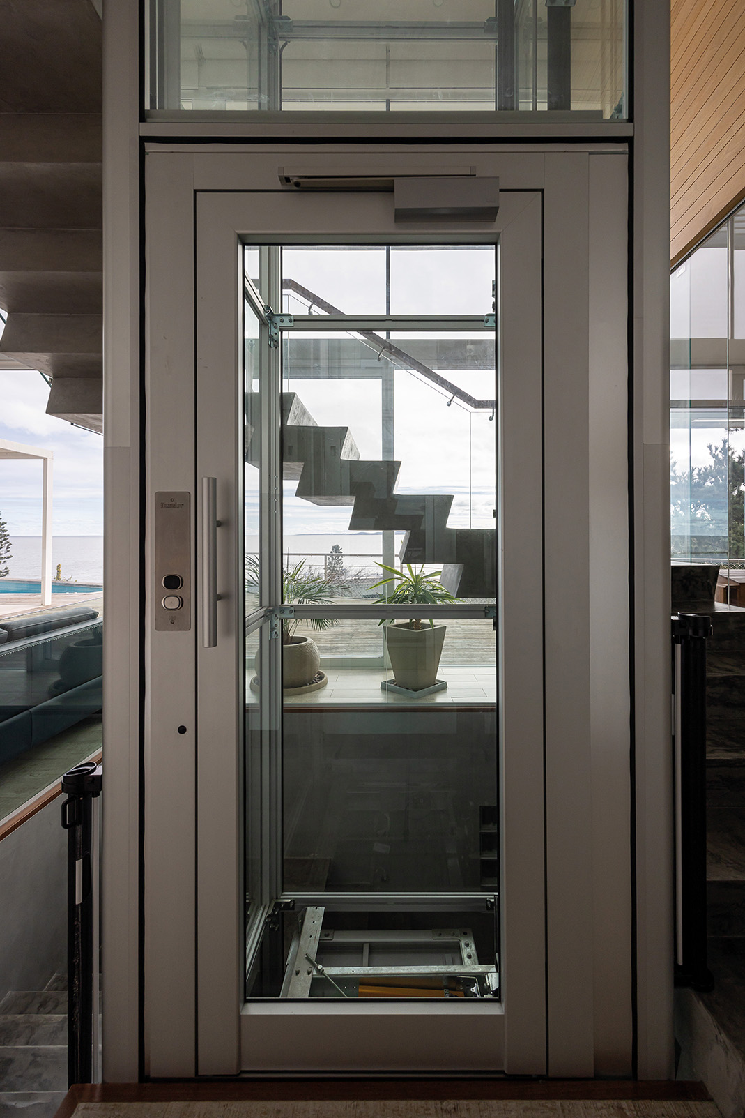 El interior de la casa se organiza en tres niveles. Al ingresar, la zona de acceso es cómoda y espaciosa, con una distribución definida por un ascensor transparente y una escalera escultural que lo rodea y envuelve. En la planta principal, un gran living orientado hacia las vistas al océano se dispone como el corazón de la casa. Este espacio se beneficia de una doble altura y está contenido por grandes ventanales que conectan permanentemente el interior con el exterior. La escena se completa con un comedor que acompaña el ambiente, y una cocina amplia y cómoda, dispuesta de forma apartada para mayor privacidad. En la planta alta, el volumen liberado que sobresale en la fachada resuelve la espacialidad para generar una sala que funciona como escritorio. Este continúa en una de sus alas con una serie de dormitorios, mientras que, en la otra ala, comunicada por un puente que vuela sobre el doble volumen del living, se encuentra la suite principal. En el lado opuesto, una terraza dispuesta de forma lineal sigue el mismo recorrido y conecta los distintos dormitorios, ofreciendo vistas panorámicas hacia el océano.
