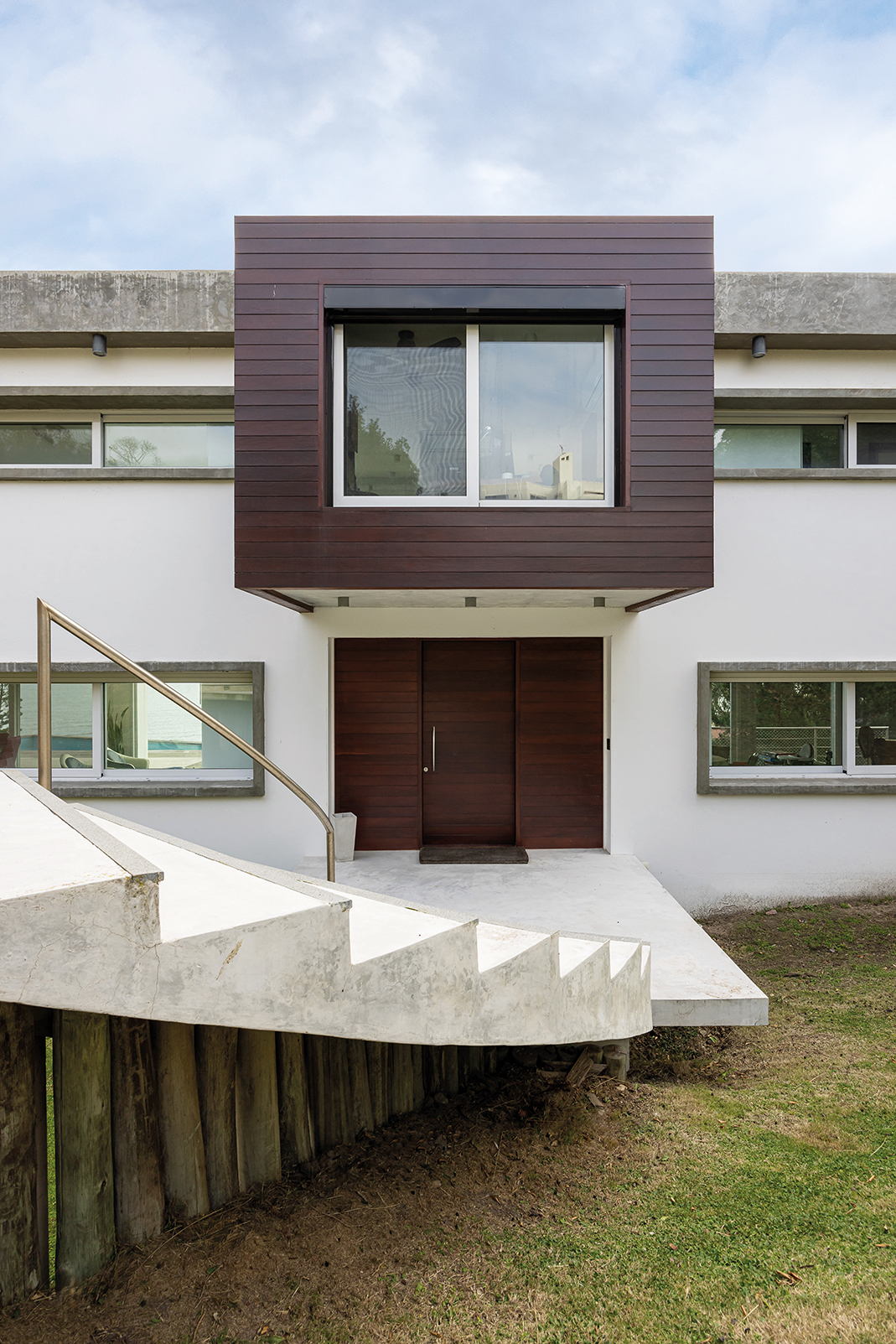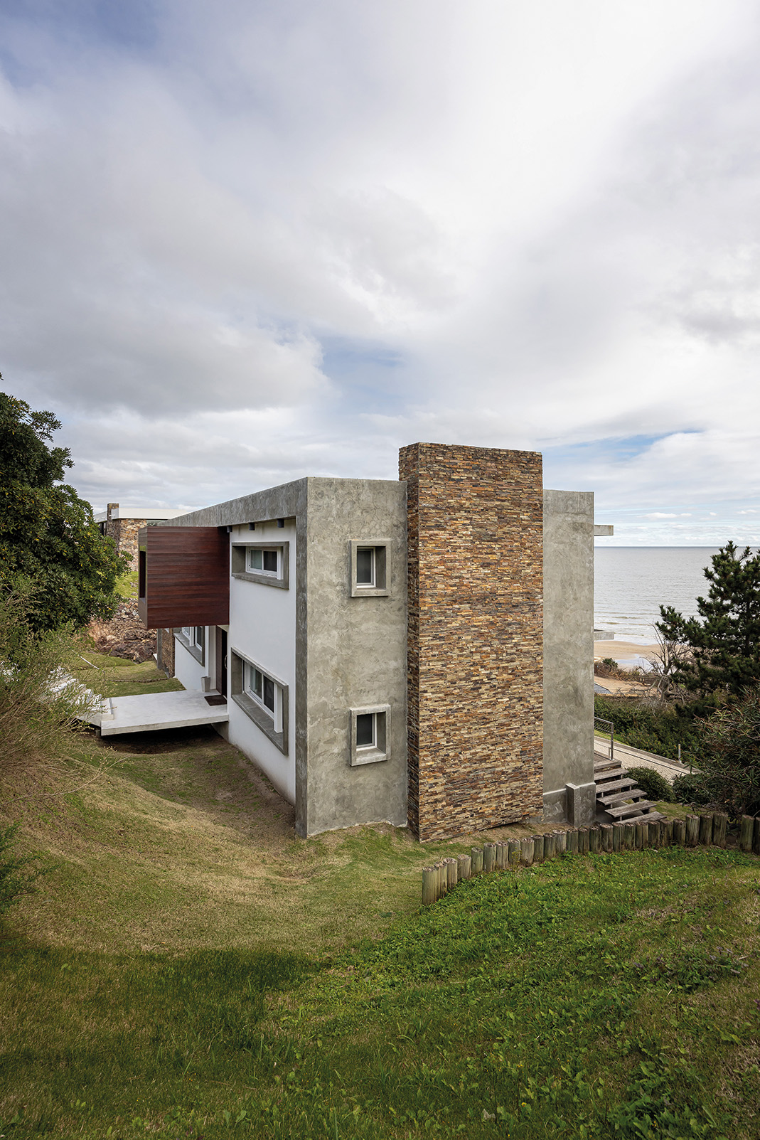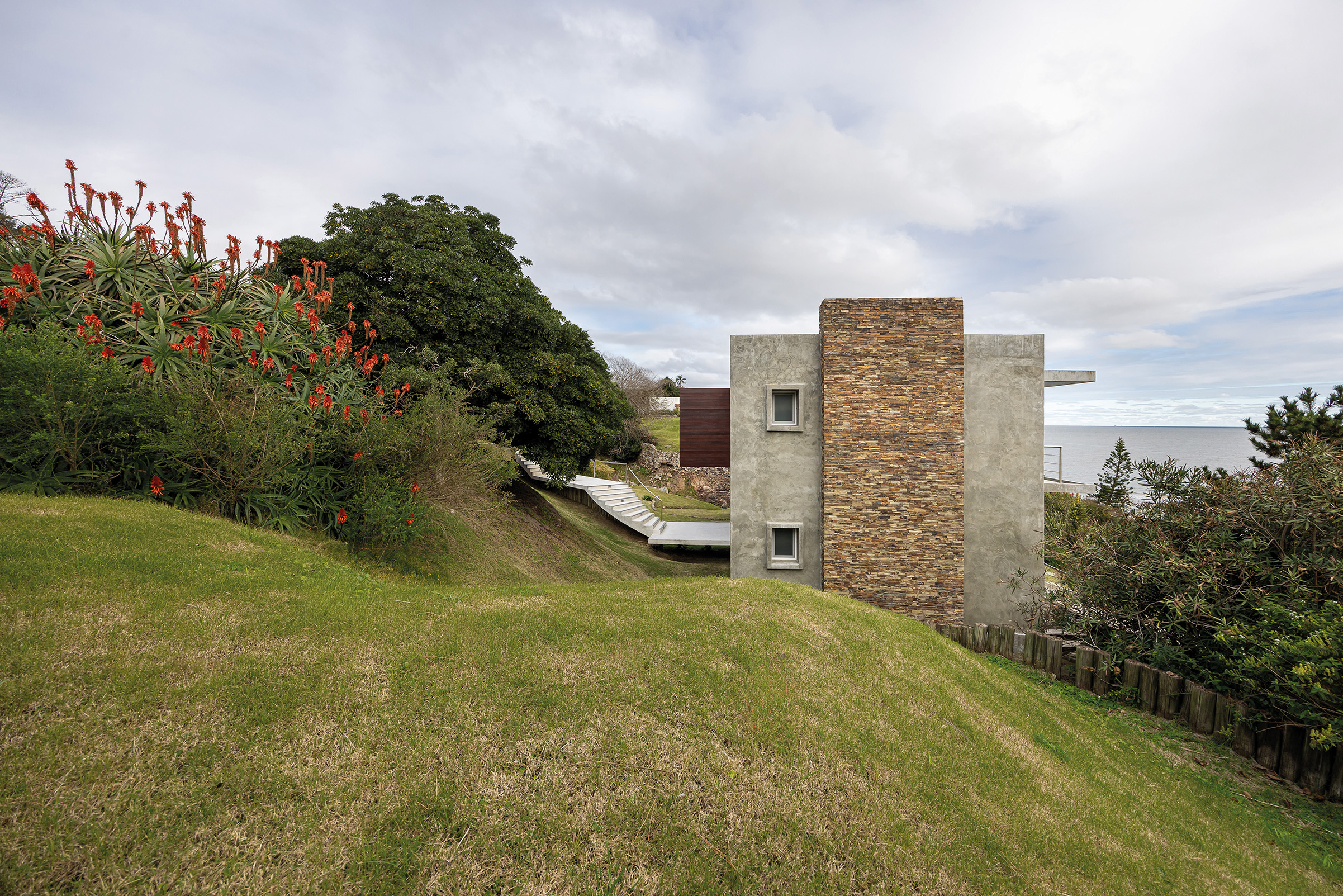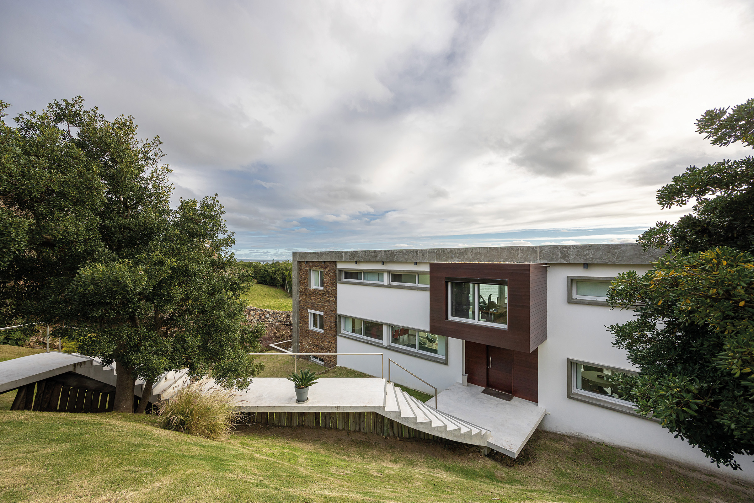 El acceso a la casa se realiza a través de un gran sendero de hormigón que sigue la pendiente del terreno en profundidad hasta llegar al ingreso. Este ingreso se resuelve con un volumen cúbico de madera que sobresale de la fachada lineal en la planta alta, marcando claramente el acceso a la vivienda. La fachada principal, dispuesta en forma diagonal al terreno para un mejor aprovechamiento espacial, sigue el recorrido de la piedra y está definida por un gran contorno de hormigón que marca el gesto arquitectónico. También incorpora materiales orgánicos, como el revestimiento de piedra en uno de sus sectores laterales, que acompañan la esencia del entorno y aportan robustez y contundencia a la estructura.