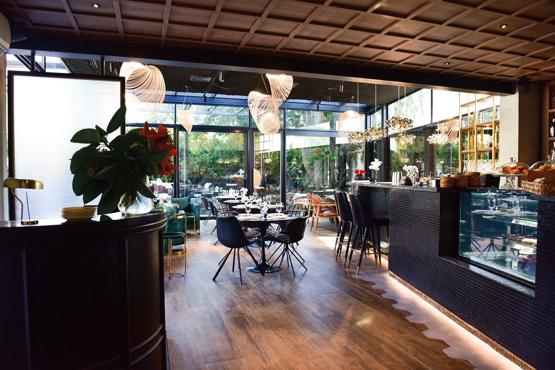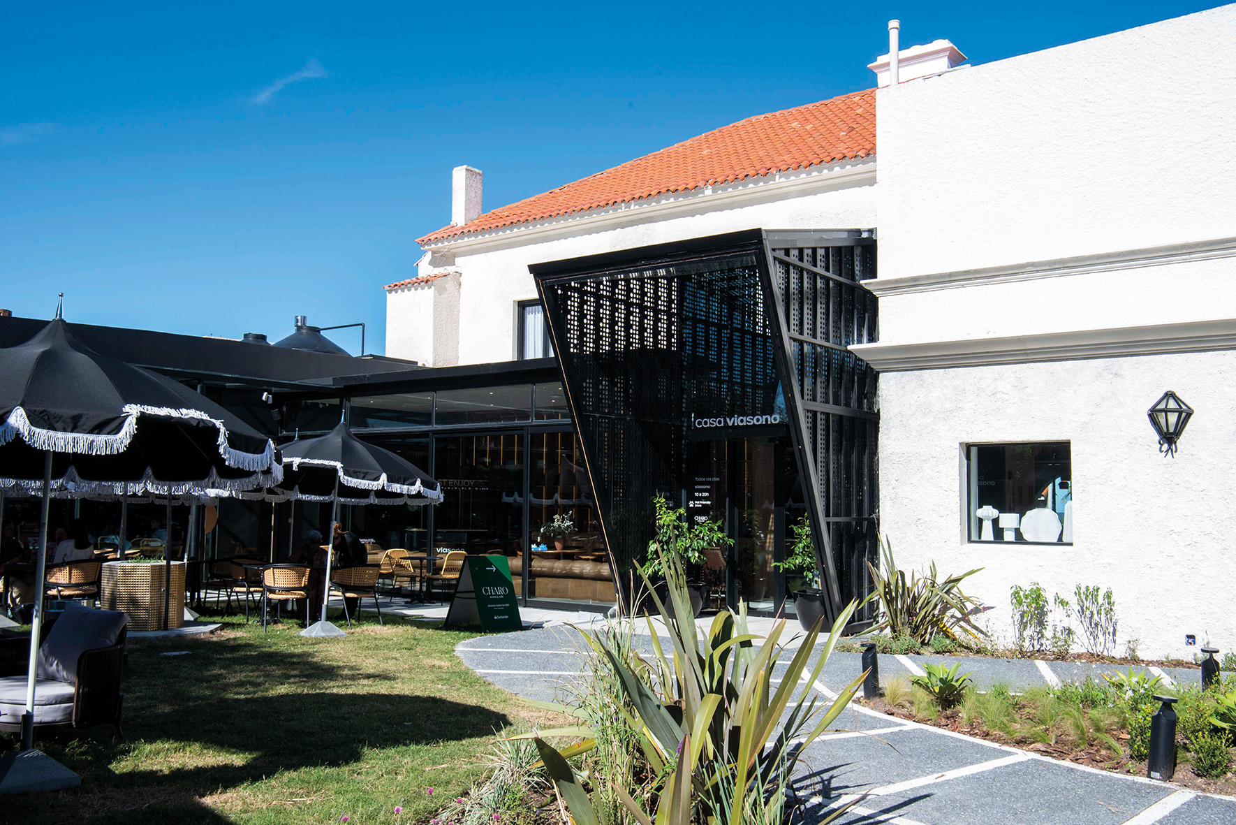 para el buen dormir, y a la ciudad le regala un espacio que eleva el nivel y la coloca a la par de las más importantes capitales del mundo. CASA VIASONO se instala en una de las grandes casonas de la zona, proyectada y construida por el Arquitecto Raúl Faget, en el año 1936. La esquina que ocupa sobre la Rambla República de México adquiere especial relevancia y luego de años de ser reconocida como sede de la Embajada del Perú en nuestro país, ahora se abre literalmente hacia ambas calles induciendo una visita. El proyecto arquitectónico revisado y supervisado por el Estudio Kopel Sánchez generó la intervención de UNA STUDIO y del equipo de diseño de VIASONO, con un marcado carácter europeo, estableciendo un acceso por el jardín posterior enmarcado por una potente estructura de metal que luego se repite en un ala que se agrega, también sobre el jardín, para contener a CHARO, un bistró que funciona durante todo el día. La intervención enseña un nivel de refinamiento estético y conceptual poco habitual entre nosotros. La conjunción de talentos a la hora de materializar el sueño de Noelia Copíz despunta como una novedad a tener en cuenta.