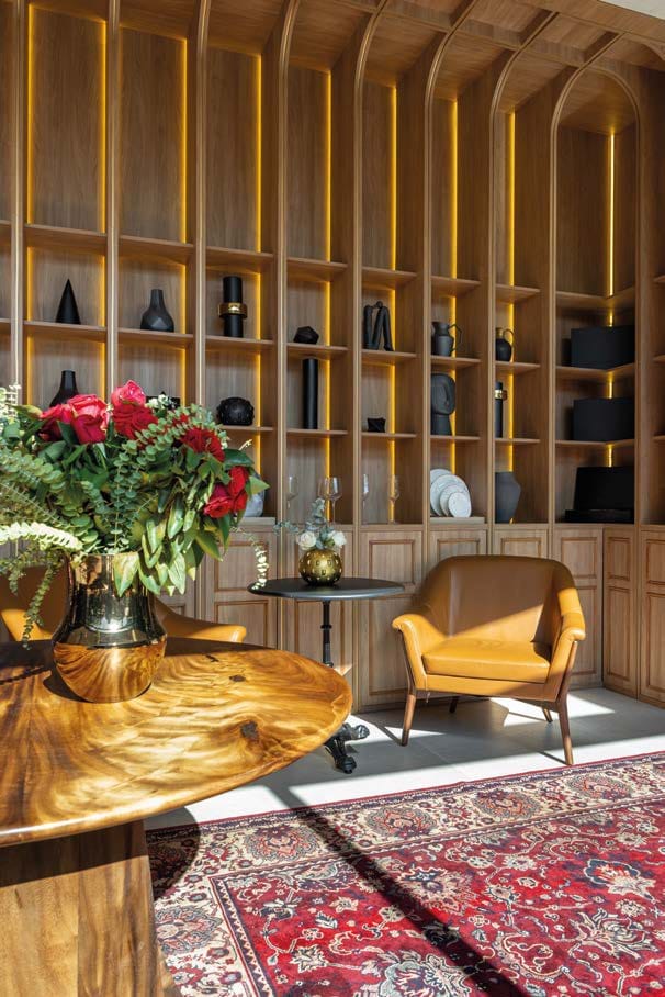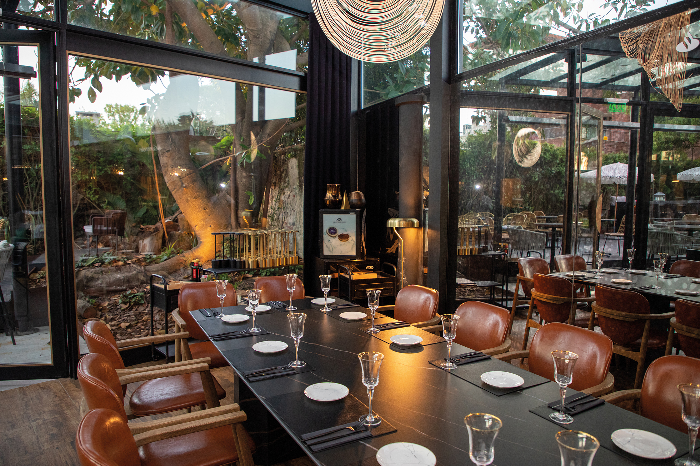 Luego debimos resolver el acceso, y en eso no teníamos dudas, éste debía representar la monumentalidad y la contemporaneidad de la propuesta. Diseñamos un pórtico de acceso en doble altura de chapa perforada donde la luz genera distintos escenarios a lo largo del día. Una pieza liviana, etérea que se une y dialoga a la perfección con la construcción existente, sólida y contundente. Se sumaron cielorrasos, que guían el recorrido por la casa y albergan las nuevas instalaciones. Para vincular los espacios en planta alta y generar una planta libre se debió reforzar la cubierta (cercha) existente. Gran desafío, trabajo que realizamos en conjunto con estudio del Ing. Magnone. El proyecto es accesible, cuenta con un ascensor vidriado. Charo, el restaurant, con su propuesta natural de productos de la huerta cosechados en el propio jardín, debía vincularse al máximo con el espacio exterior de la vivienda por ello la ampliación se diseña como un volumen vidriado, que se abre y comunica al máximo con ese espacio. La propuesta de paisajismo es muy ambiciosa también. El diseño estuvo a cargo de Foresta. Se preservaron elementos existentes: palmeras, eucaliptus y un gran gomero que se integran a la nueva propuesta.