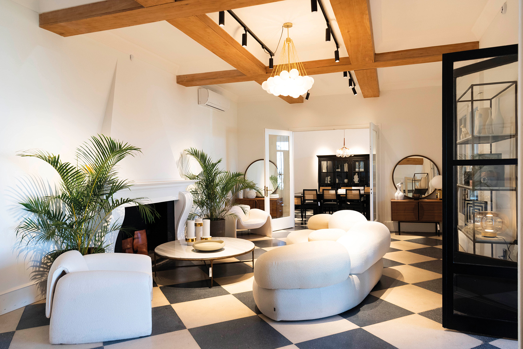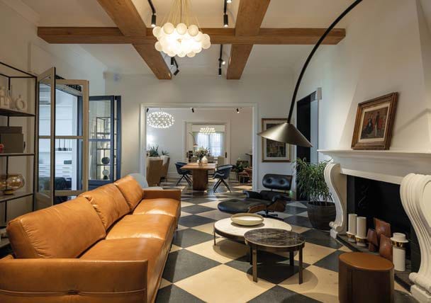 La casa, de líneas clásicas que evolucionan el concepto de chalet que predominaba en la época en Carrasco, ha sido recuperado y restaurado con lo cual opera como una caja que impone una fuerte presencia estética. El equipamiento que la equipa ahora genera un diálogo contrastante que permite un mayor y mejor lucimiento de cada una de las piezas. El necesario equipamiento comercial está, pero no es tal. Imponentes estructuras de madera clara revisten paredes generando los nichos correspondientes para exhibir piezas o complementos. El ingreso a la casa resulta en un recorrido que recuerda los halls de acceso a un hotel en Londres, París o Nueva York. Hacia un lado nos conduce hacia el bistró, hacia el otro al inicio de un recorrido por los distintos ambientes que exhiben mobiliario. Todo impregnado por una atmósfera donde el diseño apela a todos los sentidos.