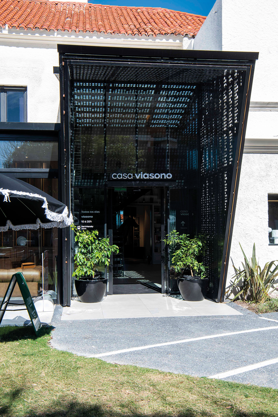 …cuando Fabián y Sebastián nos invitan a participar en este proyecto sabíamos que era un gran desafío. Nos encontramos con una casa original de 1936, del arquitecto Raúl Faget, ubicada en Carrasco, una zona protegida de Montevideo, sobre la Rambla, a una cuadra del Sofitel. El programa “mixed used”: un local comercial de una marca reconocida como Viasono y un restaurante que tenía su alma definida. Las premisas que teníamos claras desde el anteproyecto eran los valores de la marca, la importancia del home wellness en todo su esplendor: bienestar en todos los aspectos de la vida, el descanso como sinónimo de salud. A eso debíamos agregar la presencia del diseño; de la tecnología de avanzada y la innovación. Todo esto conviviendo en un escenario cautivante: una casa patrimonial, en un barrio emblemático y lleno de historia. Sin duda un enorme desafío que confiábamos podía dar un resultado sorprendente. La superficie del terreno es de 3200 m2 y actuamos en 950 m2 construidos y 1600 m2 de jardín y espacios exteriores. Las primeras líneas de trabajo, en conjunto con el estudio Kopel Sánchez, fueron las más complejas de definir. El proyecto debía respetar el espíritu de la casa original. Restauramos y protegimos los pisos de monolítico en damero y de pinotea, las aberturas de madera y sus herrajes, también revalorizamos las molduras existentes. Respetamos las galerías existentes, colonizándolas pero sin tocar las líneas originales de los arcos de fachada. Al recorrer la tienda, cuya propuesta propone vivir y disfrutar a pleno los espacios de nuestro hogar, se debía sentir lo que fue la vivienda en su época de oro, cuando vivía una familia en tantos metros cuadrados. Se debían seguir apreciando las galerías, la gran altura, los materiales nobles originales. Con estos lineamientos las decisiones se fueron ahora dando de manera más ágil. Para comenzar definimos que la mejor forma de acceder era por la calle Puntas de Santiago, no por la Rambla (donde hoy la velocidad de circulación es otra). Así la propia casa protegería a los visitantes de los vientos del sur. También pesó en esta decisión la idea de recorrer el jardín (pieza que luego tendrá mucho protagonismo en el proyecto) antes de ingresar.