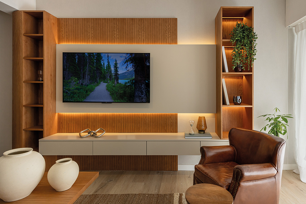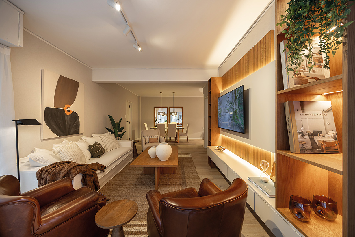 La intervención de Cecilia partió de una estructura reformada en la cocina y los baños, lo que le permitió enfocar su propuesta en las áreas sociales y los dormitorios, buscando crear una continuidad estética que enfatizara calidez y accesibilidad. En este contexto, el cuarto de estar se erige como el corazón de la vivienda. Duque decidió conectar visualmente el área de estar con el comedor a través de un empapelado texturizado en tono beige, que genera una unidad espacial suave sin crear barreras visuales, promoviendo un flujo natural en el uso del espacio. Esta decisión no solo aporta coherencia visual, sino que también facilita la movilidad, un aspecto crucial en el diseño para personas mayores.