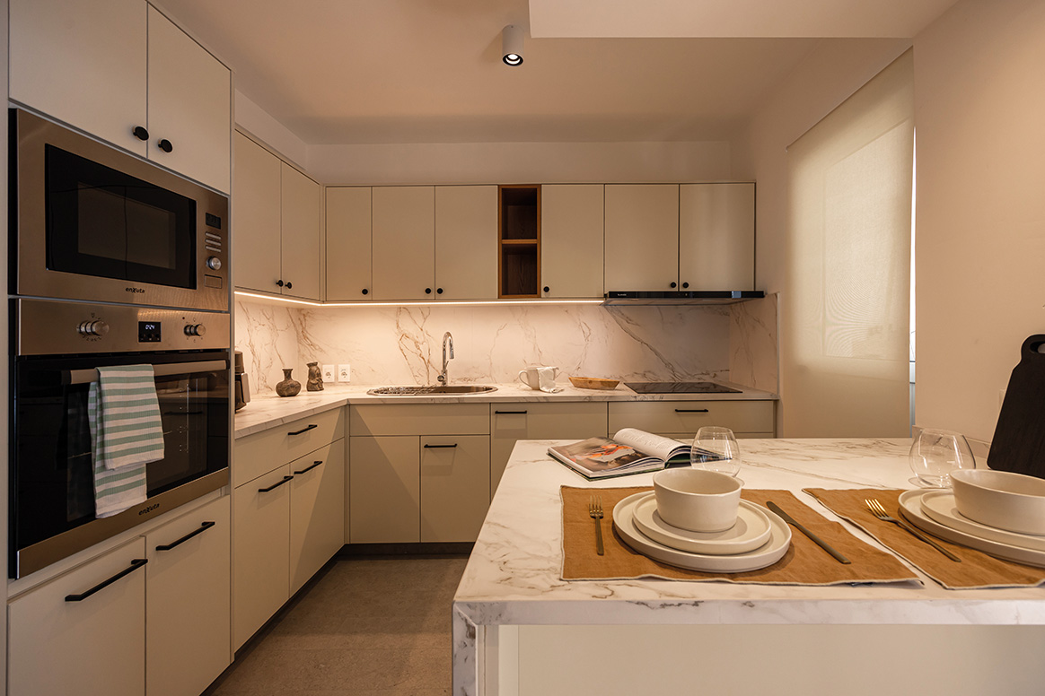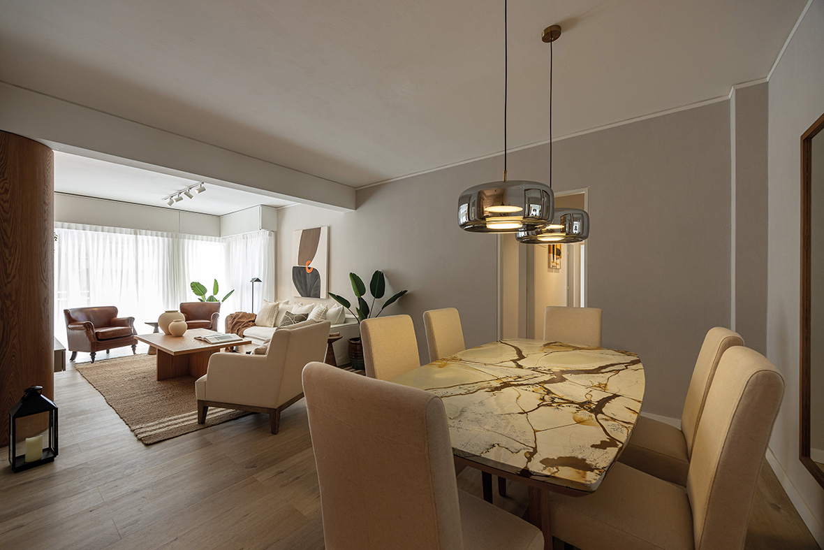 En el cuarto de estar, Cecilia diseñó un mueble modular en roble natural con detalles laqueados en visón, iluminado indirectamente con tiras LED, que crea una atmósfera acogedora y bien iluminada sin ser intrusiva. Este mueble, con sus 3.45 metros de largo y 2.25 metros de alto, se convierte en una pieza clave del diseño al ofrecer almacenamiento versátil y espacio para exhibir elementos personales y decorativos. Su estructura abierta es ideal para que la usuaria tenga al alcance sus libros y objetos favoritos, sin comprometer la estética. Además, el diseño del mueble ha sido pensado para que integre la televisión de forma discreta, evitando que se convierta en un elemento disruptivo. Para el equipamiento, se eligió un sofá de lino blanco en el centro del estar y dos butacas tipo bergere de cuero con detalles en tachas. Estas piezas no solo aportan una comodidad esencial, sino que, dispuestas simétricamente respecto al mueble modular, generan una sensación de orden y estabilidad visual. La elección de una mesa de centro en placa de roble, que descansa sobre una alfombra de fibra natural de dimensiones generosas (3m x 4m), ayuda a enmarcar el espacio y a proporcionar un límite visual entre el estar y el resto del área social, sin perder la conexión visual lograda a través del empapelado beige. El comedor, un espacio compacto, logra destacarse gracias a una mesa de mármol “Blue Roma”, cuya textura y tonalidades tierra aportan carácter sin sobrecargar el diseño. Las vetas pronunciadas del mármol, en diálogo con las sillas tapizadas en un género liviano, crean un contraste balanceado que hace de este espacio un lugar acogedor y elegante, ideal para reuniones familiares sin dejar de lado la funcionalidad en el uso cotidiano.