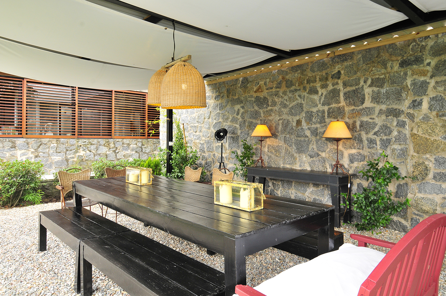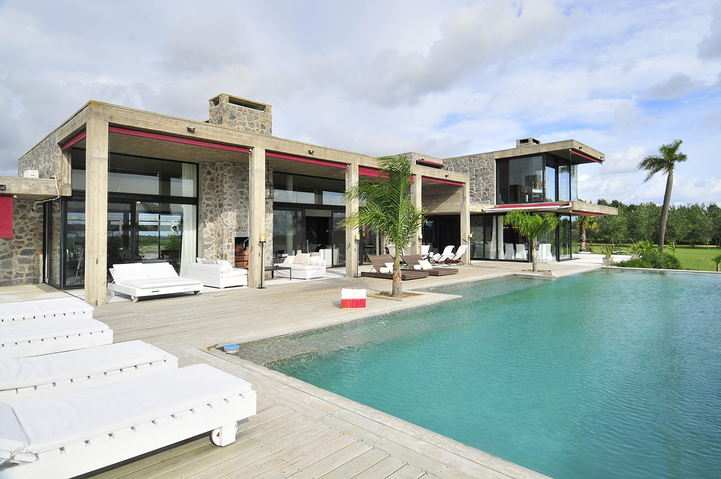 En esta propiedad se le dio especial tratamiento a poder disfrutar de los espacios al aire libre. Claro ejemplo es el área de la piscina así como también el patio exterior, el cual conecta e ilumina los espacios comunes de la casa que, con el campo de fondo, parece sacado de una postal.