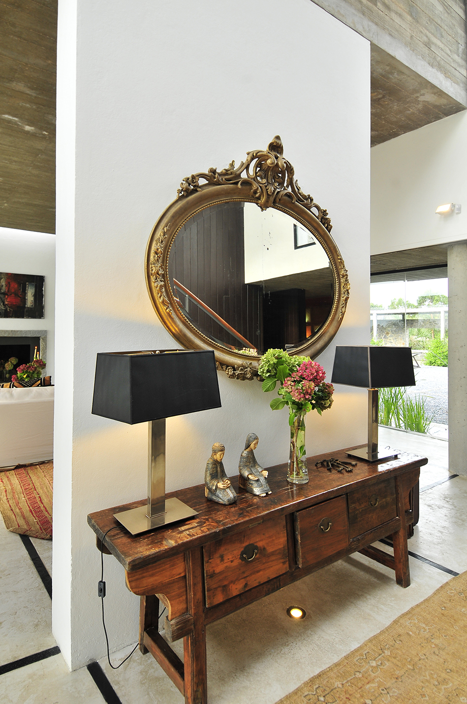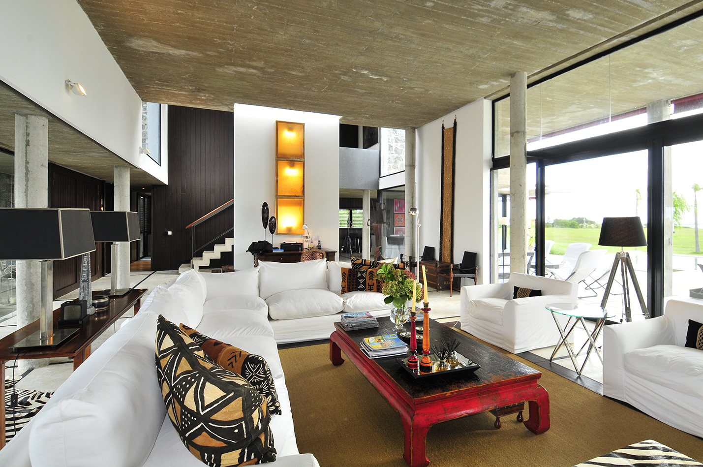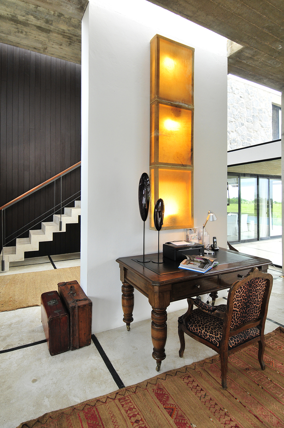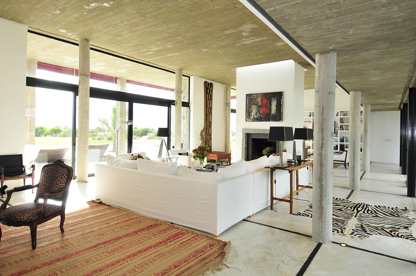 El living con vista al patio está dividido por una importante estufa a leña y enmarcado por los pilares estructurales de hormigón, que han quedado armoniosamente visibles y que definen una propuesta fuera de lo convencional. Un espacio donde predominan los colores claros en una ambientación delicadamente rústica, generada tanto por el pavimento, que combina el cemento alisado veteado con detalles en piedra, así como el techo de hormigón en su color puro.