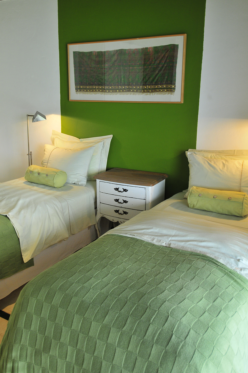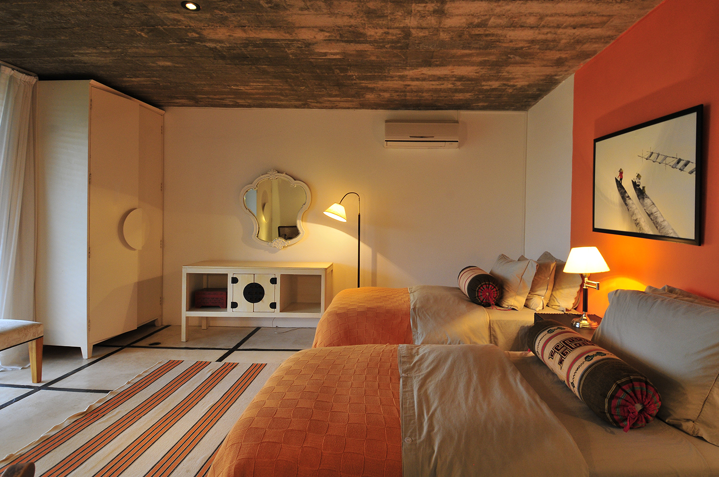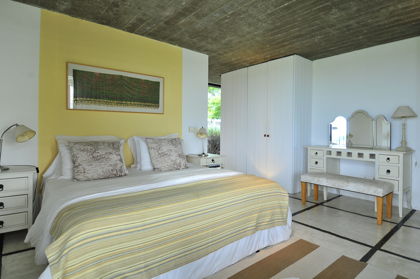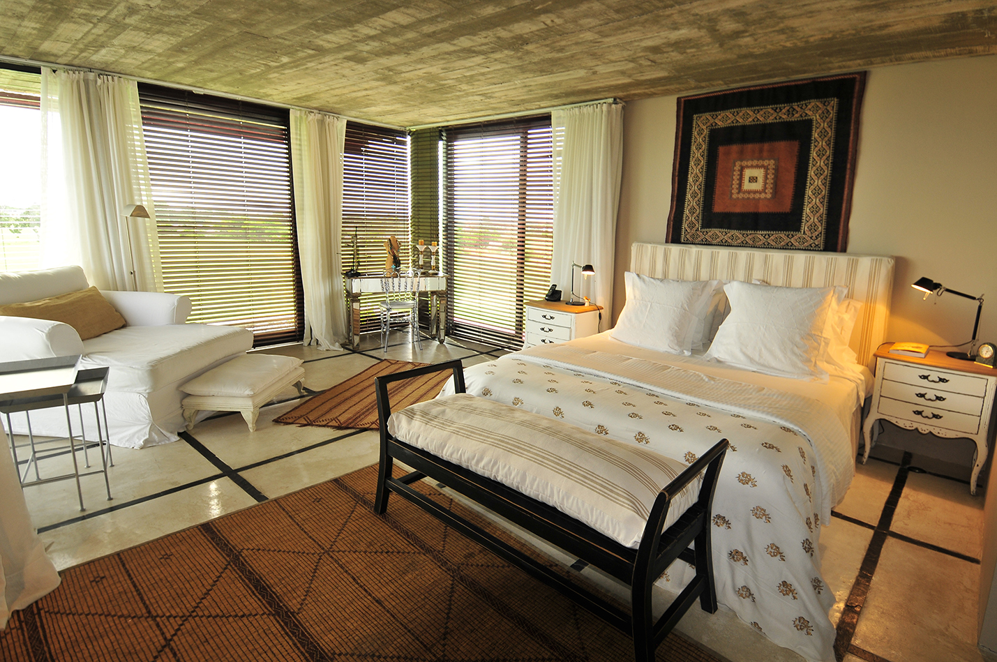 Luego de recorrer el living y el comedor pasamos a la zona íntima de la casa. Los cinco dormitorios, todos en suite, cuentan cada uno de ellos con una cuidada ambientación y han sido equipados con diferente mobiliario de época, que ha sido restaurado, y objetos únicos, que le dan un carácter especial a cada uno de ellos.