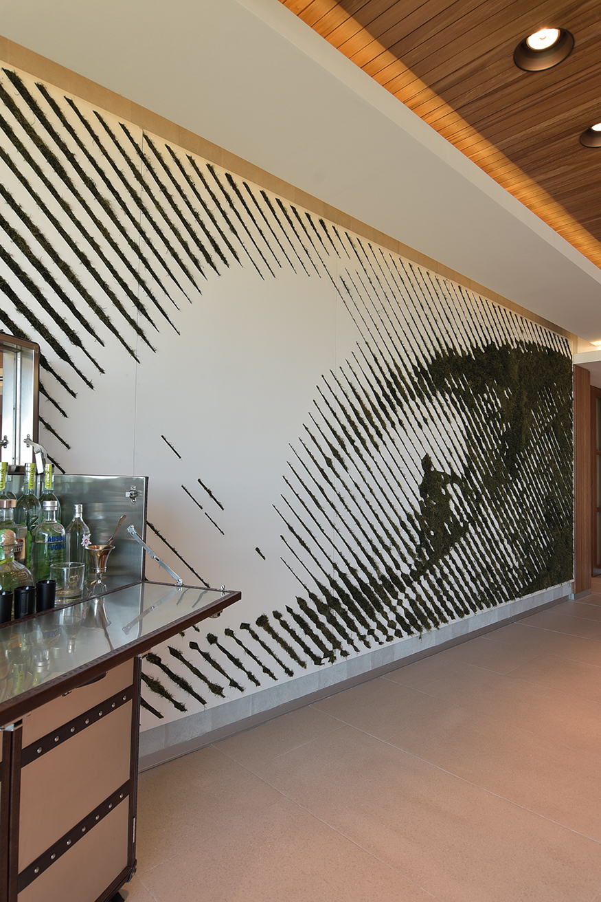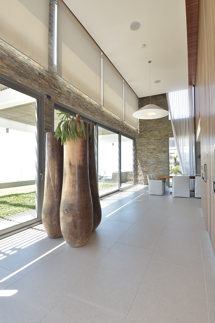 La distribución espacial sugiere un orden en el que se han evitado las interfaces y entonces la fluidez es plena y se remarca por el tratamiento de pavimentos y paredes, donde la madera de lapacho, pinotea y bambú acentúa la integración. La pared que sostiene como telón al gran living contiene un mural de juncos que permanecen en estado latente, con paneles de madera cortados con laser. El diseño y el concepto estético es responsabilidad de los habitantes que fueron asistidos por Verde Fácil. En otro sector de la planta aparecen pinturas de Manuel Larravide y de Martín Pelenur, con lo cual percibimos un curioso dialogo entre estilos, épocas y conceptos que funciona y consagra la armonía de una atmósfera vital.