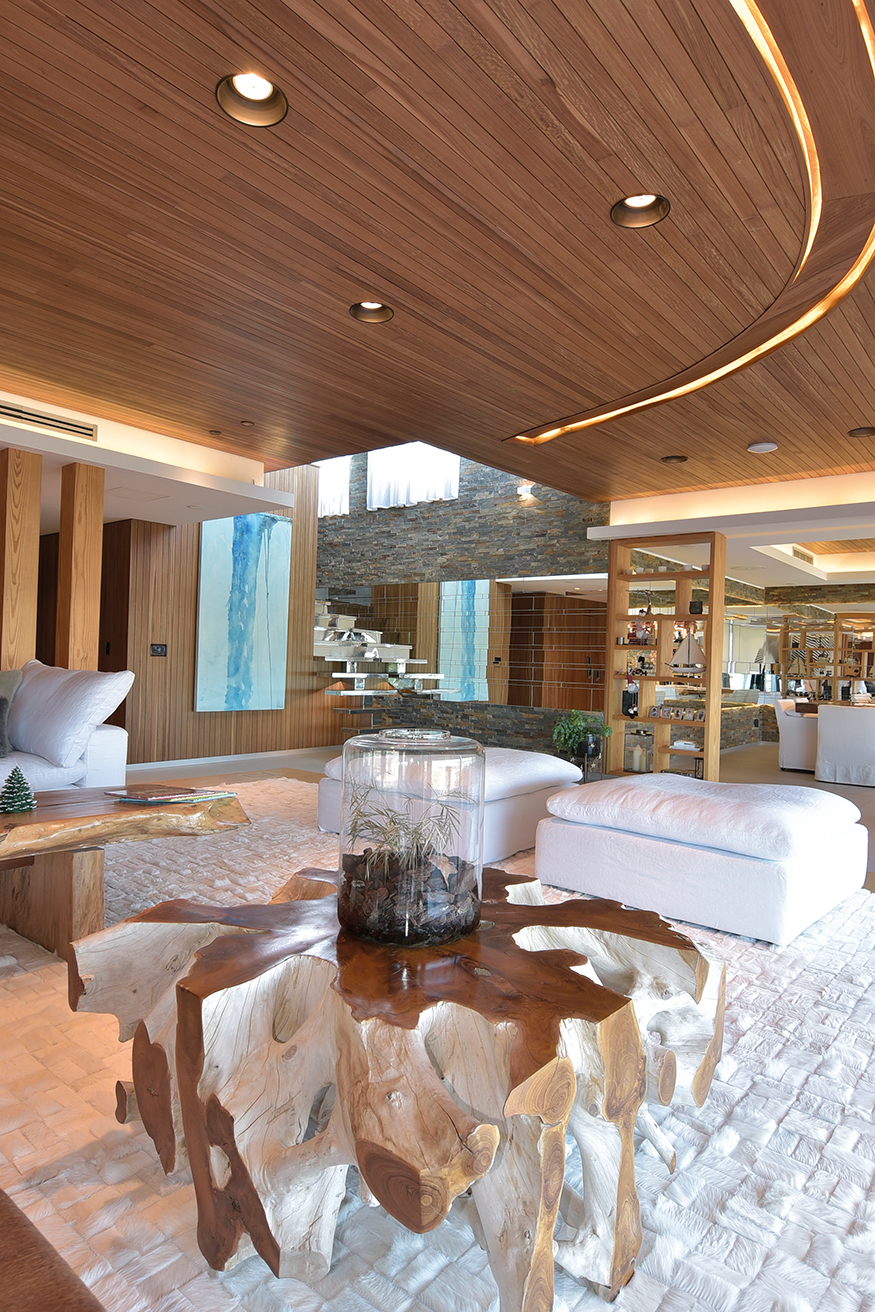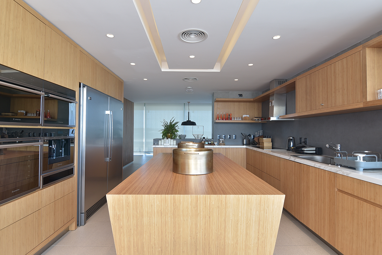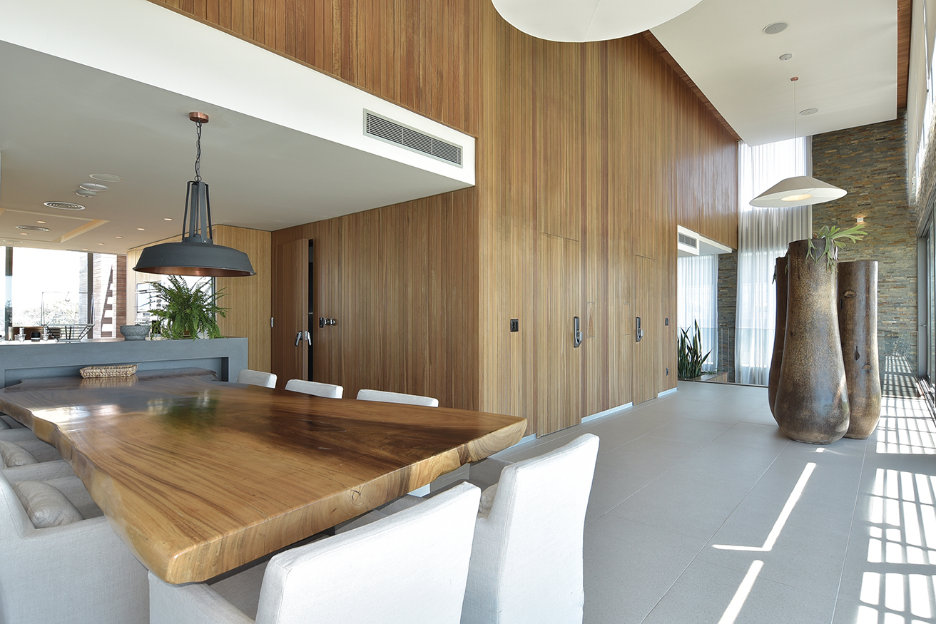 Las mesas son superficies que llaman nuestra atención, se trata de piezas únicas que fueron adquiridas por Kolher en Indonesia e importadas especialmente. Luego las alfombras, también diseñadas por los habitantes, son piezas a medidas manufacturadas por Claudio Troccoli. Los muebles de ambas cocinas también fueron diseñadas y hechas a medida en bambú macizo, con aplicación de herrajes Bloom de Austria, las mesadas de Neolite. El conjunto resulta especialmente confortable, confort sin estridencias, buen gusto a medida.