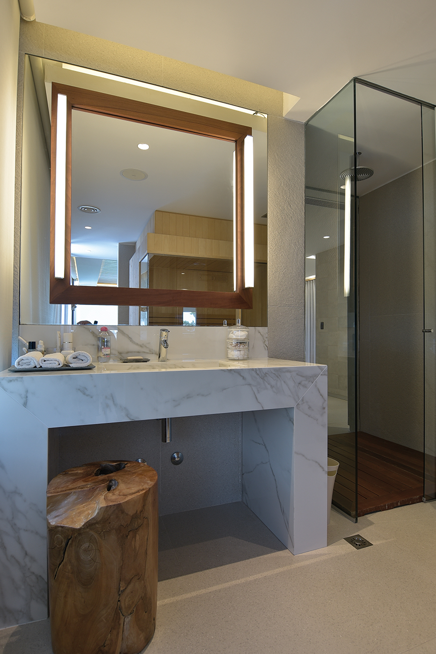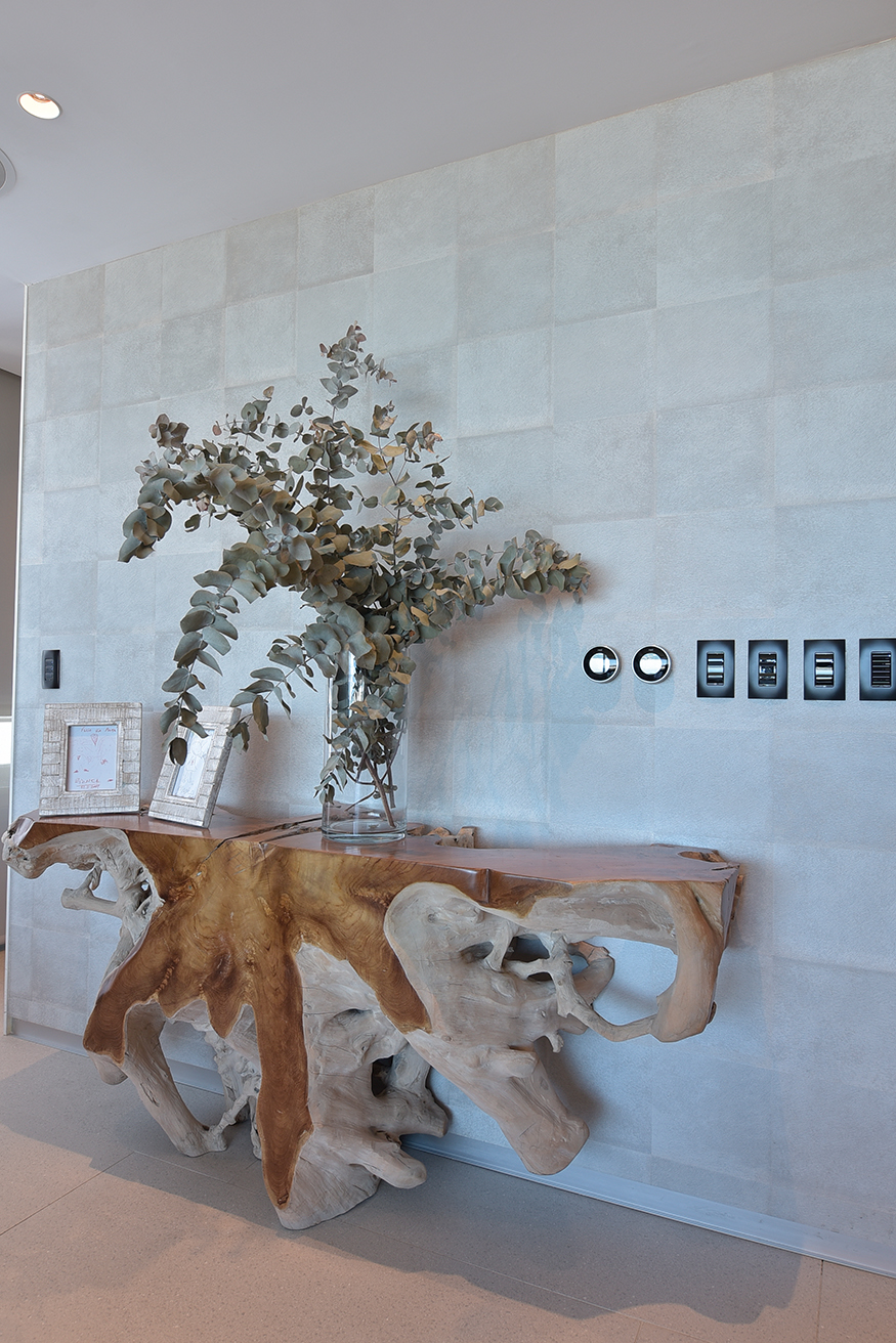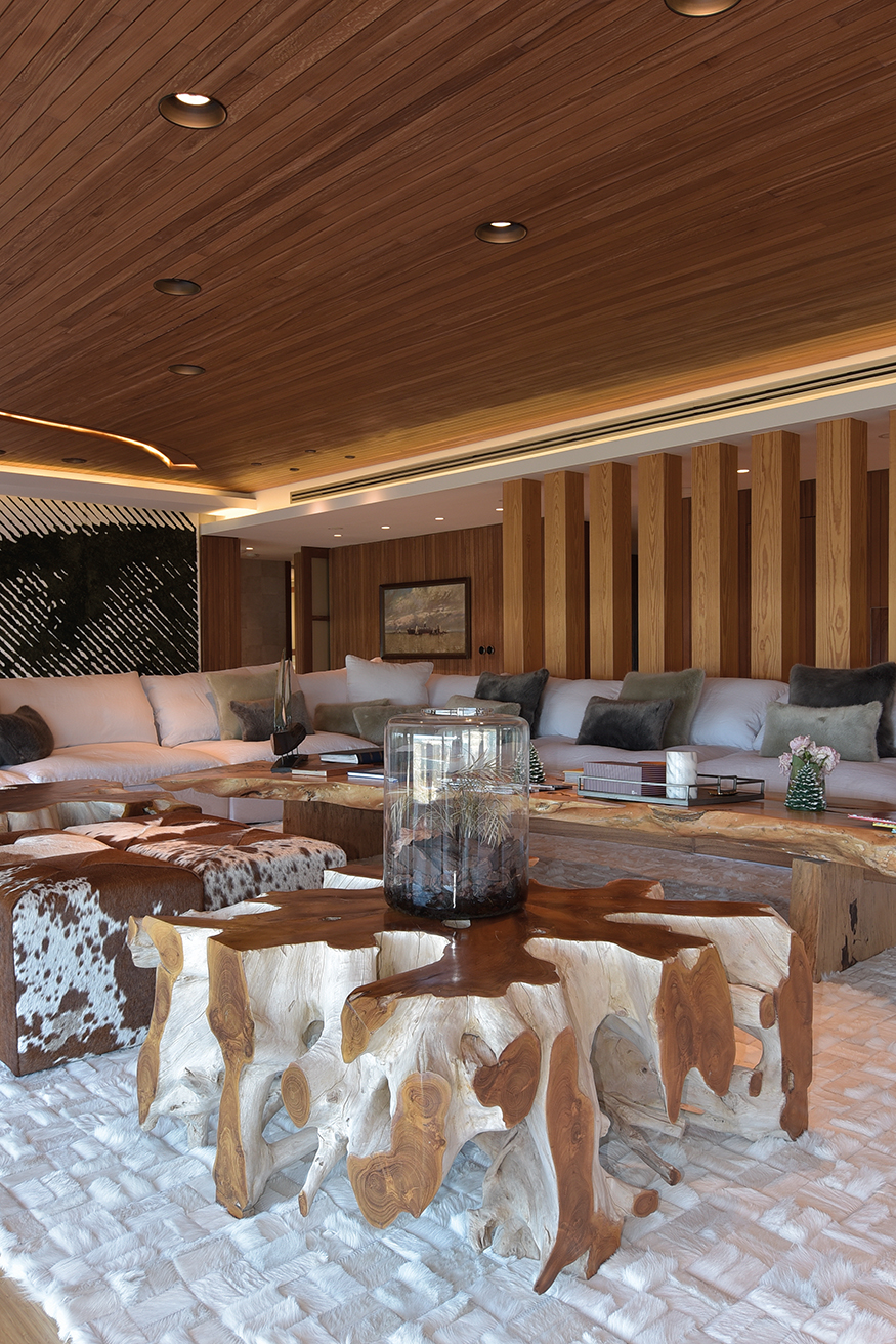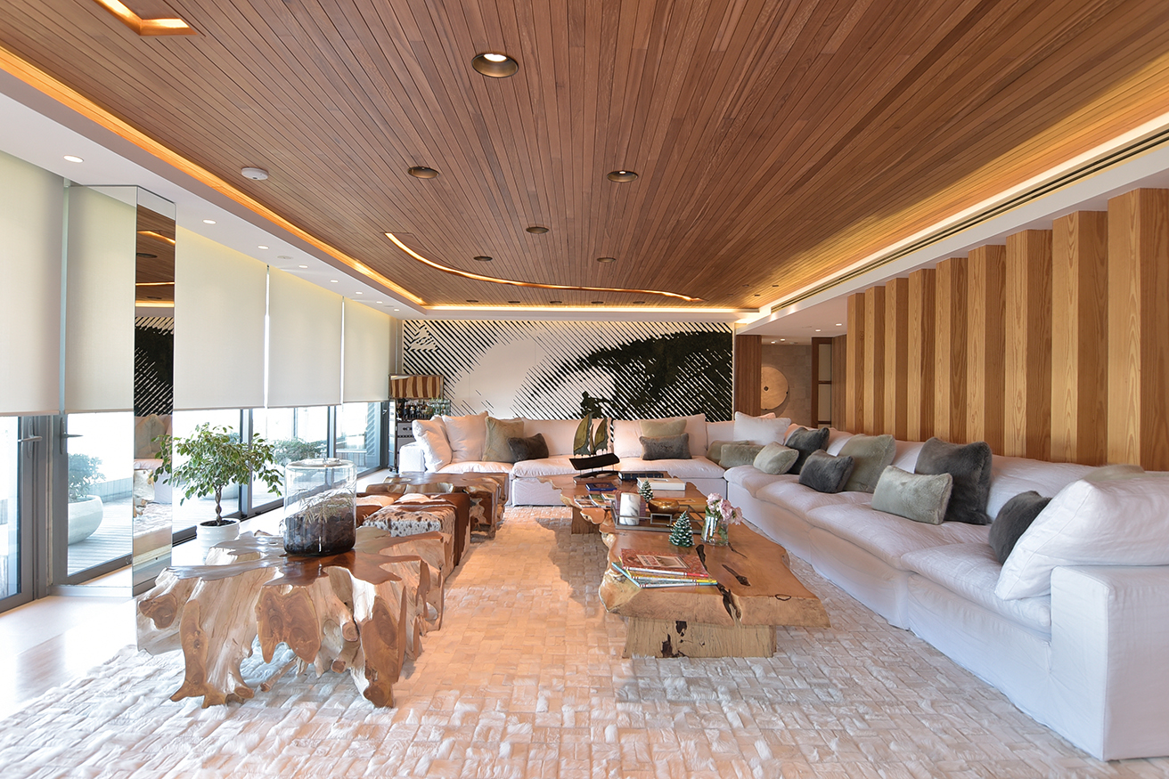 Las mesas son superficies que llaman nuestra atención, se trata de piezas únicas que fueron adquiridas por Kolher en Indonesia e importadas especialmente. Luego las alfombras, también diseñadas por los habitantes, son piezas a medidas manufacturadas por Claudio Troccoli. Los muebles de ambas cocinas también fueron diseñadas y hechas a medida en bambú macizo, con aplicación de herrajes Bloom de Austria, las mesadas de Neolite. El conjunto resulta especialmente confortable, confort sin estridencias, buen gusto a medida.
