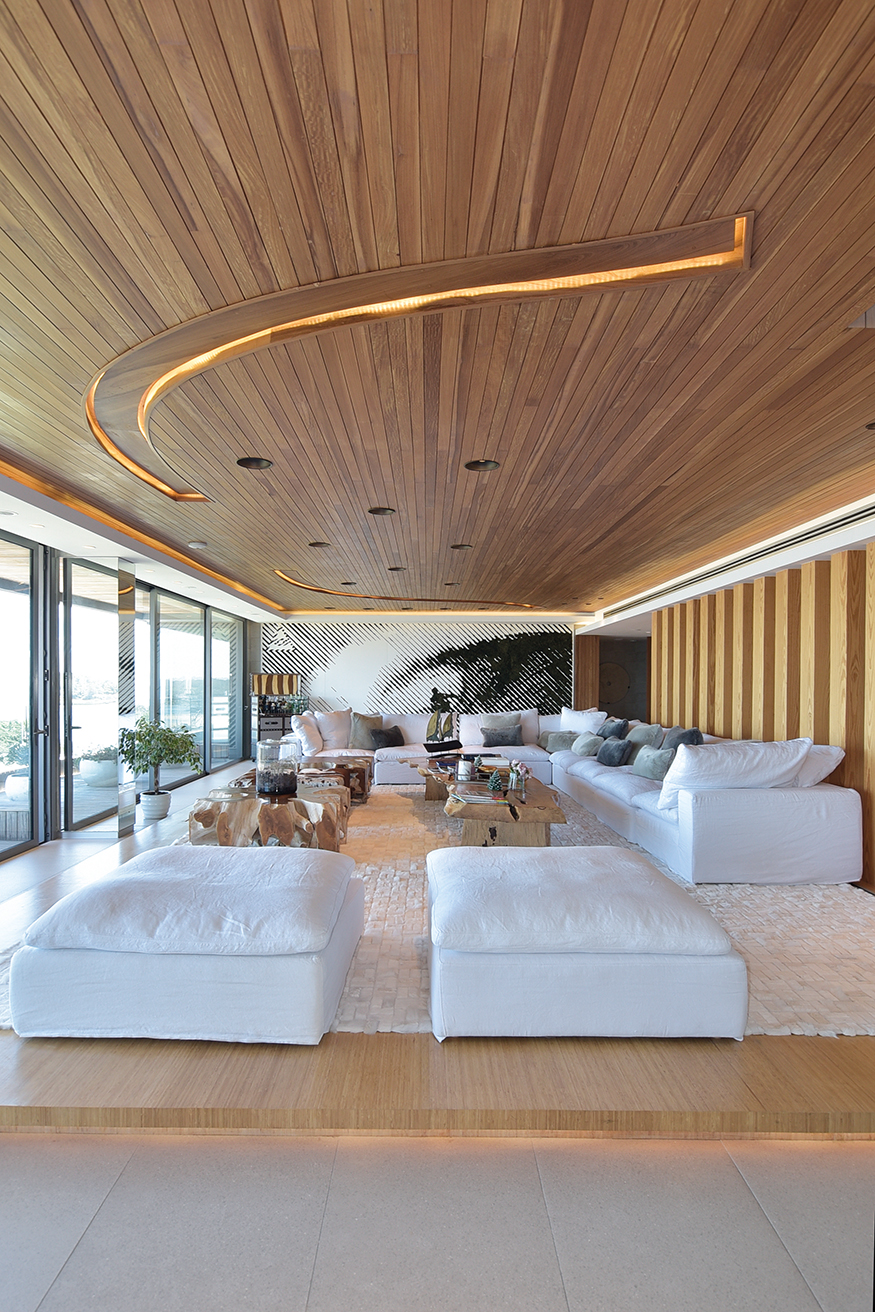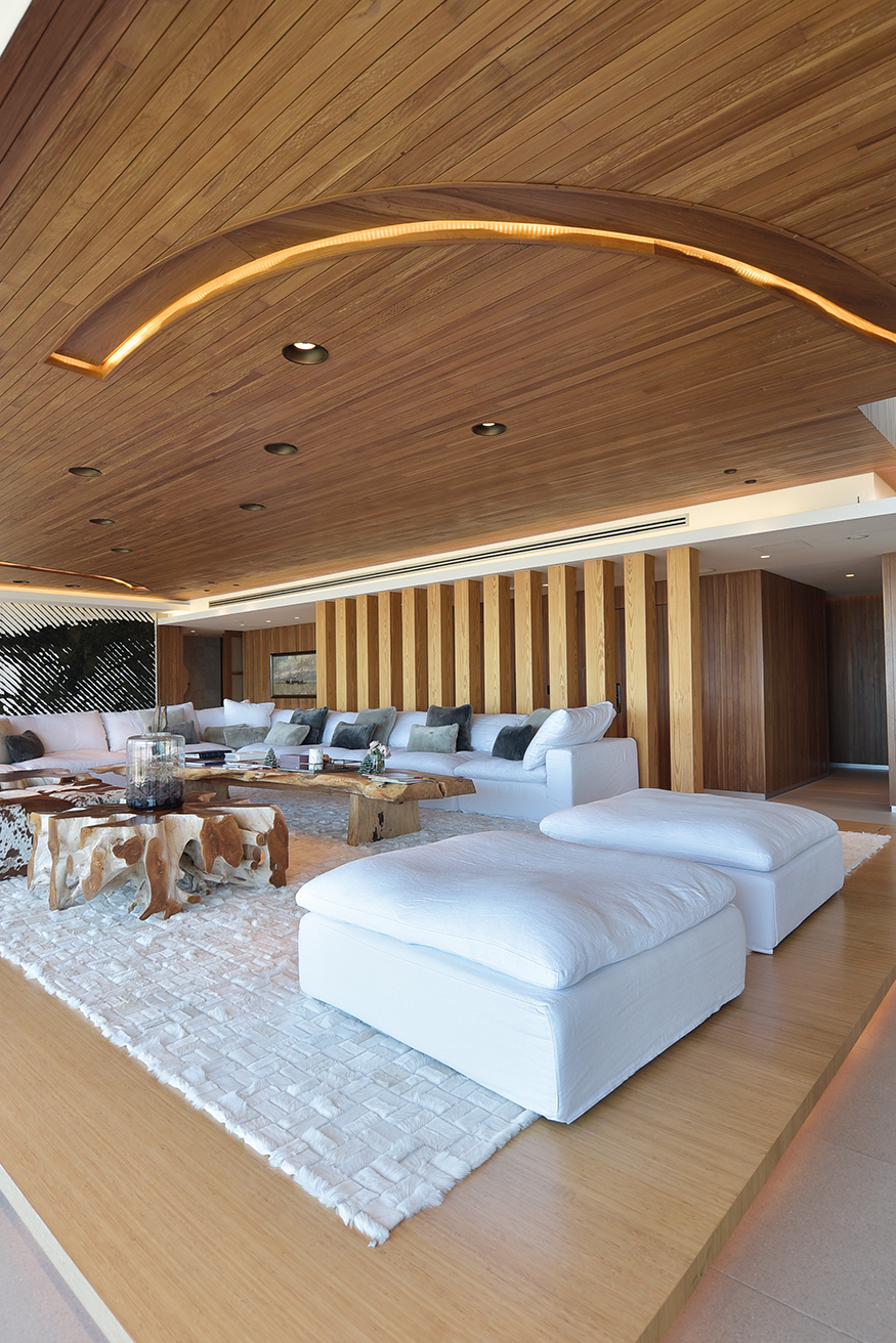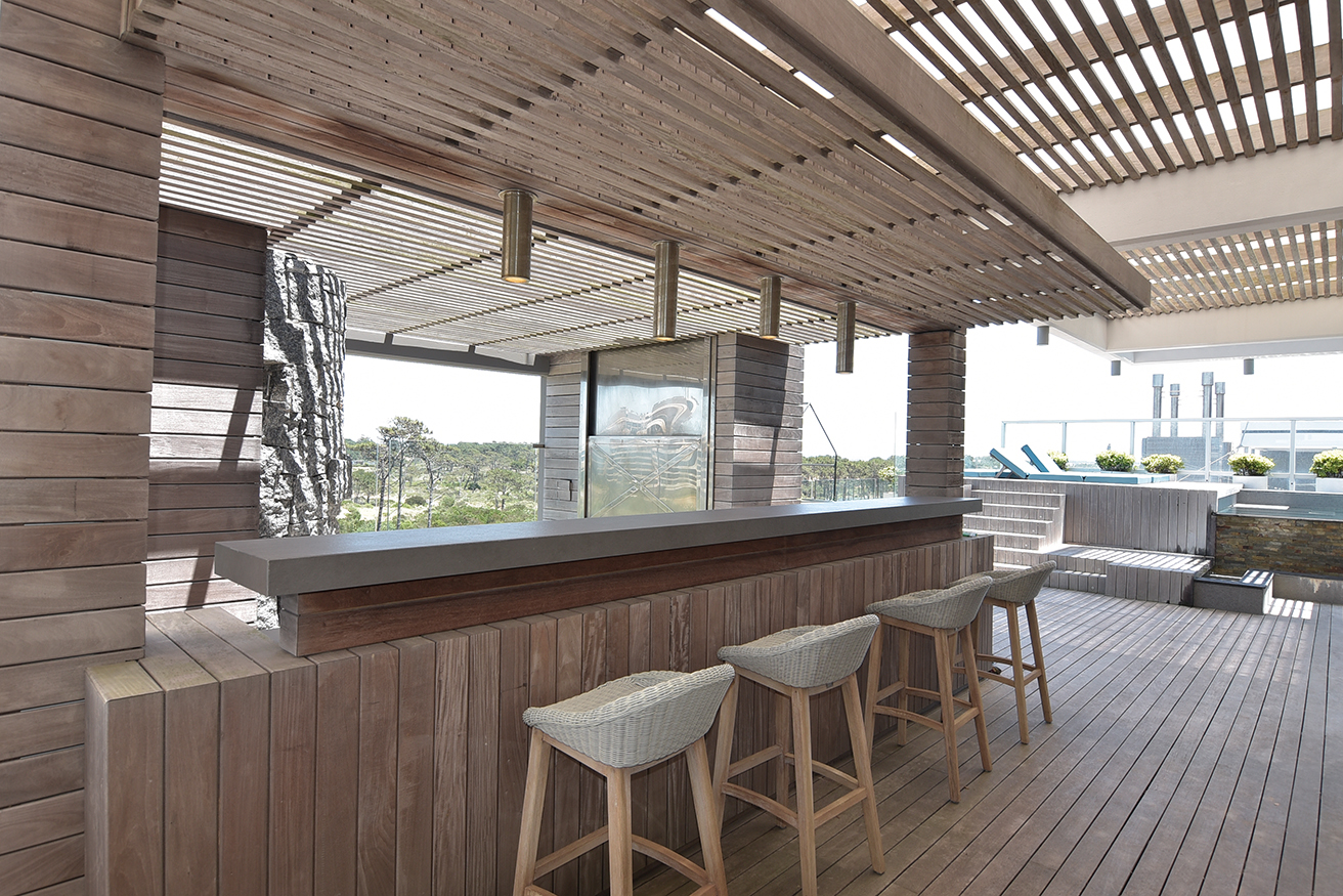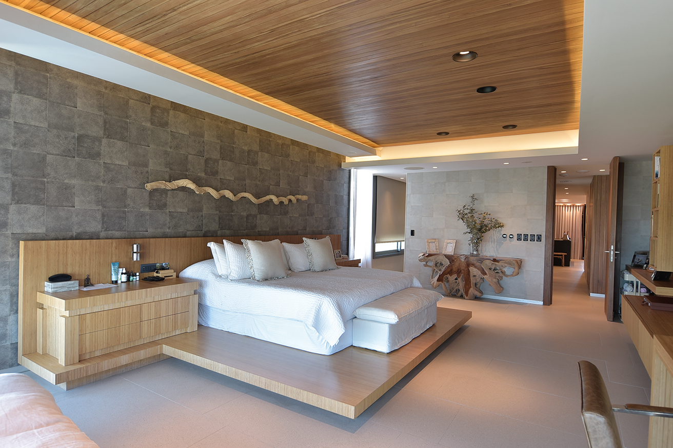 De cada uno de los espaciosos semipisos era imprescindible que la increíble vista fuera preservada para cada apartamento. El desarrollo de cada propuesta debía diseñarse en torno a esta idea, declinándose en suaves curvas para así asegurar la multiplicación de los puntos de vista. Así presenta el Estudio Mario Roberto Álvarez (Buenos Aires) al emprendimiento TIBURON TERRAZAS y al visitar una de sus torres para recorrer un increíble dúplex confirmamos que todos los desvelos del diseño valieron la pena. Rápidamente perdemos la noción de que estamos en una torre de apartamentos. El ingreso nos instala frente a una planta que de inmediato genera la sensación espacial de una casa. Los enormes ventanales que miran hacia la playa y que desde donde estamos nos ubican frente a la primera cala de La Barra, el gran living con paredes revestidas en madera, las tarimas que generan microclimas determinados por piezas de mobiliario de líneas despojadas y tonos suaves pero definidos. Todo sugiere armonía y un contexto estético que nos lleva a la sorpresa. Ya habíamos sido advertidos que todo el tratamiento espacial y el equipamiento fue tarea de los habitantes.