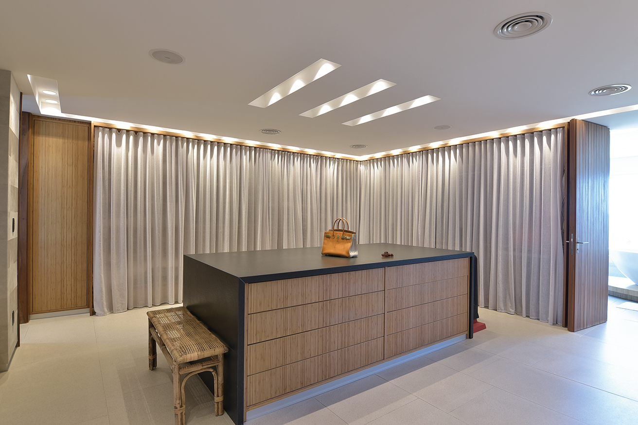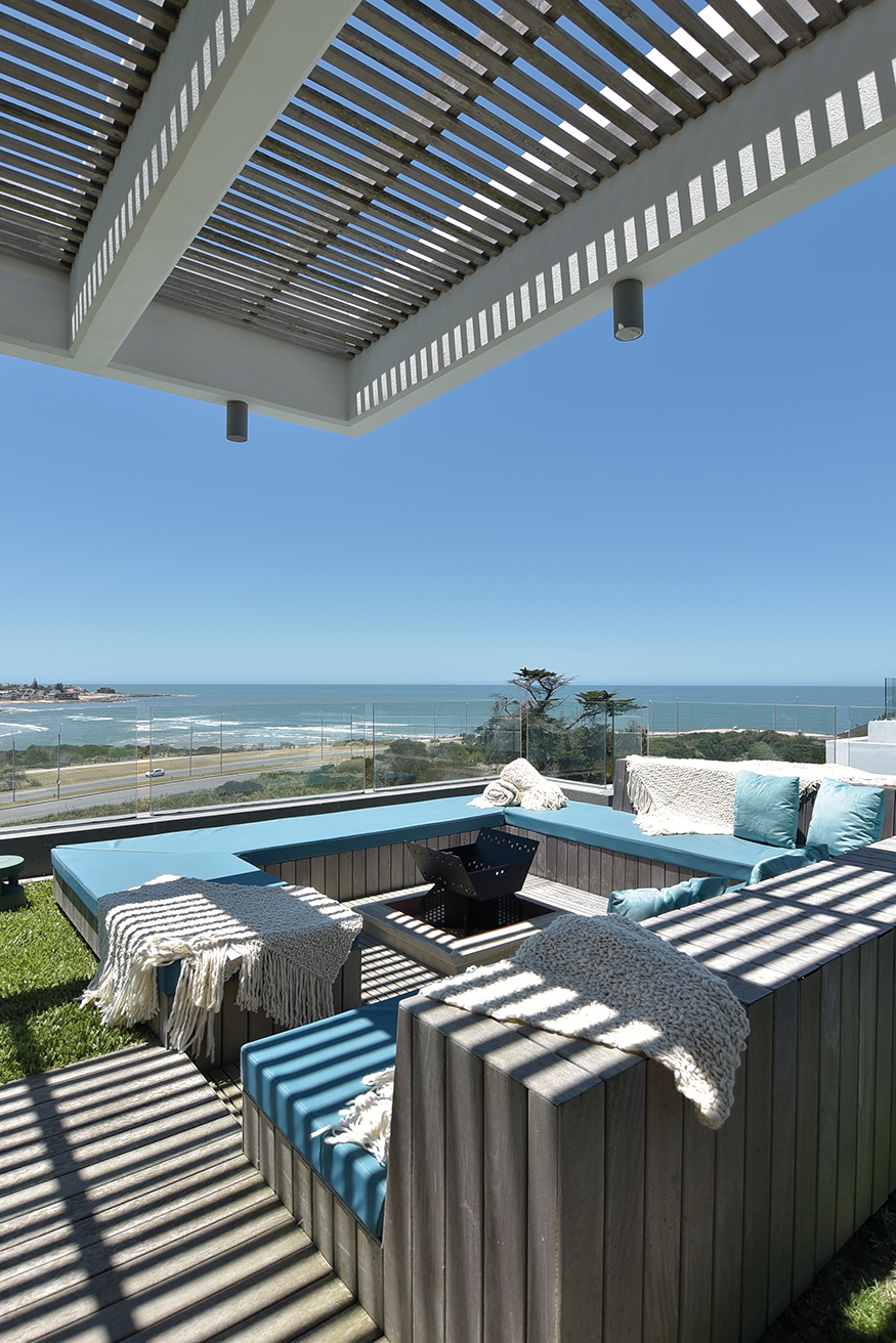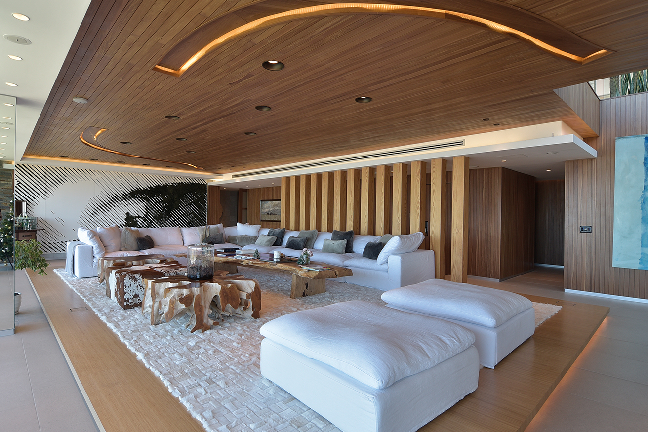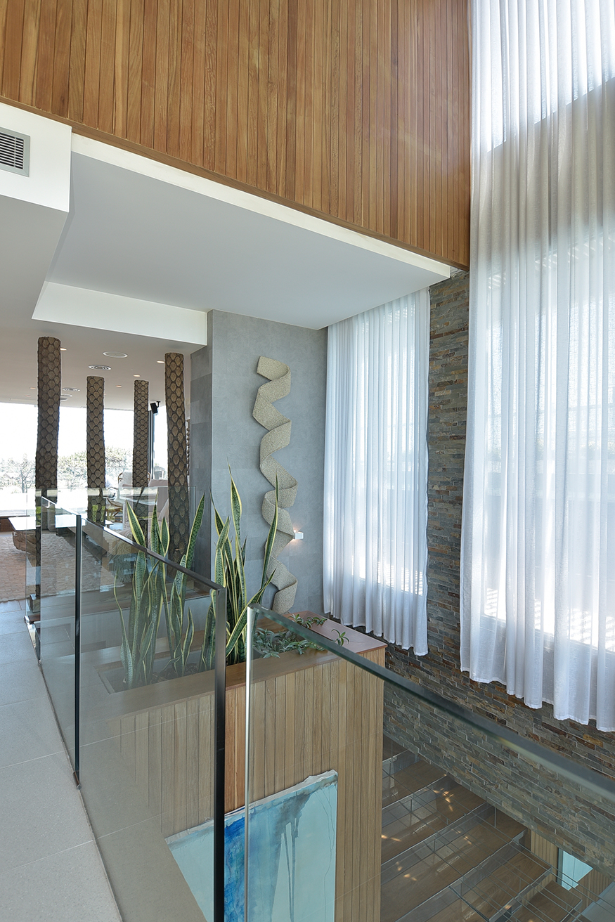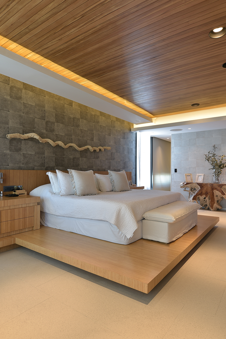 De cada uno de los espaciosos semipisos era imprescindible que la increíble vista fuera preservada para cada apartamento. El desarrollo de cada propuesta debía diseñarse en torno a esta idea, declinándose en suaves curvas para así asegurar la multiplicación de los puntos de vista. Así presenta el Estudio Mario Roberto Álvarez (Buenos Aires) al emprendimiento TIBURON TERRAZAS y al visitar una de sus torres para recorrer un increíble dúplex confirmamos que todos los desvelos del diseño valieron la pena. Rápidamente perdemos la noción de que estamos en una torre de apartamentos. El ingreso nos instala frente a una planta que de inmediato genera la sensación espacial de una casa. Los enormes ventanales que miran hacia la playa y que desde donde estamos nos ubican frente a la primera cala de La Barra, el gran living con paredes revestidas en madera, las tarimas que generan microclimas determinados por piezas de mobiliario de líneas despojadas y tonos suaves pero definidos. Todo sugiere armonía y un contexto estético que nos lleva a la sorpresa. Ya habíamos sido advertidos que todo el tratamiento espacial y el equipamiento fue tarea de los habitantes.