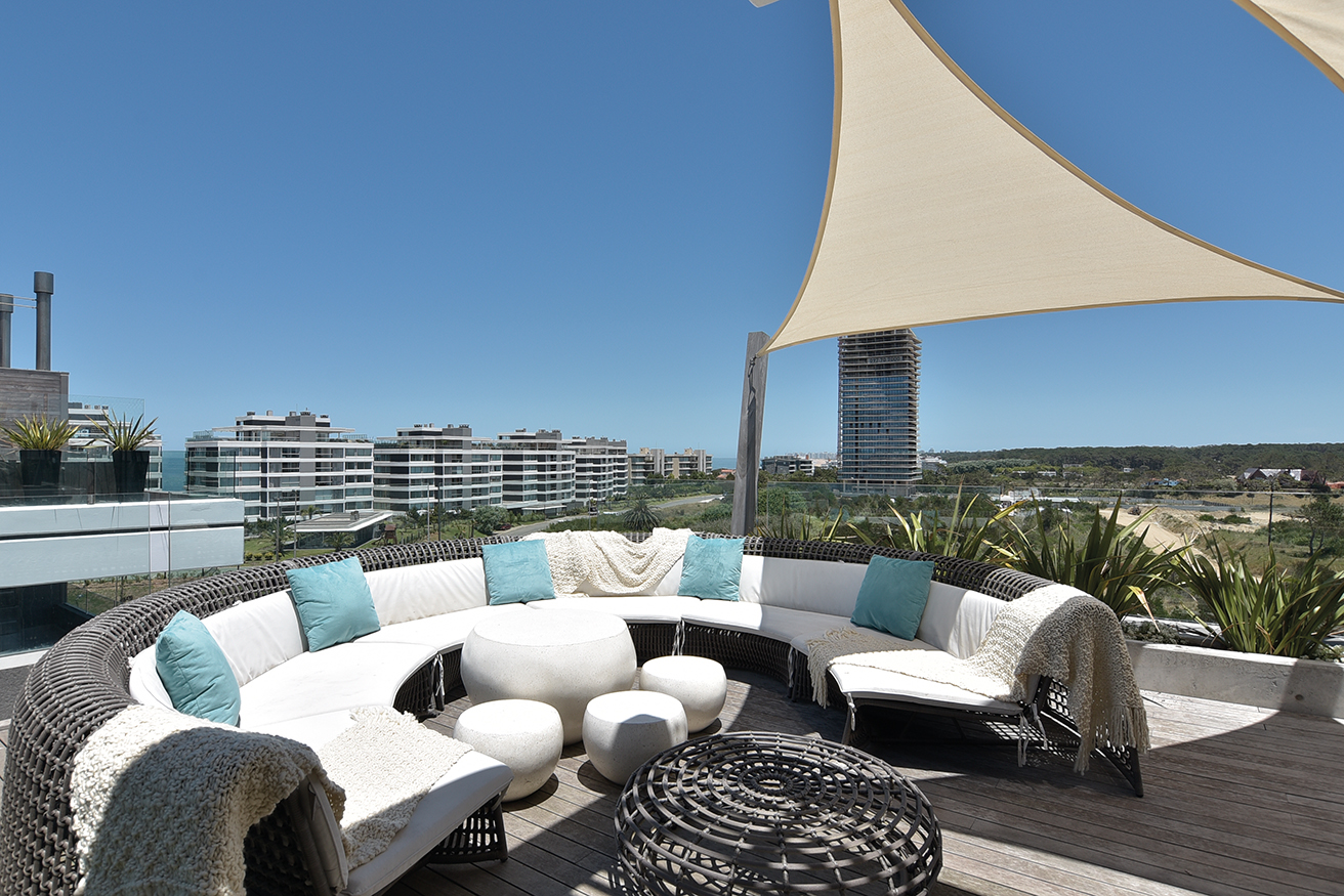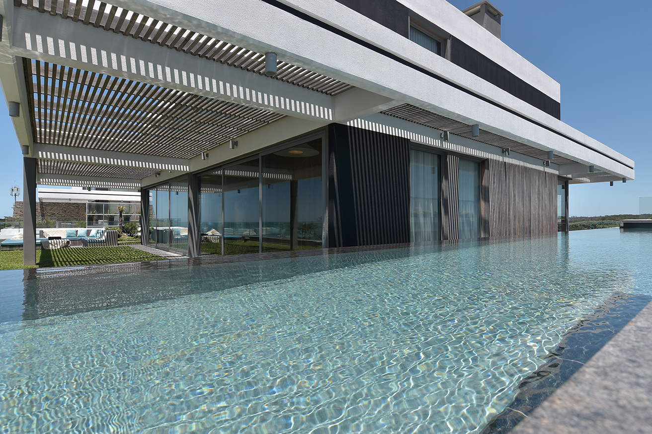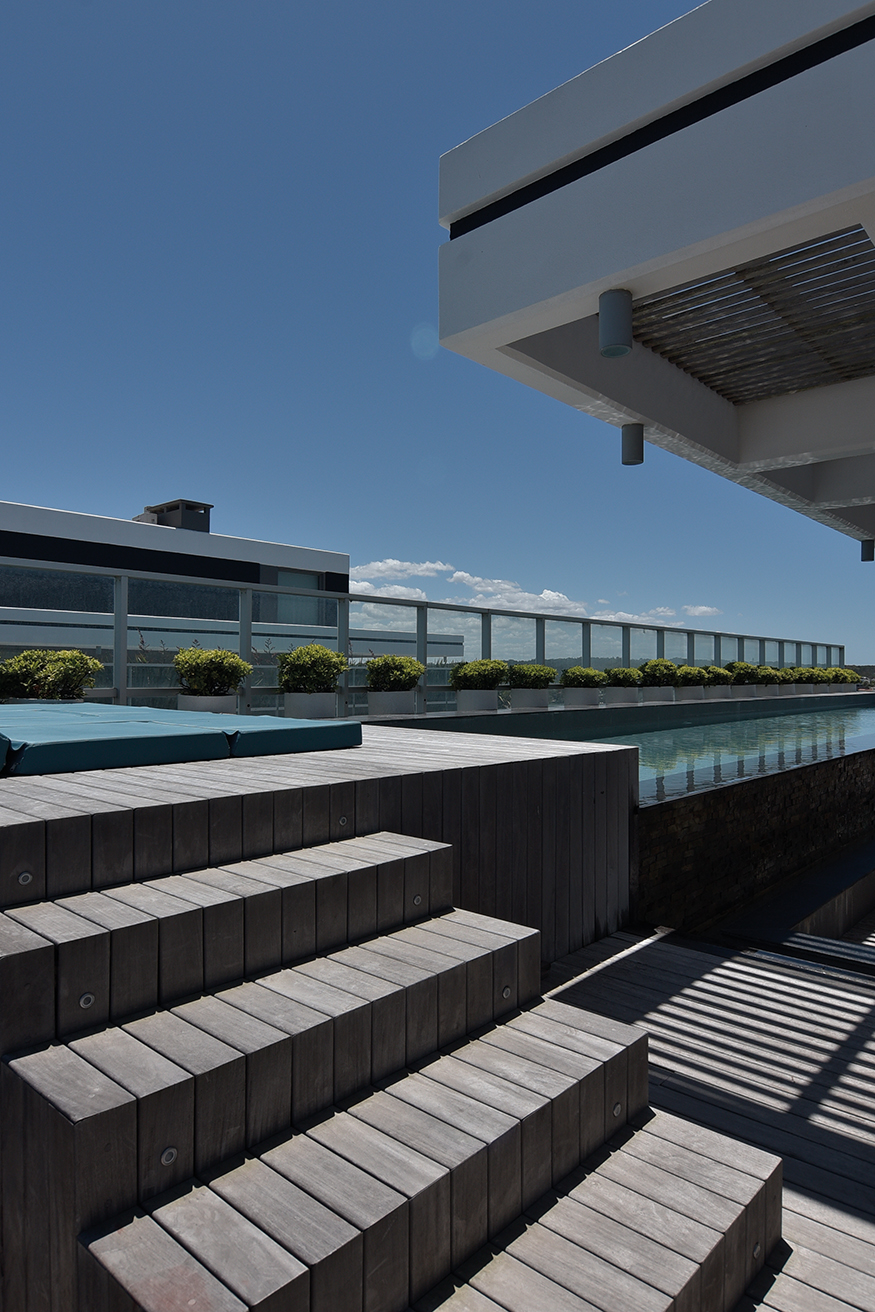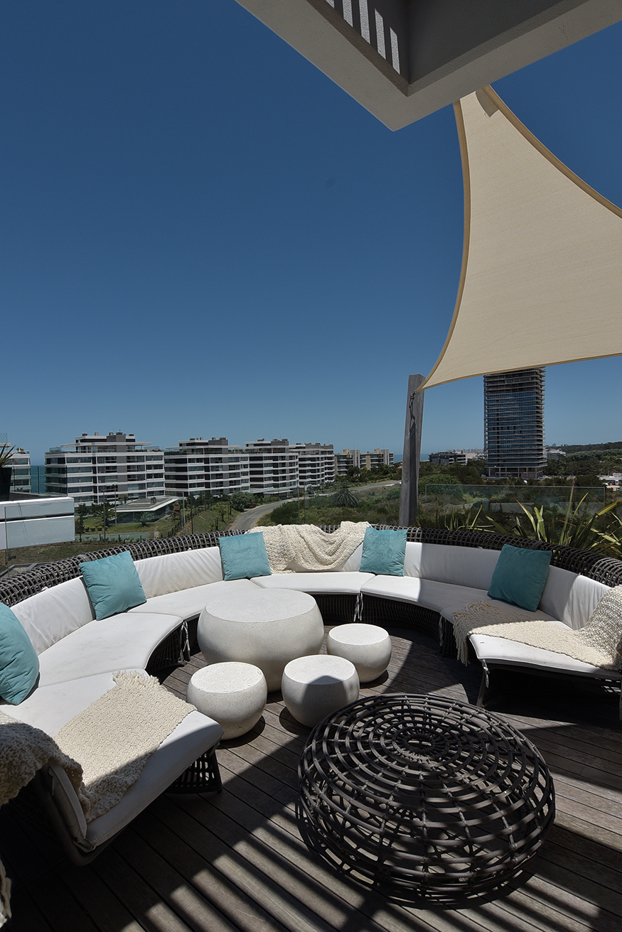 El dúplex ocupa 1250 metros cuadrados en una de las diez torres que conforman el complejo TIBURON TERRAZAS y que en el abanico que conforman sobre la costa ocupa el eje visual hacia vistas maravillosas que hacia un lado enseñan La Barra y hacia el otro la península. La planta baja, en realidad el piso cinco de la torre, contiene un gran living de catorce metros de largo por diez metros, que asumimos cumple una función social clara, un gran comedor con capacidad para 12 comensales, la cocina y la suite principales. En el contra frente, en la misma planta, se suceden los cuatro dormitorios, todos en suite.