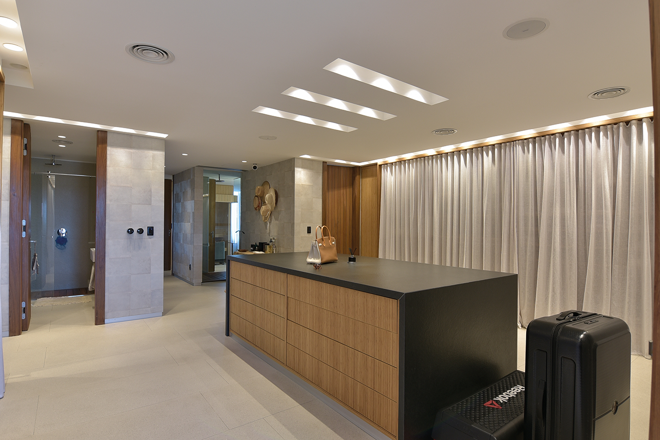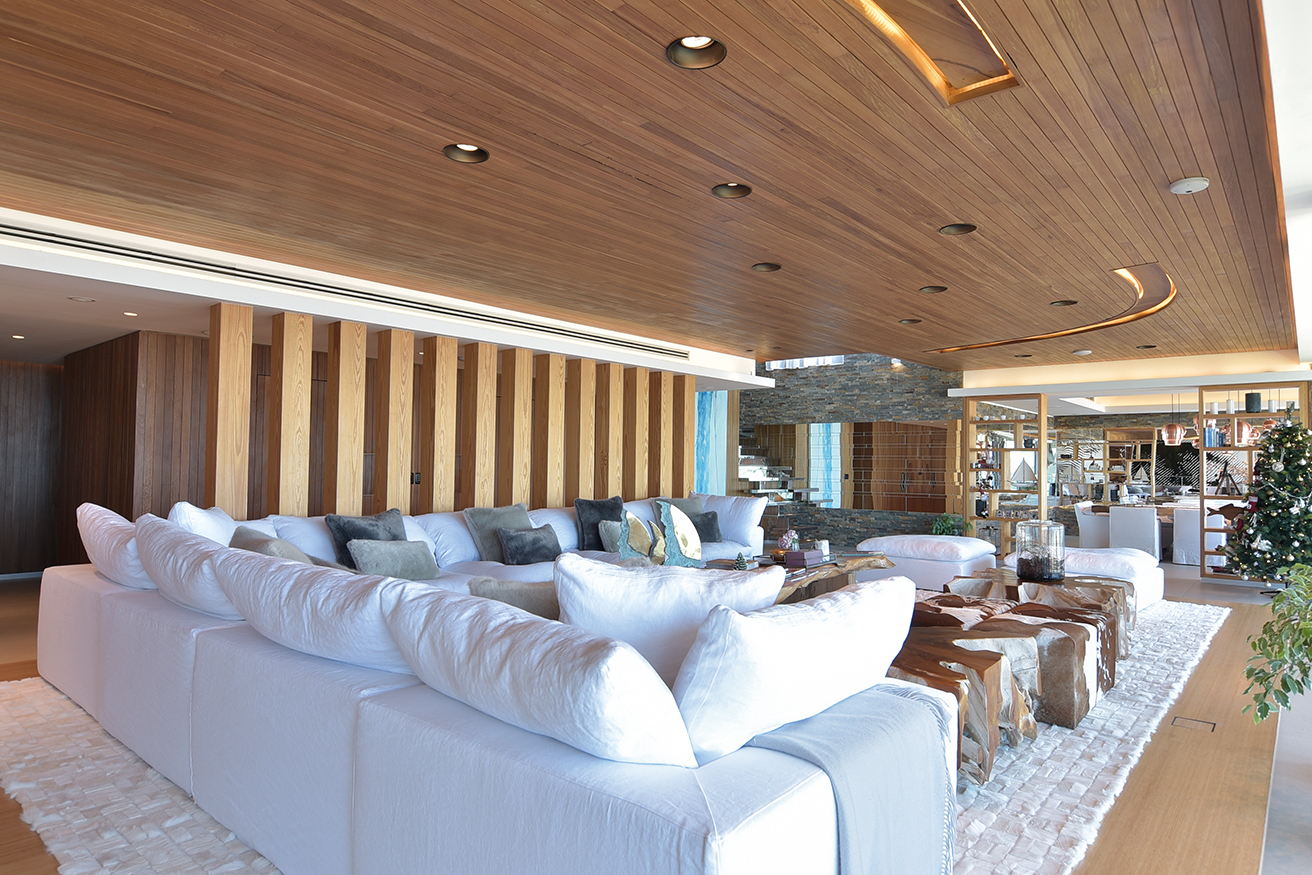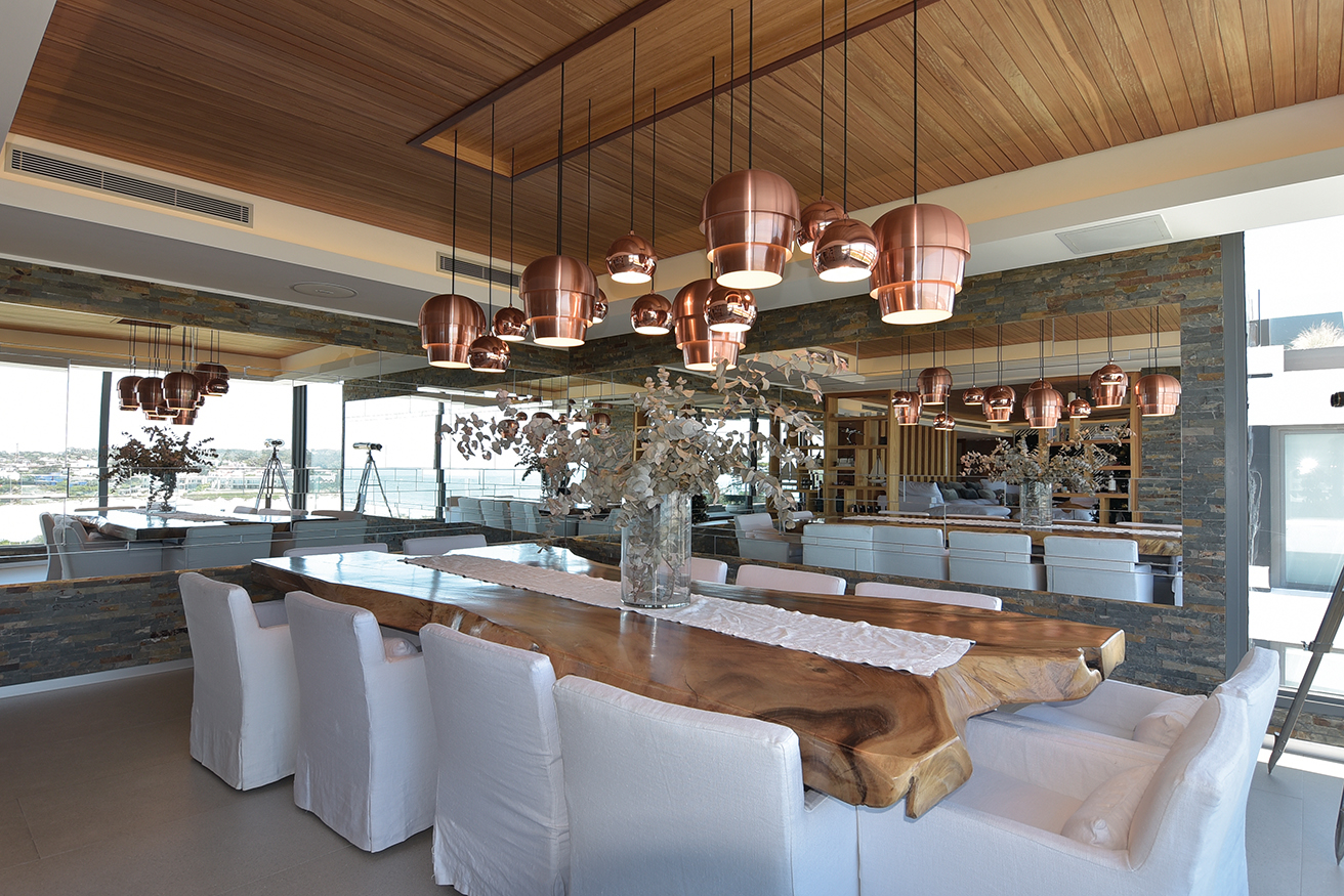 El dúplex ocupa 1250 metros cuadrados en una de las diez torres que conforman el complejo TIBURON TERRAZAS y que en el abanico que conforman sobre la costa ocupa el eje visual hacia vistas maravillosas que hacia un lado enseñan La Barra y hacia el otro la península. La planta baja, en realidad el piso cinco de la torre, contiene un gran living de catorce metros de largo por diez metros, que asumimos cumple una función social clara, un gran comedor con capacidad para 12 comensales, la cocina y la suite principales. En el contra frente, en la misma planta, se suceden los cuatro dormitorios, todos en suite.