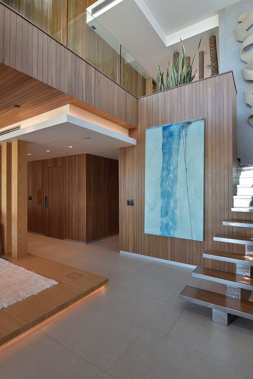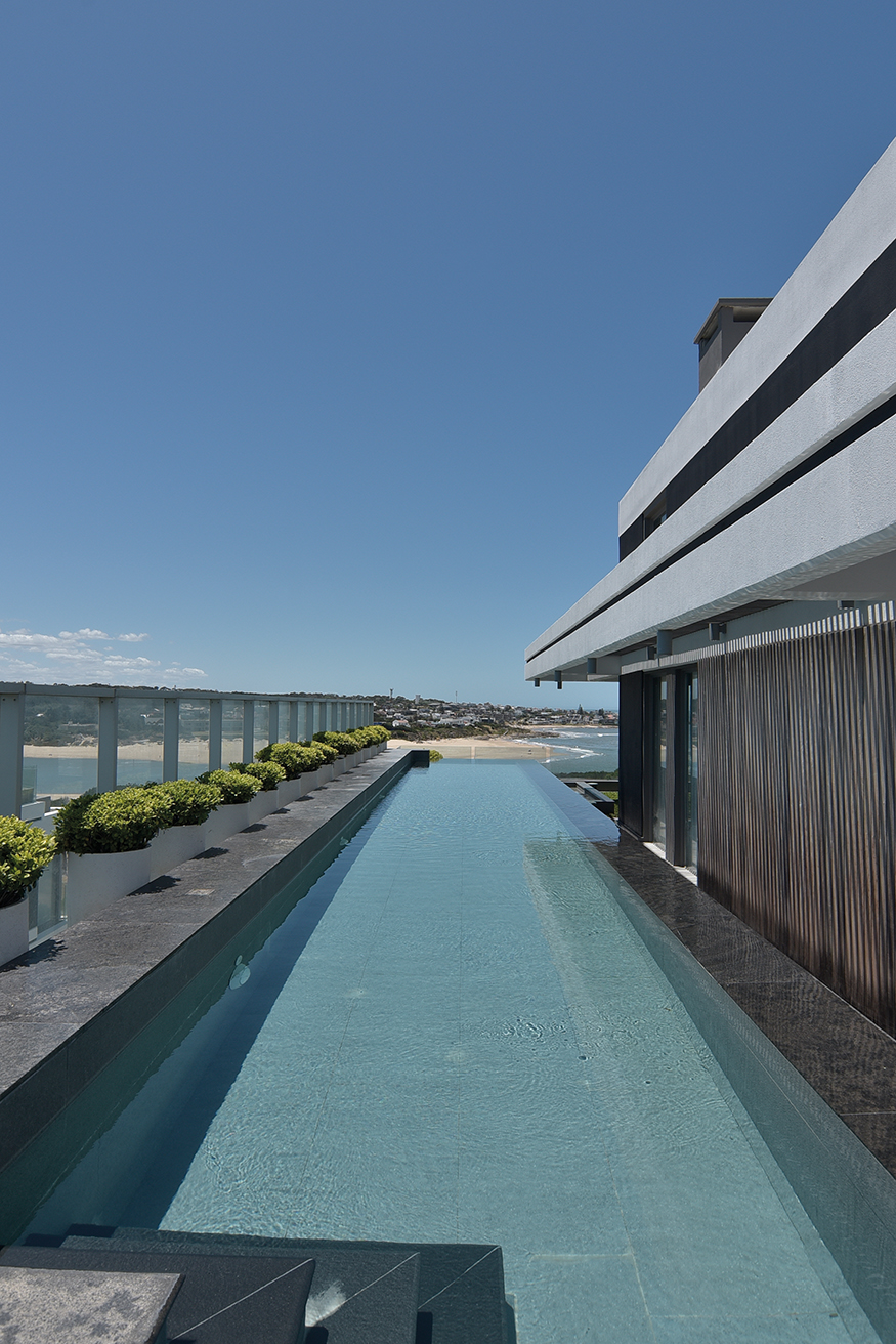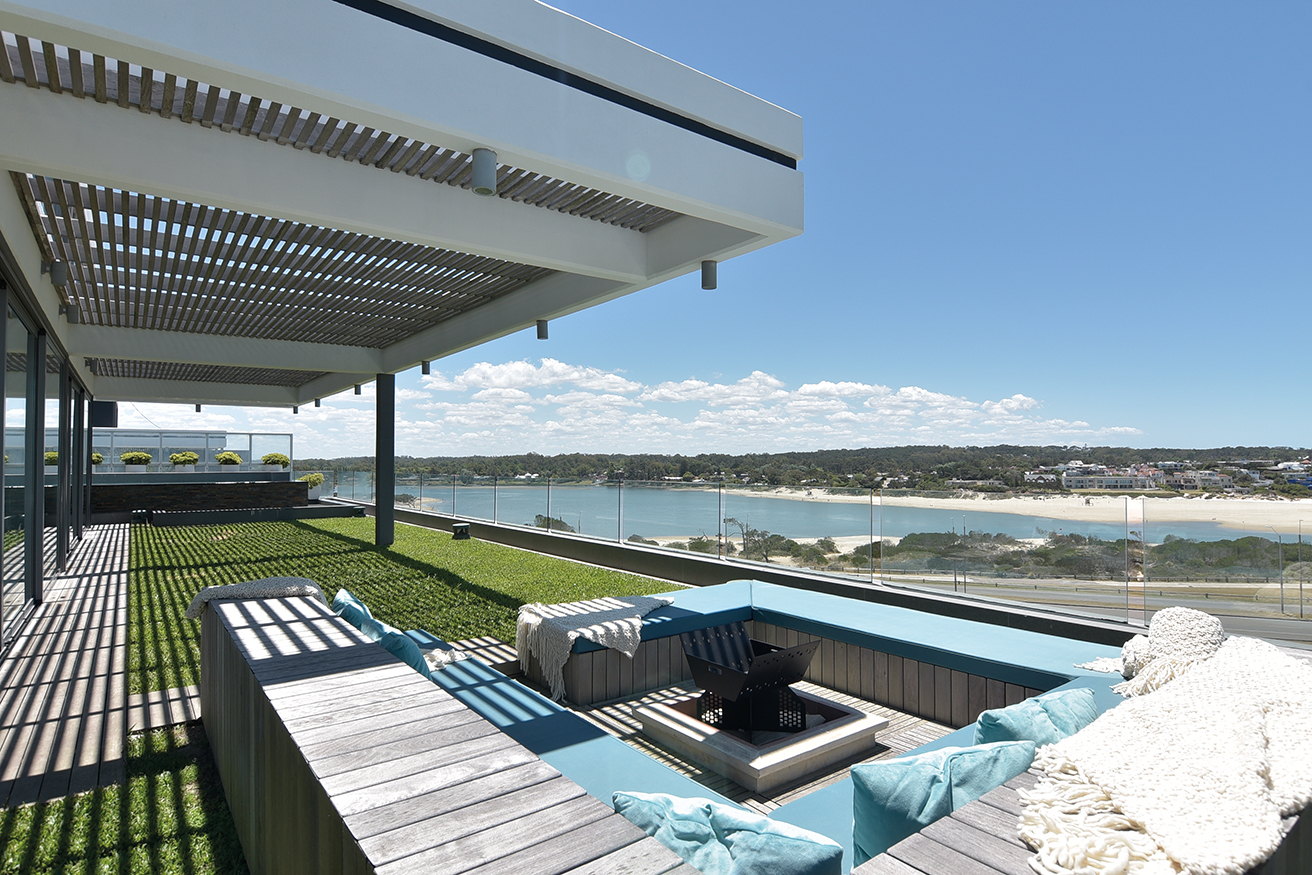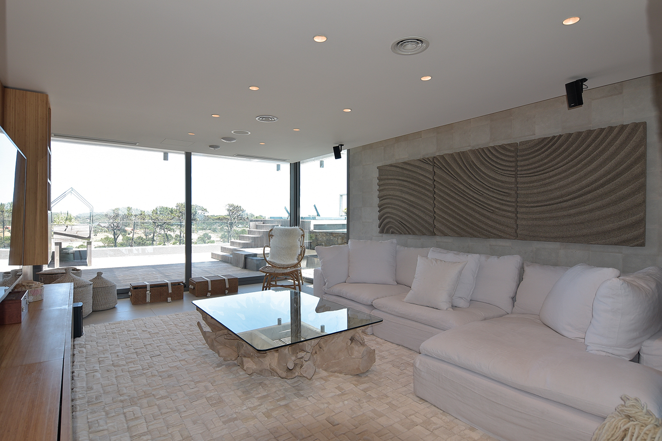 El dúplex ocupa 1250 metros cuadrados en una de las diez torres que conforman el complejo TIBURON TERRAZAS y que en el abanico que conforman sobre la costa ocupa el eje visual hacia vistas maravillosas que hacia un lado enseñan La Barra y hacia el otro la península. La planta baja, en realidad el piso cinco de la torre, contiene un gran living de catorce metros de largo por diez metros, que asumimos cumple una función social clara, un gran comedor con capacidad para 12 comensales, la cocina y la suite principales. En el contra frente, en la misma planta, se suceden los cuatro dormitorios, todos en suite.