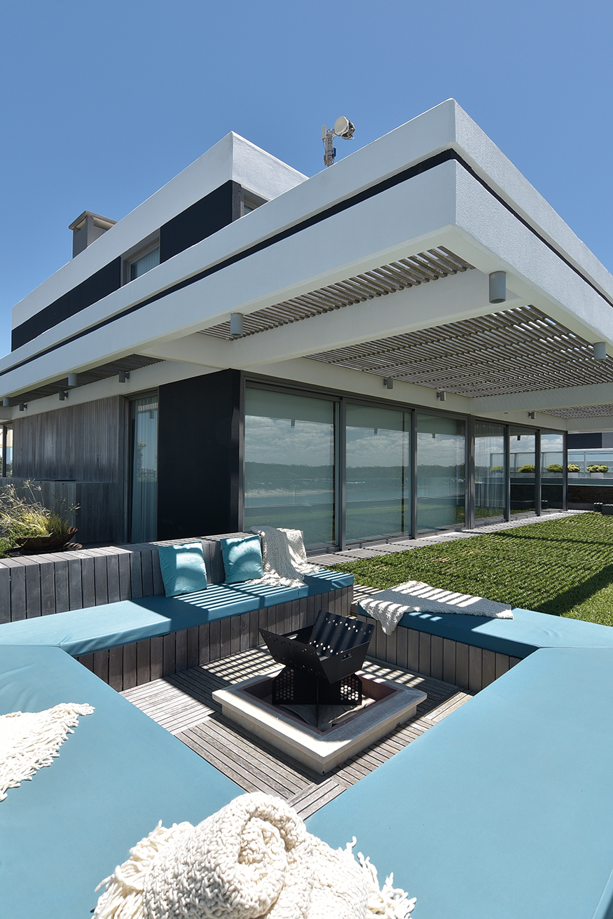 La planta alta alberga un gran estar, una sala de juegos, una cocina, también completa, destinada a la atención de la barbacoa y luego el espacio exterior que recorre todo el perímetro, con la barbacoa en el contra frente, la piscina en un lateral y un enorme y sorprendente jardín en el frente. Hasta aquí el repaso de la distribución espacial de este gran dúplex cuyas plantas fueron adaptadas a medida por los habitantes, que adquirieron la unidad en el pozo, esto es, cuando la torre estaba en construcción.