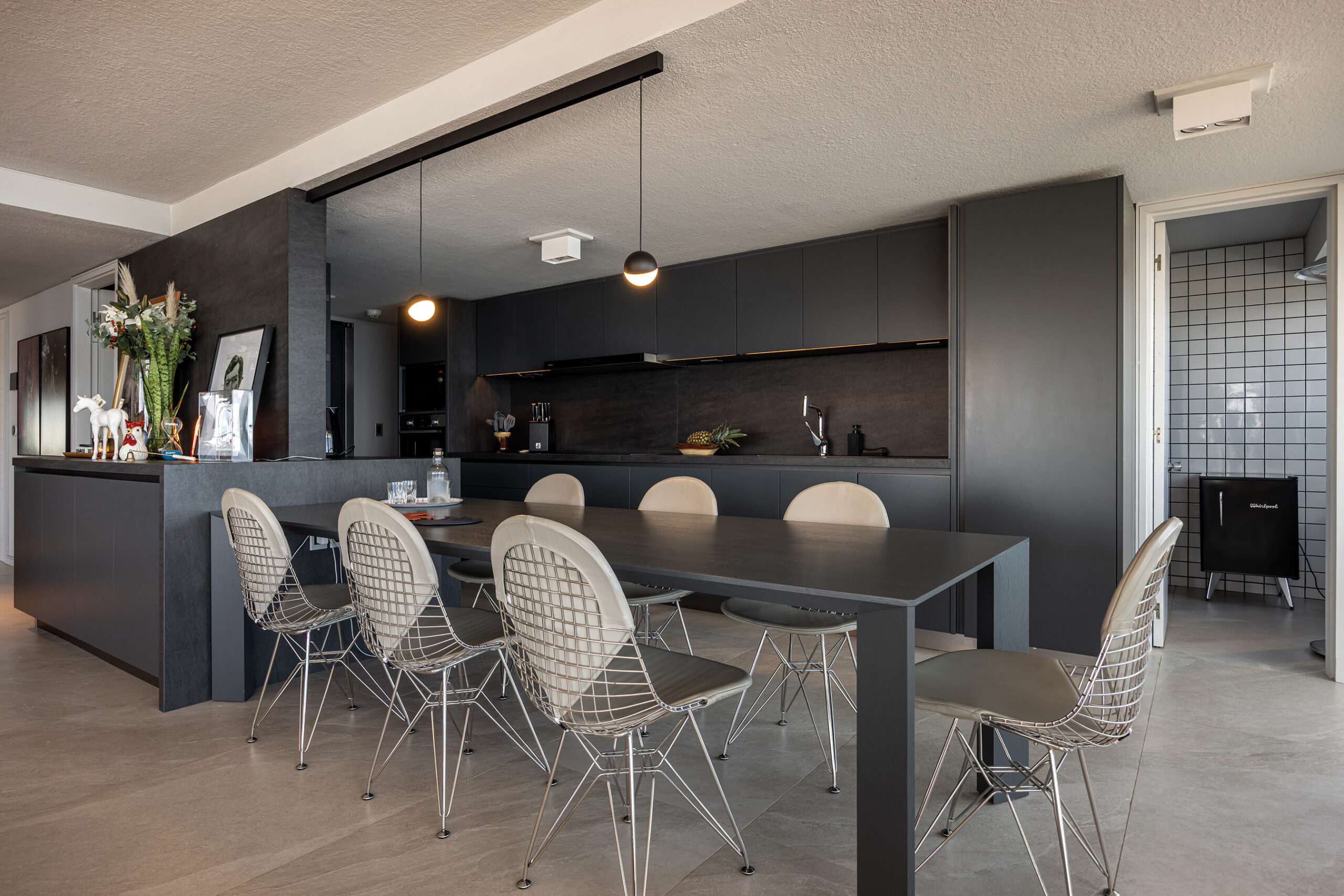 El rediseño interior estuvo guiado por una premisa clara: dotar al espacio de carácter sin restarle amplitud ni transparencia. El equipamiento seleccionado es completamente de autor, con piezas que establecen un diálogo entre la funcionalidad y el arte. Los propietarios, coleccionistas apasionados, han integrado su acervo artístico dentro del esquema espacial, convirtiendo cada ambiente en una galería de experiencias estéticas.
