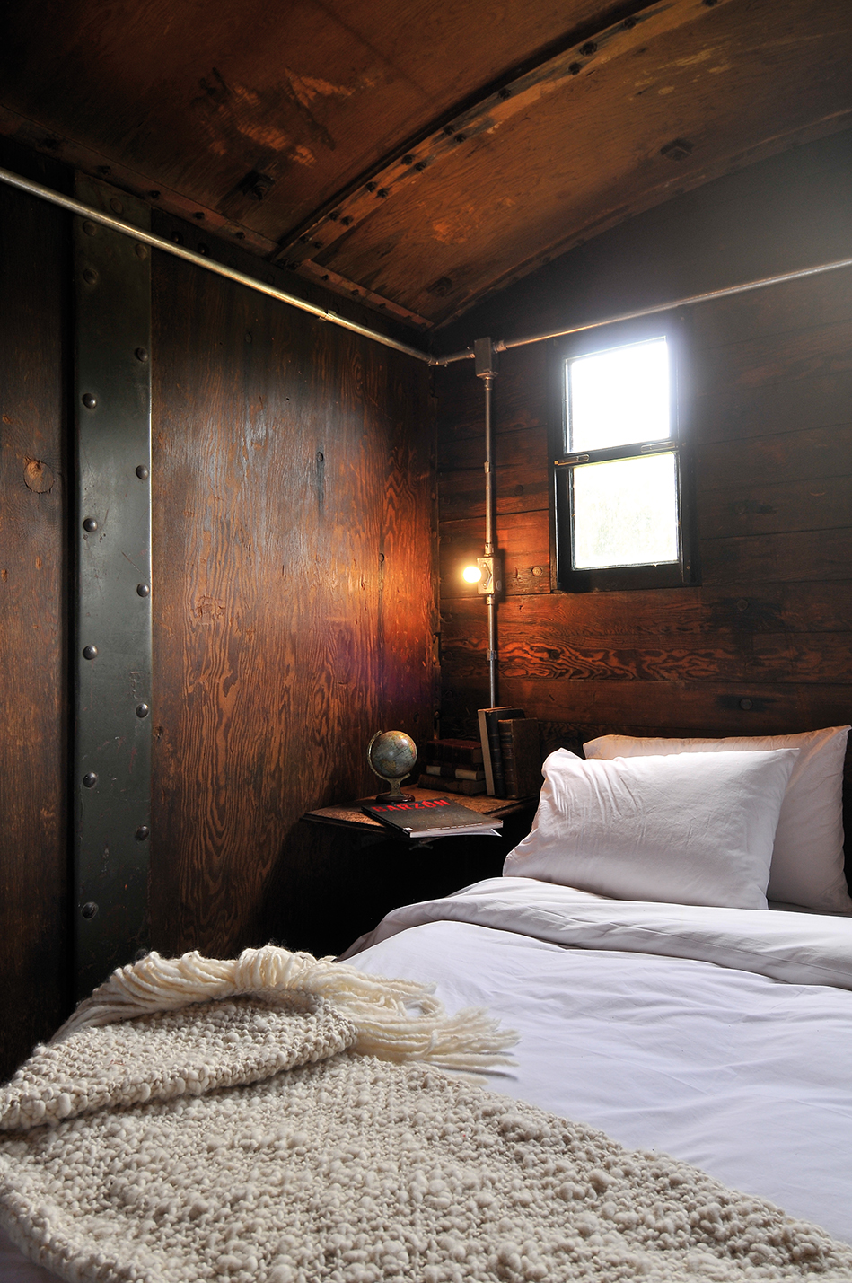 Luego de acceder a la plataforma principal a través de una paciente escalera, nos recibe un pequeño balcón, en donde resalta un antiguo sillón de estación, procedente de la querida empresa Onda. Al entrar al vagón, apreciamos que opera como un poco común loft, en donde la calidez y la simplicidad resuelven la situación con el clásico estilo industrial de Aarón Hojman. El espacio rectangular atrapa, y separa únicamente al baño del resto de las situaciones.