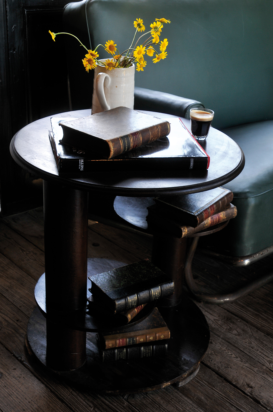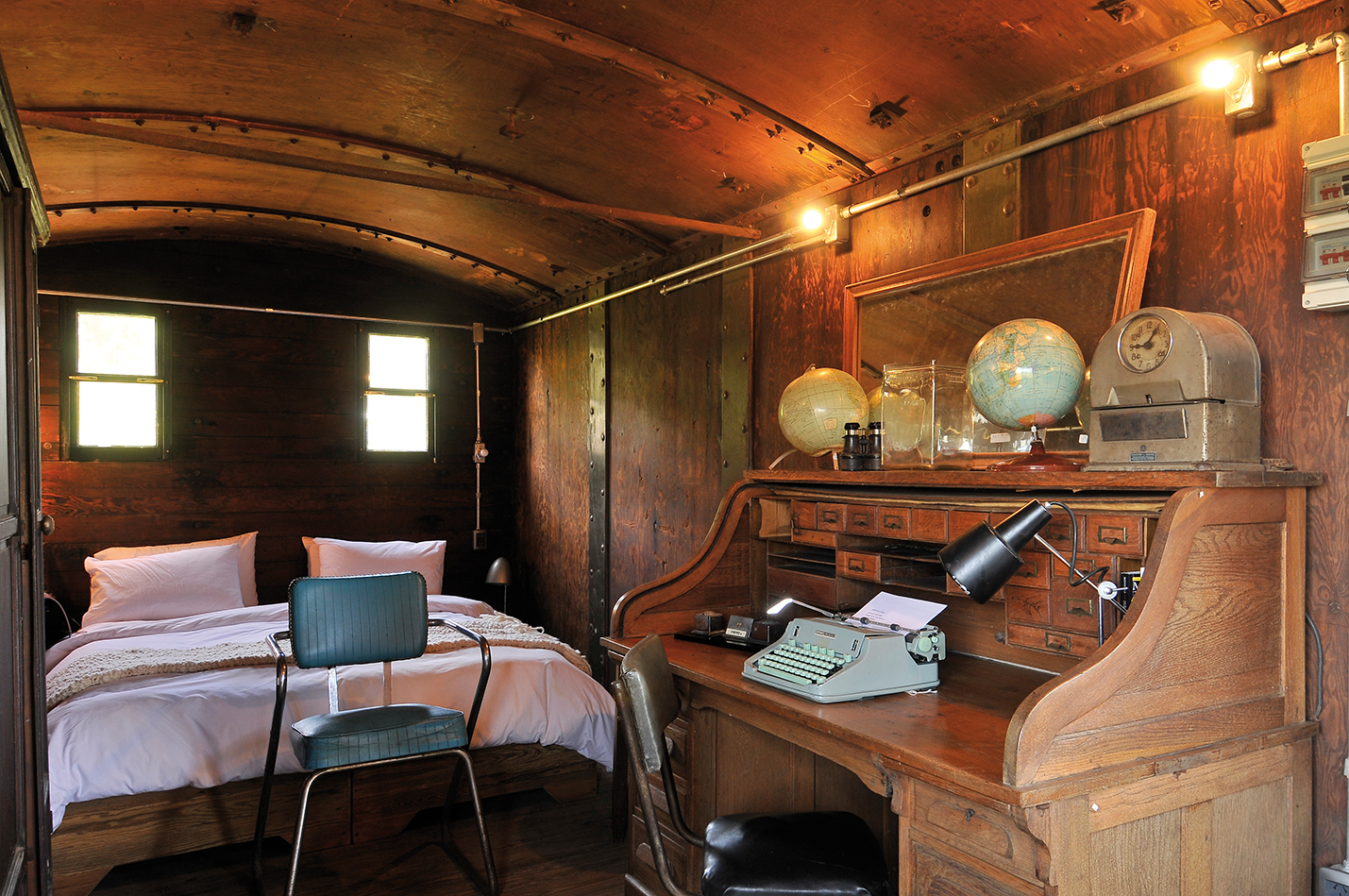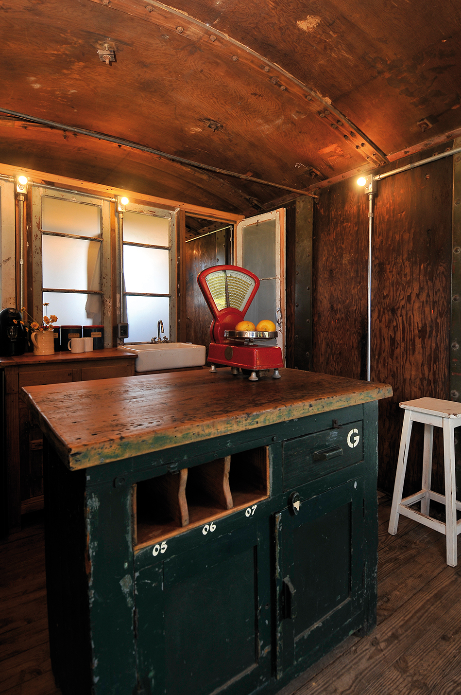 En el baño encontramos una antigua bañera inglesa —más chica de lo habitual — sutilmente integrada junto a un antiguo duchero proveniente de una de las primeras casas construidas en José Ignacio. Destaca en la situación una vieja mesita que sostiene la pileta, también antigua. Una mampara de madera separa al baño del comedor, generando un aire industrial típico de los años cuarenta. Inspirado en los cajones textiles que utilizaba la empresa Campomar en sus primeros años, Aarón diseño la mesada de la cocina; esta, además de generar y acompañar el clima industrial buscado, resuelve con gran elegancia las distintas necesidades actuales. La situación central del vagón ofrece dos grandes ventanales, cada uno con un cómodo balcón para disfrutar de la pacífica vista que ofrece La Barra rural. Grandes baúles, una mesa art decó de los años cuarenta y cómodos sillones alhajan al pequeño living, que resulta cálido y simple; es que para Hojman, la simpleza es el máximo de los lujos. Destaca un viejo fichero de oficina de los años cuarenta, proveniente de Casa Salvo, enfrentado a un noble escritorio de madera de cortina de los años treinta. En el extremo opuesto al vagón, la cama de pinotea y las mesas de luz diseñadas por Trading Post completan la escena de un vagón de carga dispuesto hoy con el fin de albergar y ofrecer una experiencia inédita a los posibles huéspedes que allí se hospeden. La iluminación mantiene el tinte industrial y la sencillez que abraza la sensibilidad de Hojman, que nos cuenta con orgullo que este verano 2018, su hijo Milos, espera recibir numerosos amigos y hospedarlos en el vagón.