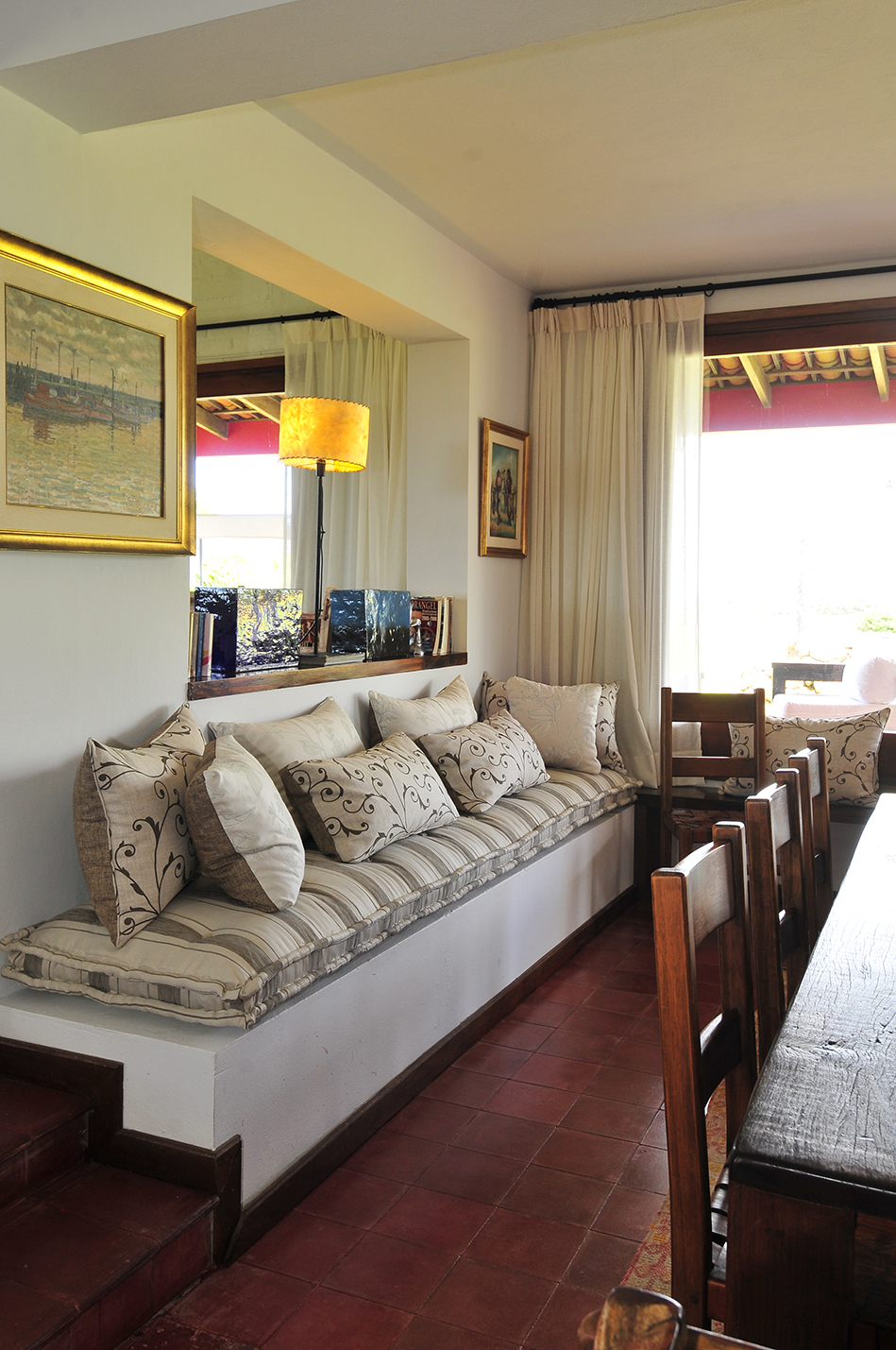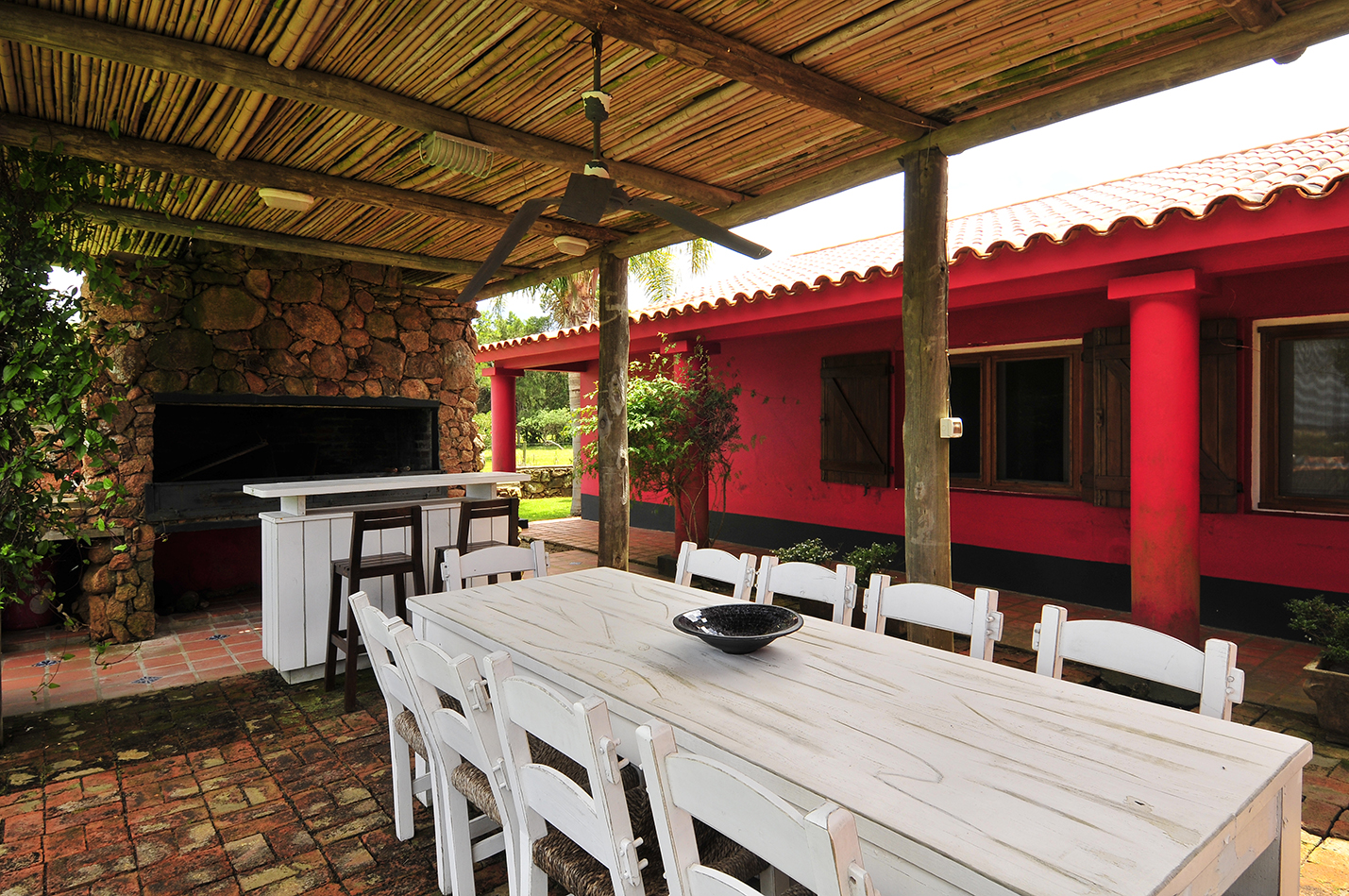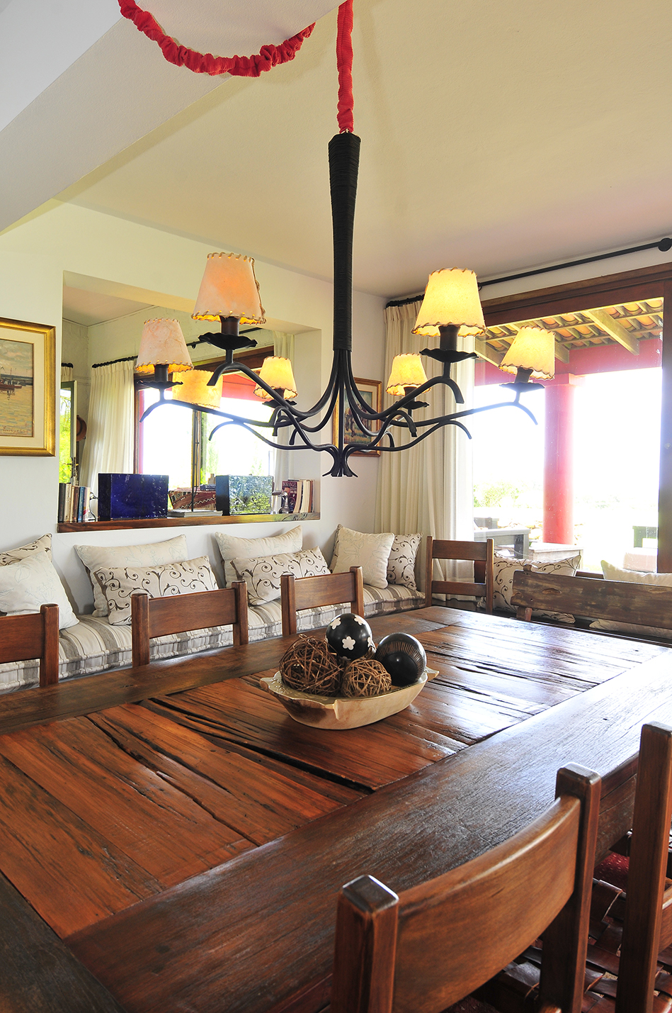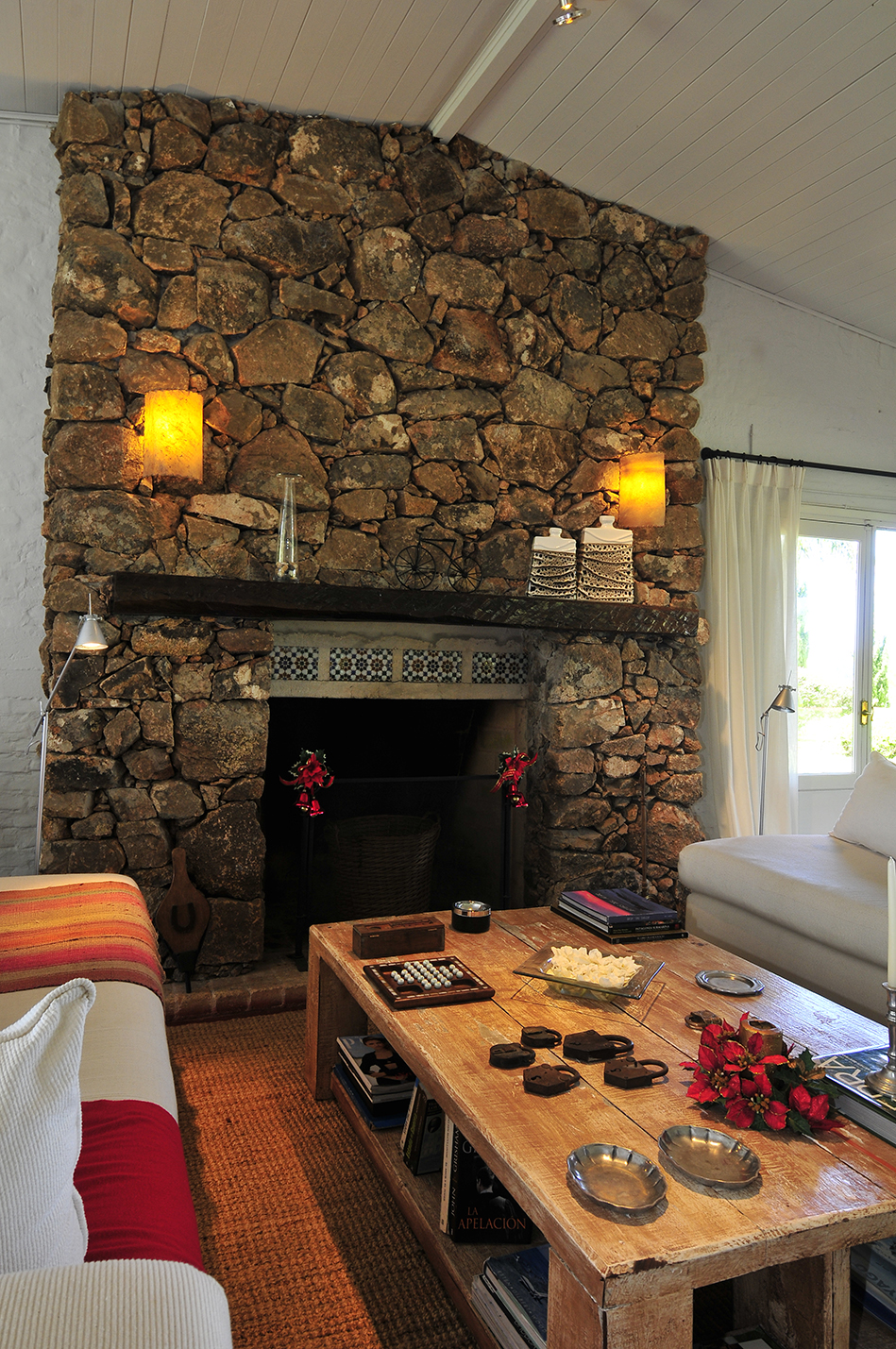 Desplegada en una sola planta, las grandes ventanas que identifican cada ambiente de la casa se roban todas las miradas. El piso de baldosas de hormigón rojas proporciona cierta rusticidad fina y delicada que acompaña por completo otros elementos tradicionales empleados, como la madera y la piedra, logrando ambientes acogedores que se integran totalmente al entorno. El color blanco que predomina en paredes y sofás contrasta con coloridas mantas de lana que invitan al descanso. El área social amplia y abierta es enmarcada por una galería que la recorre en toda la fachada principal, donde se dejan ver el jardín y la piscina. El living se distribuye en dos sectores, uno de ellos, podría decirse el principal, enmarcado por un gran hogar de piedra que contiene a sus lados los sillones, y una mesa de centro de madera rústica entre medio. El sector siguiente es algo más íntimo, pero abierto al espacio, se conecta de forma directa con el jardín a través de sus amplios ventanales. El comedor, diferenciado del living por encontrarse en otro nivel, contiene una mesa de madera para diez comensales, de aire campestre, y en las cabeceras, bancos con respaldo para aprovechar mejor el lugar. Una araña con brazos en hierro negro y con seis tulipas cada uno acompaña el ambiente de rusticidad creado. A un lado más alejado de la mesa, una torre de piedra contiene el gran hogar. Unos asientos de obra con colchones ofician como sitio de reunión para antes o después de acercarse a la mesa.