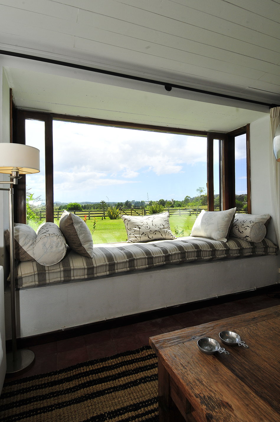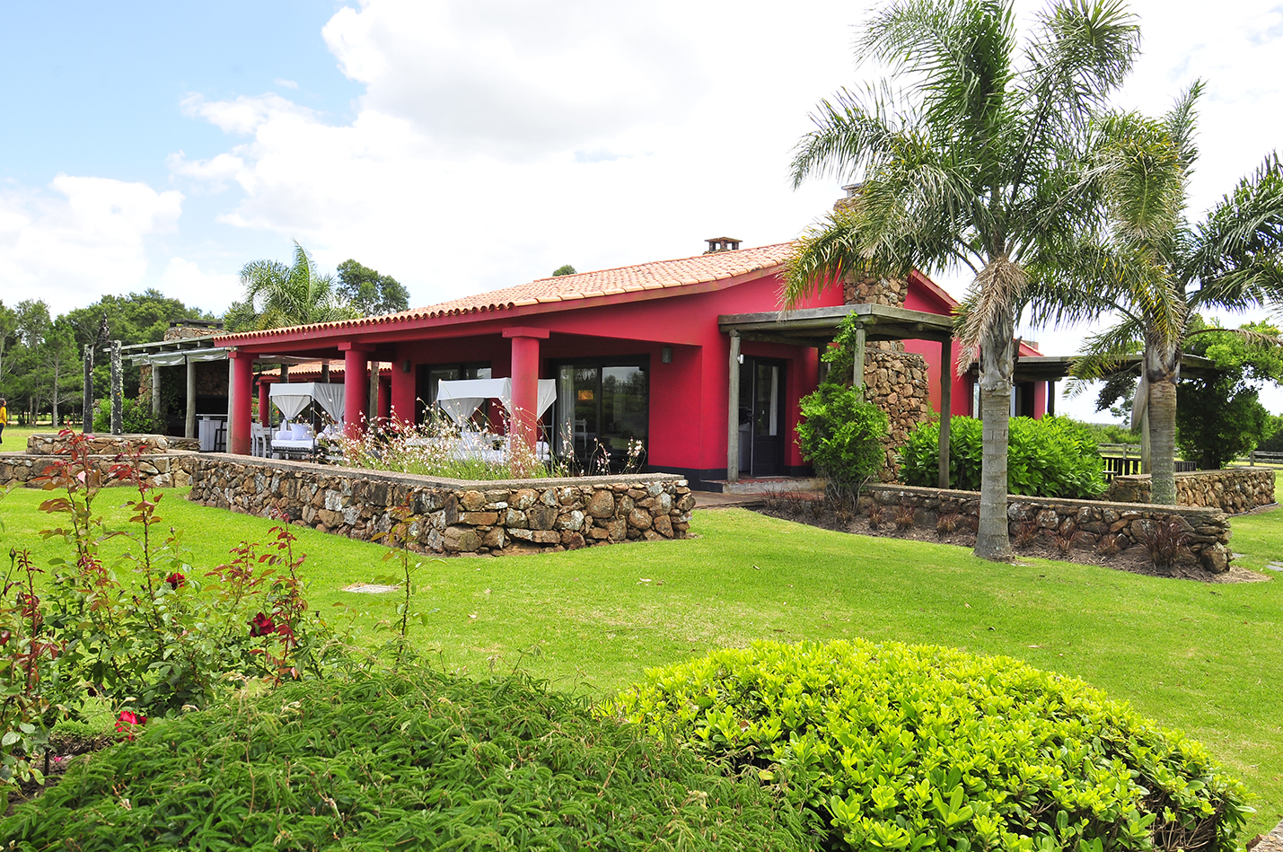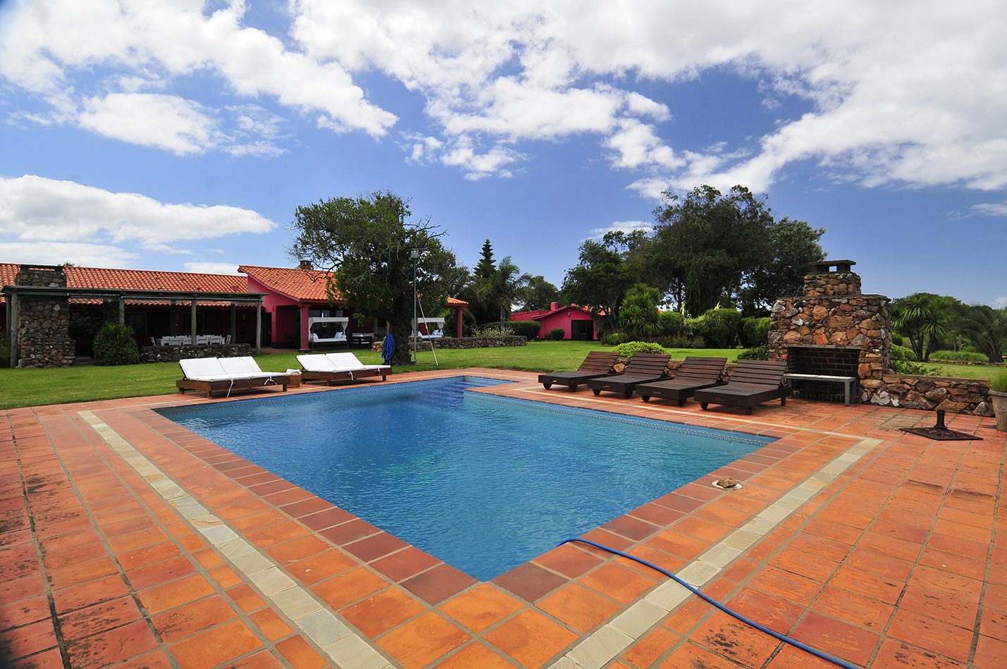 Desplegada en una sola planta, las grandes ventanas que identifican cada ambiente de la casa se roban todas las miradas. El piso de baldosas de hormigón rojas proporciona cierta rusticidad fina y delicada que acompaña por completo otros elementos tradicionales empleados, como la madera y la piedra, logrando ambientes acogedores que se integran totalmente al entorno. El color blanco que predomina en paredes y sofás contrasta con coloridas mantas de lana que invitan al descanso. El área social amplia y abierta es enmarcada por una galería que la recorre en toda la fachada principal, donde se dejan ver el jardín y la piscina. El living se distribuye en dos sectores, uno de ellos, podría decirse el principal, enmarcado por un gran hogar de piedra que contiene a sus lados los sillones, y una mesa de centro de madera rústica entre medio. El sector siguiente es algo más íntimo, pero abierto al espacio, se conecta de forma directa con el jardín a través de sus amplios ventanales. El comedor, diferenciado del living por encontrarse en otro nivel, contiene una mesa de madera para diez comensales, de aire campestre, y en las cabeceras, bancos con respaldo para aprovechar mejor el lugar. Una araña con brazos en hierro negro y con seis tulipas cada uno acompaña el ambiente de rusticidad creado. A un lado más alejado de la mesa, una torre de piedra contiene el gran hogar. Unos asientos de obra con colchones ofician como sitio de reunión para antes o después de acercarse a la mesa.