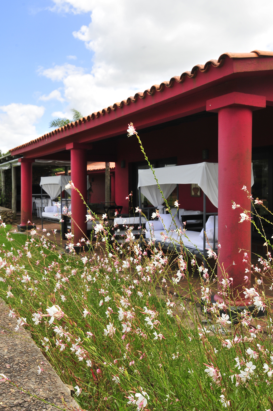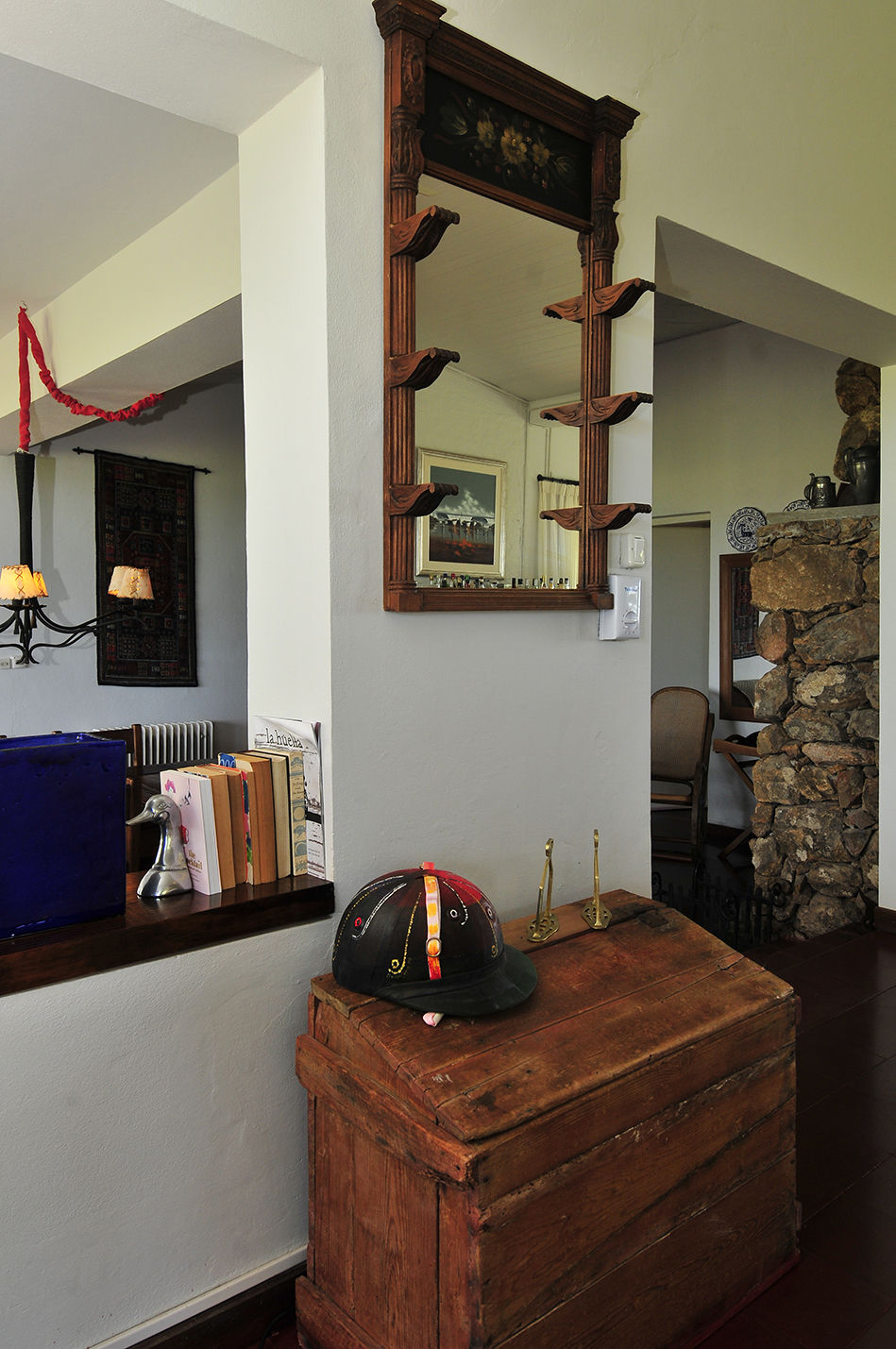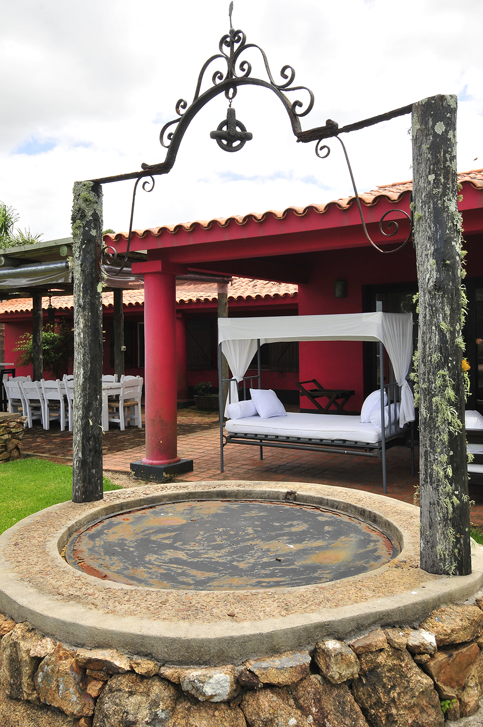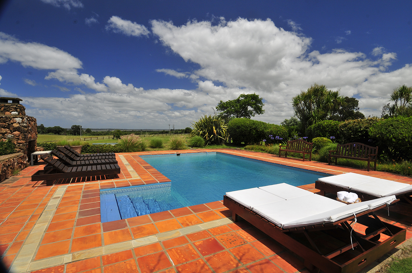 Desplegada en una sola planta, las grandes ventanas que identifican cada ambiente de la casa se roban todas las miradas. El piso de baldosas de hormigón rojas proporciona cierta rusticidad fina y delicada que acompaña por completo otros elementos tradicionales empleados, como la madera y la piedra, logrando ambientes acogedores que se integran totalmente al entorno. El color blanco que predomina en paredes y sofás contrasta con coloridas mantas de lana que invitan al descanso. El área social amplia y abierta es enmarcada por una galería que la recorre en toda la fachada principal, donde se dejan ver el jardín y la piscina. El living se distribuye en dos sectores, uno de ellos, podría decirse el principal, enmarcado por un gran hogar de piedra que contiene a sus lados los sillones, y una mesa de centro de madera rústica entre medio. El sector siguiente es algo más íntimo, pero abierto al espacio, se conecta de forma directa con el jardín a través de sus amplios ventanales. El comedor, diferenciado del living por encontrarse en otro nivel, contiene una mesa de madera para diez comensales, de aire campestre, y en las cabeceras, bancos con respaldo para aprovechar mejor el lugar. Una araña con brazos en hierro negro y con seis tulipas cada uno acompaña el ambiente de rusticidad creado. A un lado más alejado de la mesa, una torre de piedra contiene el gran hogar. Unos asientos de obra con colchones ofician como sitio de reunión para antes o después de acercarse a la mesa.