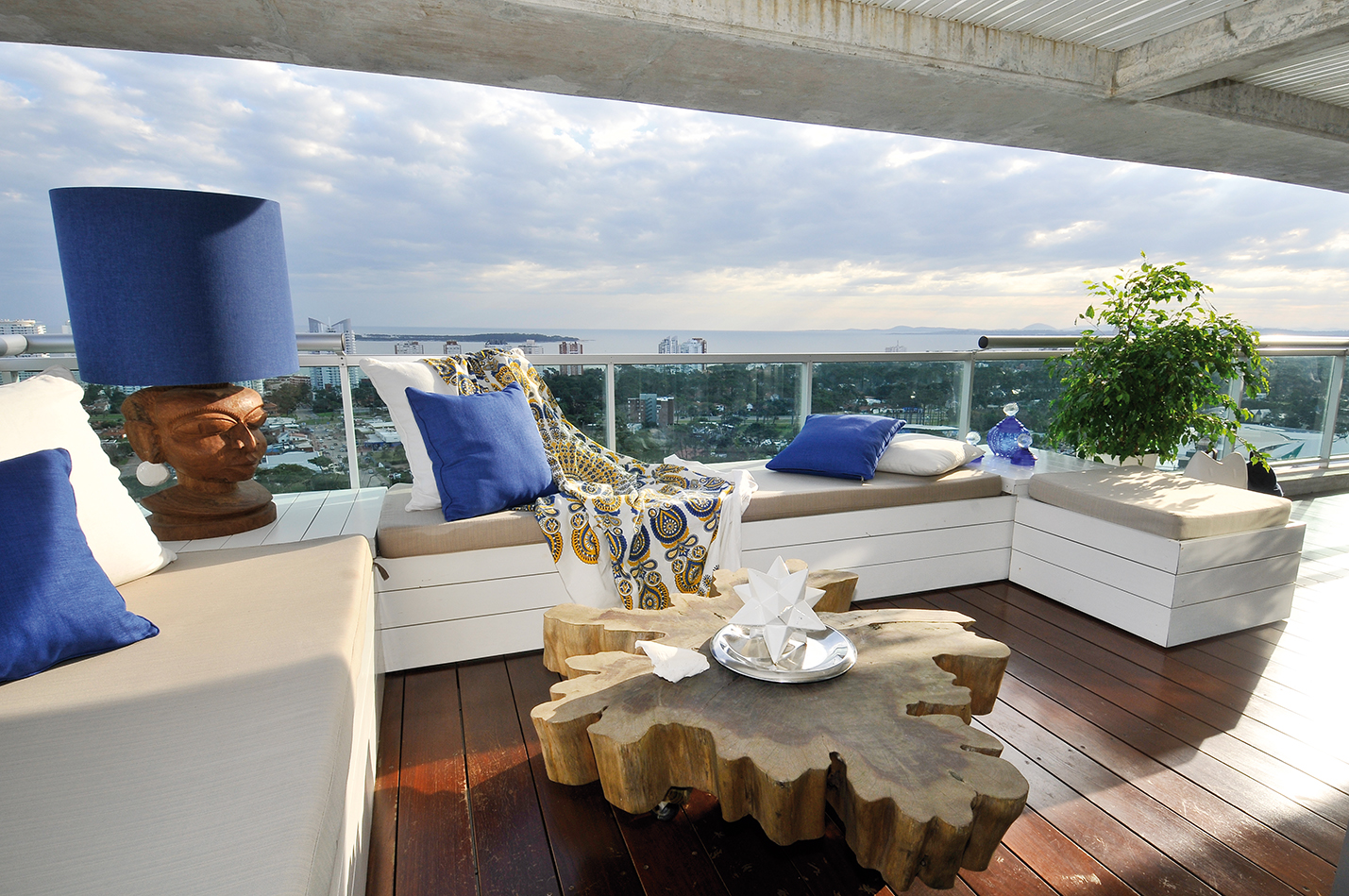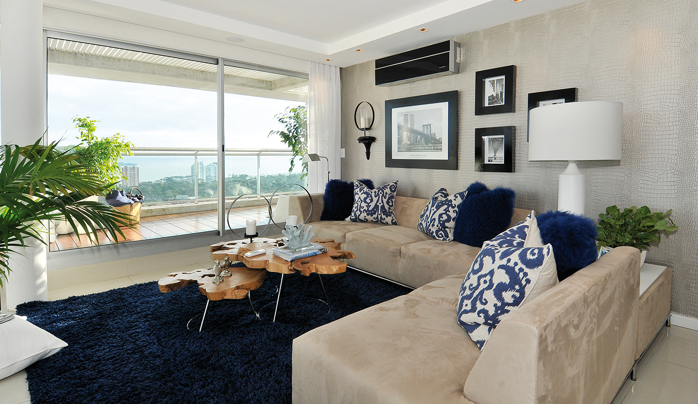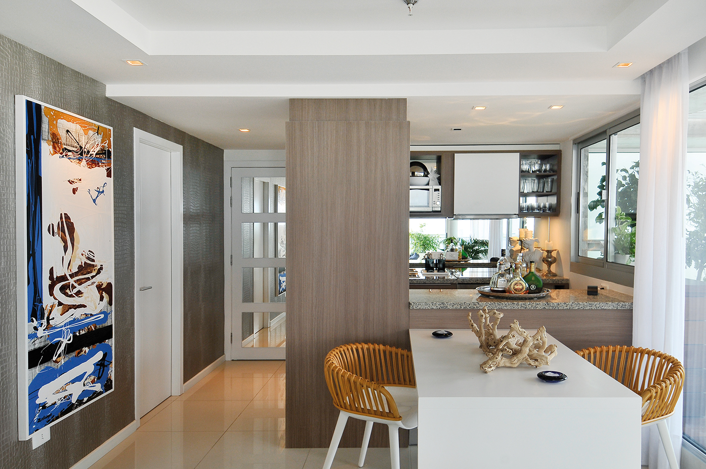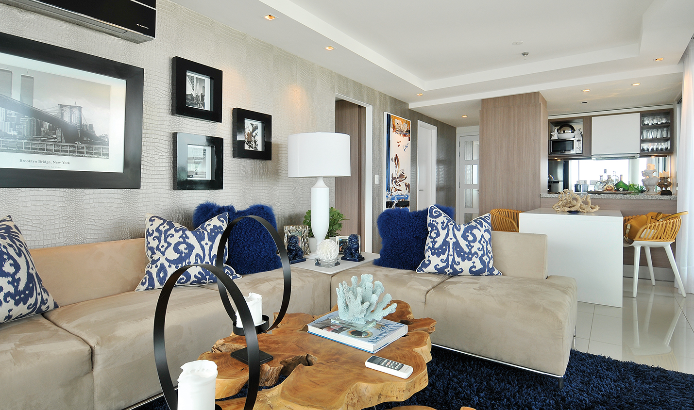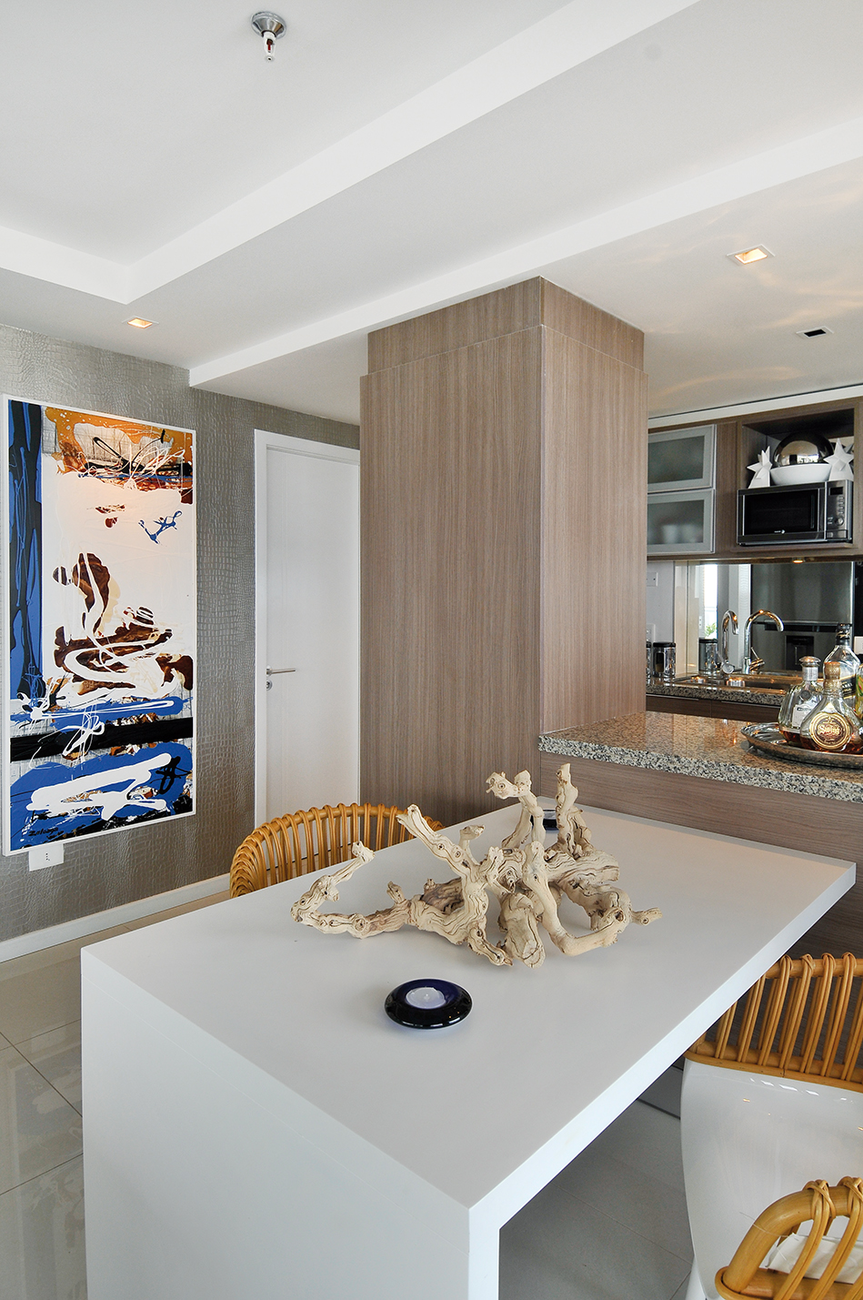 Un espacio de cocina semi integrada que presenta una delicada barra neutra tanto por sus líneas como por sus colores. Sobre la misma un elemento decorativo que hace referencia al mundo marítimo. Un sofá rinconero promueve la apreciación de la gran vista del apartamento. Sus detalles en tonos de azul realzan su entorno náutico. En la terraza se diseño una cómoda rinconera que permite acomodar hasta 10 personas, es así que el habitante siempre aprovecha este espacio para recibir amigos y disfrutar de las calurosas noches de verano.