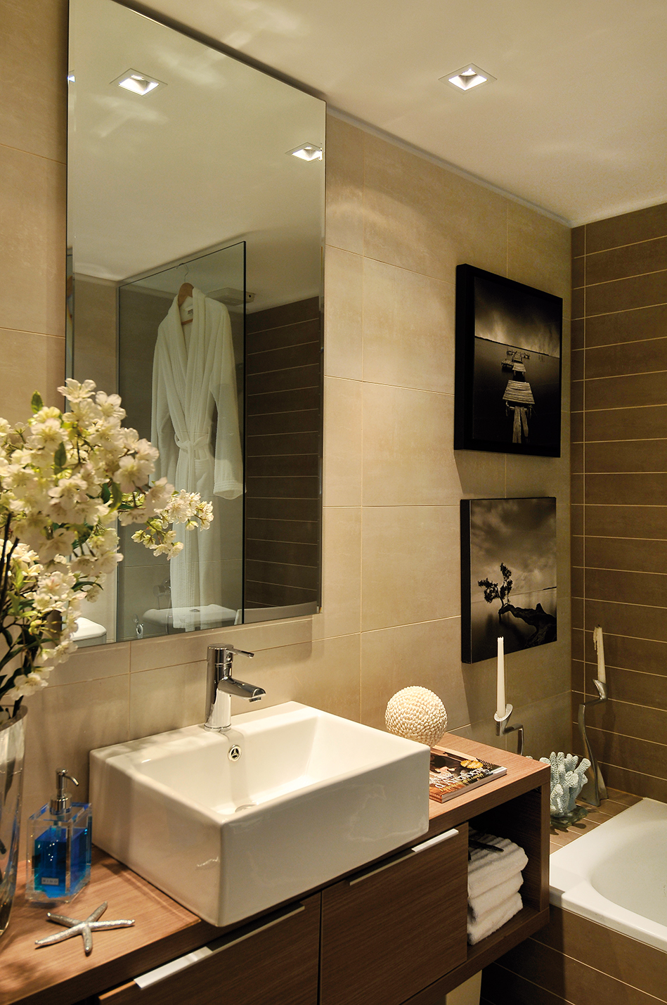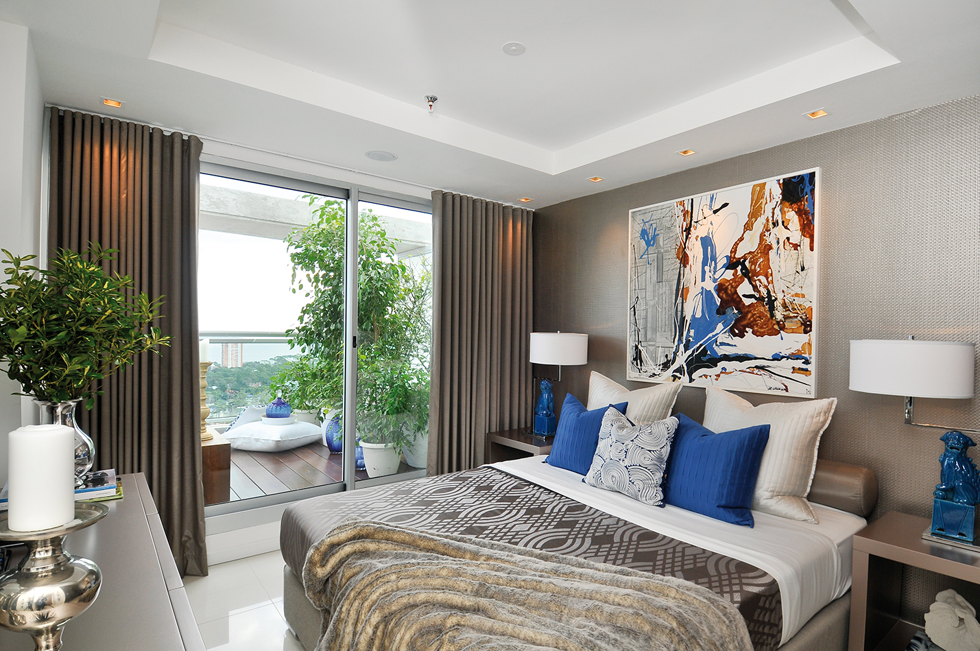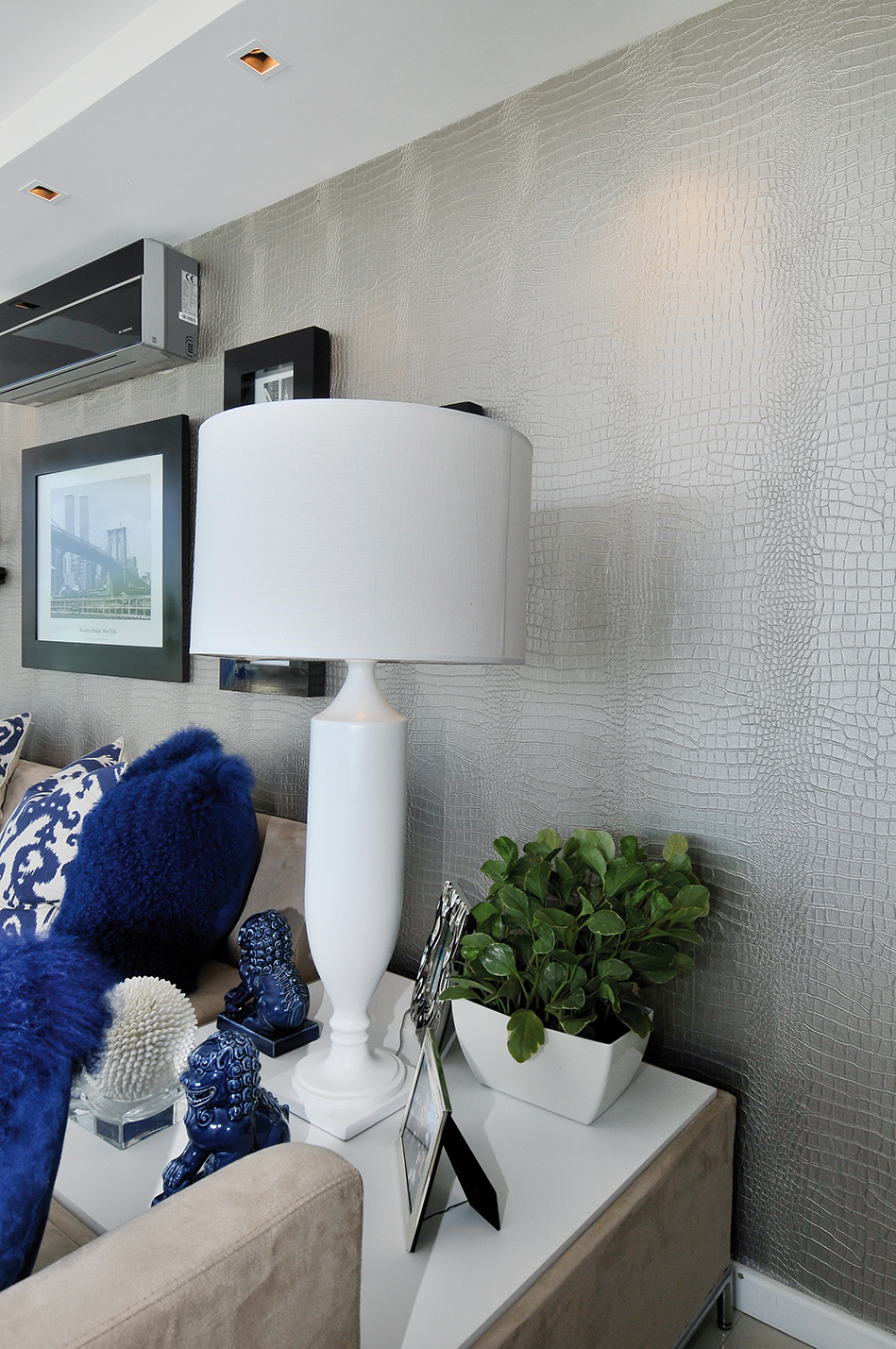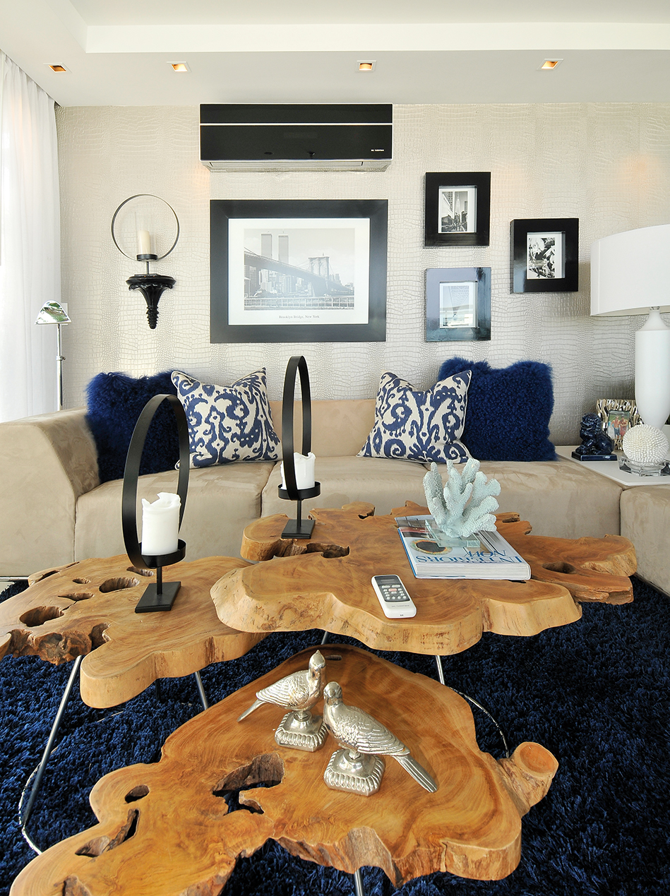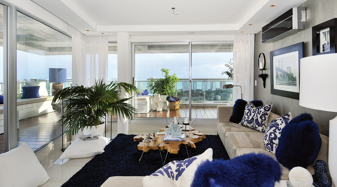 Un espacio de cocina semi integrada que presenta una delicada barra neutra tanto por sus líneas como por sus colores. Sobre la misma un elemento decorativo que hace referencia al mundo marítimo. Un sofá rinconero promueve la apreciación de la gran vista del apartamento. Sus detalles en tonos de azul realzan su entorno náutico. En la terraza se diseño una cómoda rinconera que permite acomodar hasta 10 personas, es así que el habitante siempre aprovecha este espacio para recibir amigos y disfrutar de las calurosas noches de verano.