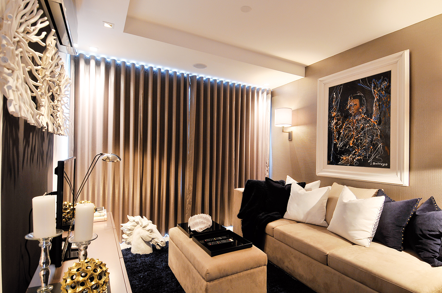 El apartamento cuenta con dos dormitorios, pero solamente uno de ellos está ambientado de esta manera. En el dormitorio secundario, Martínez diseño un acogedor estar, con colores cálidos que permiten un segundo espacio de reunión, y a su vez, puede funcionar como dormitorio complementario.